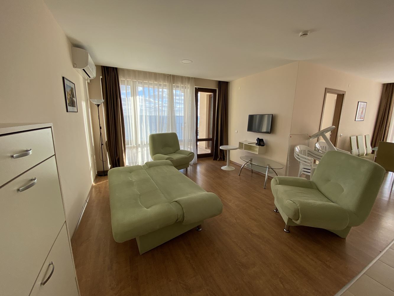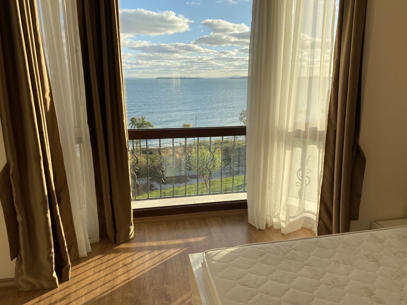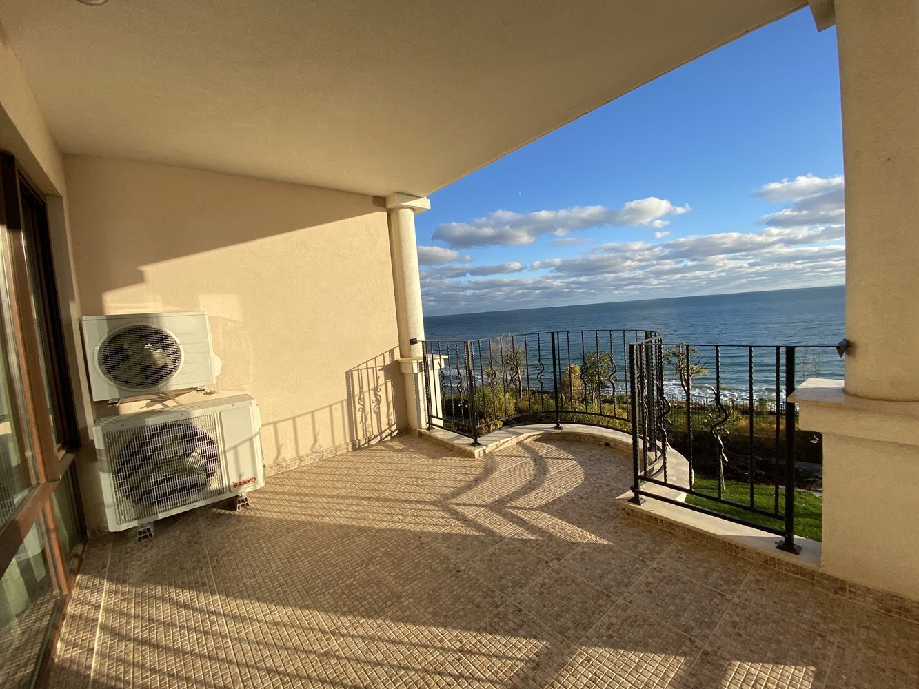 Panoramic spacious and bright four-room apartment in the first-class residential complex on the sea front. The complex is located in the beautiful area in the southern part of the resort Sveti Vlas 50 meters away from the luxurious sandy beach. In the territory of the complex there is an outdoor swimming pool for adults, children's pool, fitness room, massage room, restaurant, playgrounds, recreation area, parking and other amenities. There is a year-round security, and the area will surprise you with its park landscape. The housing area is 150.41 m2 and is located on the second floor. Fully furnished apartment in excellent condition ready for occupancy.