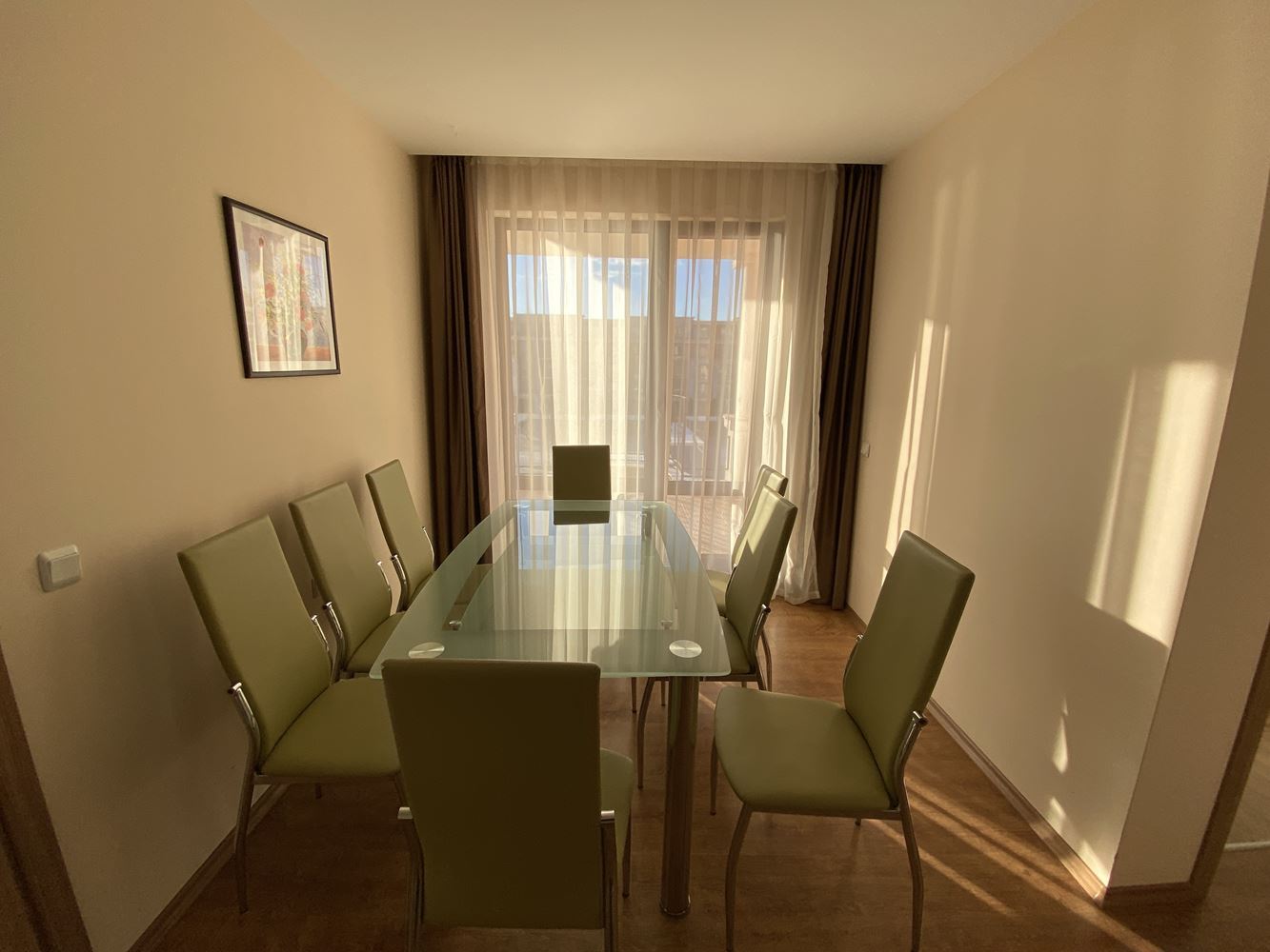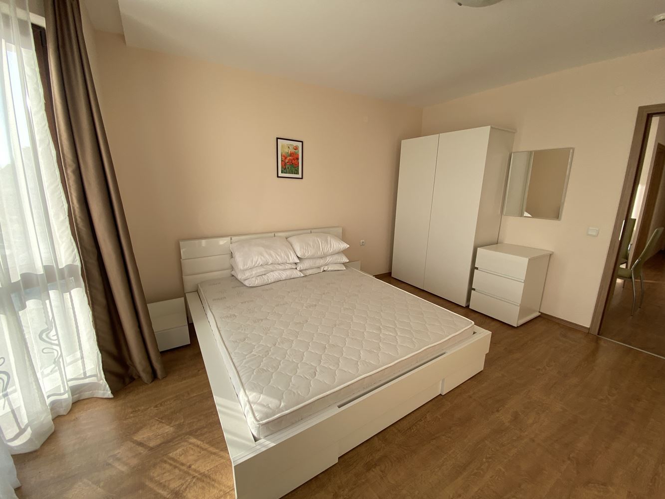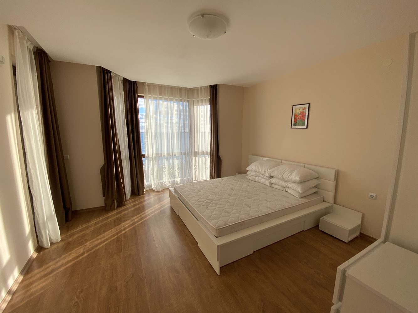 Panoramic spacious and bright four-room apartment in the first-class residential complex on the sea front. The complex is located in the beautiful area in the southern part of the resort Sveti Vlas 50 meters away from the luxurious sandy beach. In the territory of the complex there is an outdoor swimming pool for adults, children's pool, fitness room, massage room, restaurant, playgrounds, recreation area, parking and other amenities. There is a year-round security, and the area will surprise you with its park landscape. The housing area is 150.41 m2 and is located on the second floor. Fully furnished apartment in excellent condition ready for occupancy.
