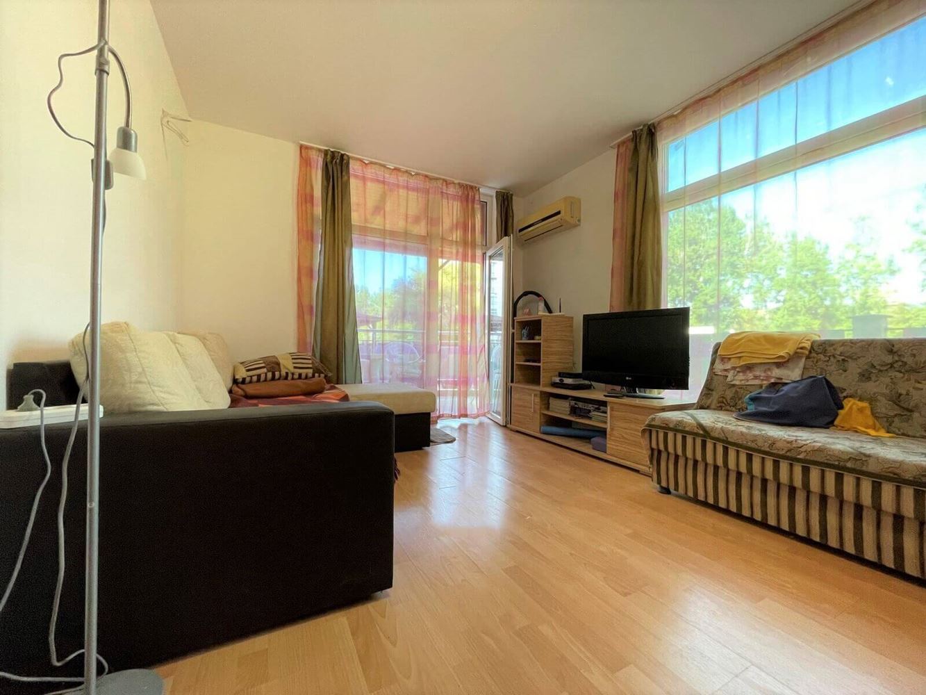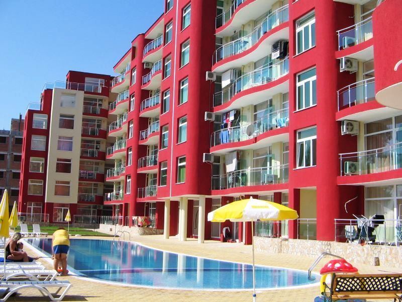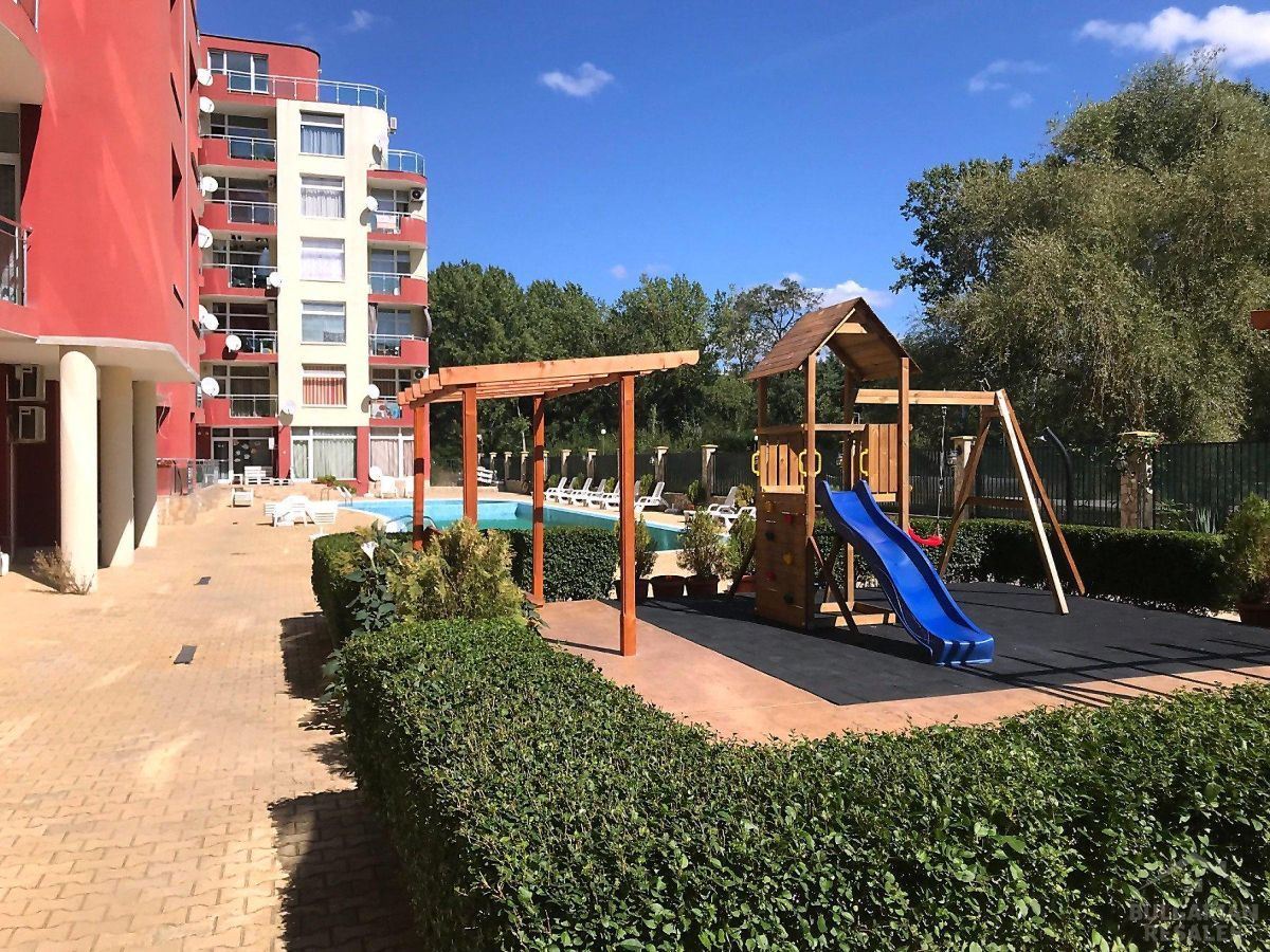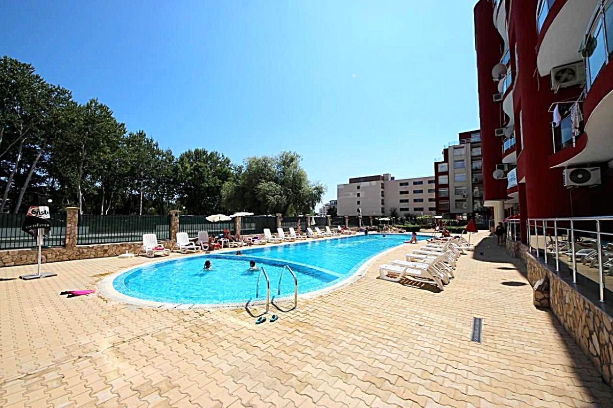 Interesting spacious one bedroom flat in Sunny Beach resort. Located on the low ground floor, overlooking the swimming pool. The area of the flat is 65 m2. It consists of entrance hall, living room with kitchenette, separate bedroom, bathroom with WC and balcony. The apartment is for sale with furniture, equipment and white goods. The lovely apartment complex is located in a quiet area in the central part of Sunny Beach, five minutes walk from the sea and the beach. All necessary infrastructure, shops, supermarkets, restaurants, cafes, bars, bus stops and other amenities are within walking distance. The development is home to local residents all year round. The complex infrastructure includes swimming pool, landscaped area, recreational areas with sun loungers and umbrellas, playground, parking.