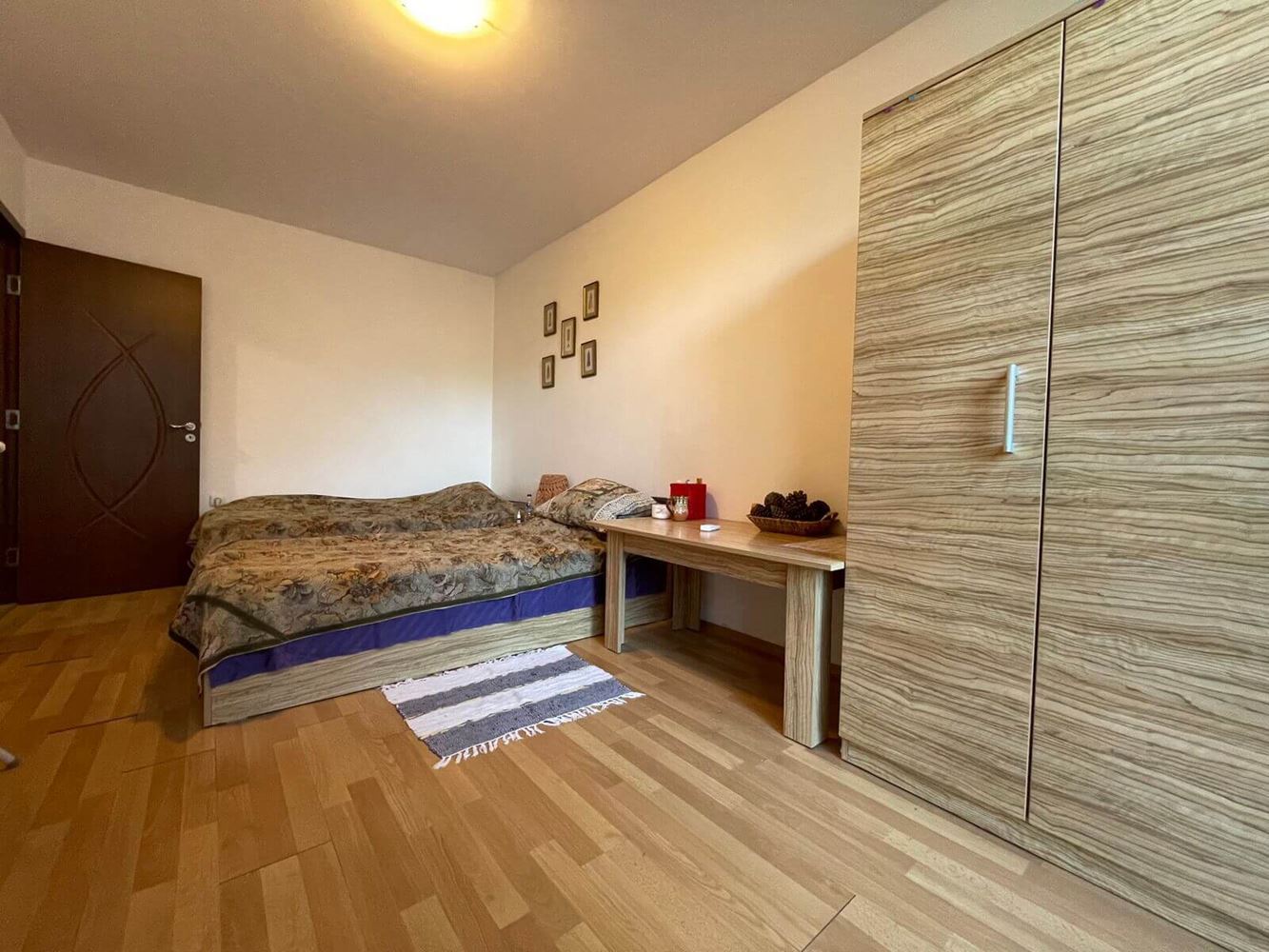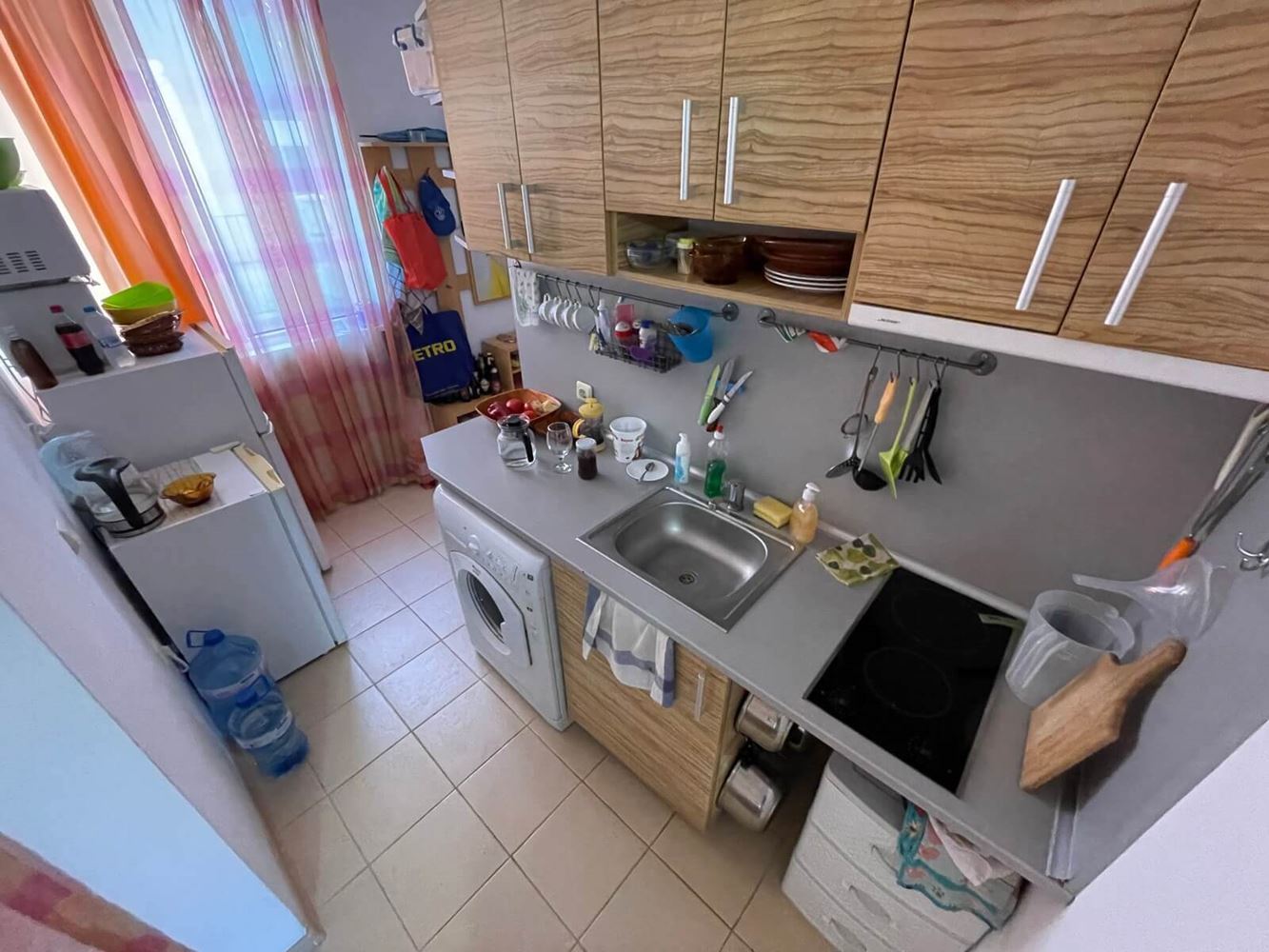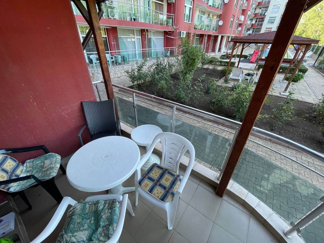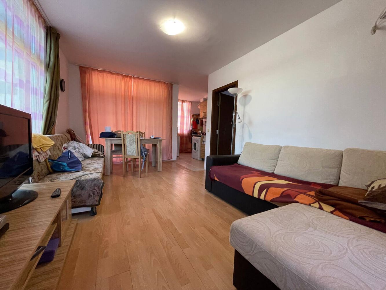Interesting spacious one bedroom flat in Sunny Beach resort. Located on the low ground floor, overlooking the swimming pool. The area of the flat is 65 m2. It consists of entrance hall, living room with kitchenette, separate bedroom, bathroom with WC and balcony. The apartment is for sale with furniture, equipment and white goods. The lovely apartment complex is located in a quiet area in the central part of Sunny Beach, five minutes walk from the sea and the beach. All necessary infrastructure, shops, supermarkets, restaurants, cafes, bars, bus stops and other amenities are within walking distance. The development is home to local residents all year round. The complex infrastructure includes swimming pool, landscaped area, recreational areas with sun loungers and umbrellas, playground, parking.