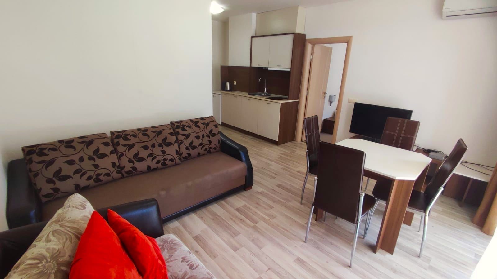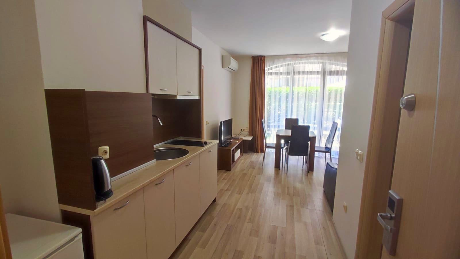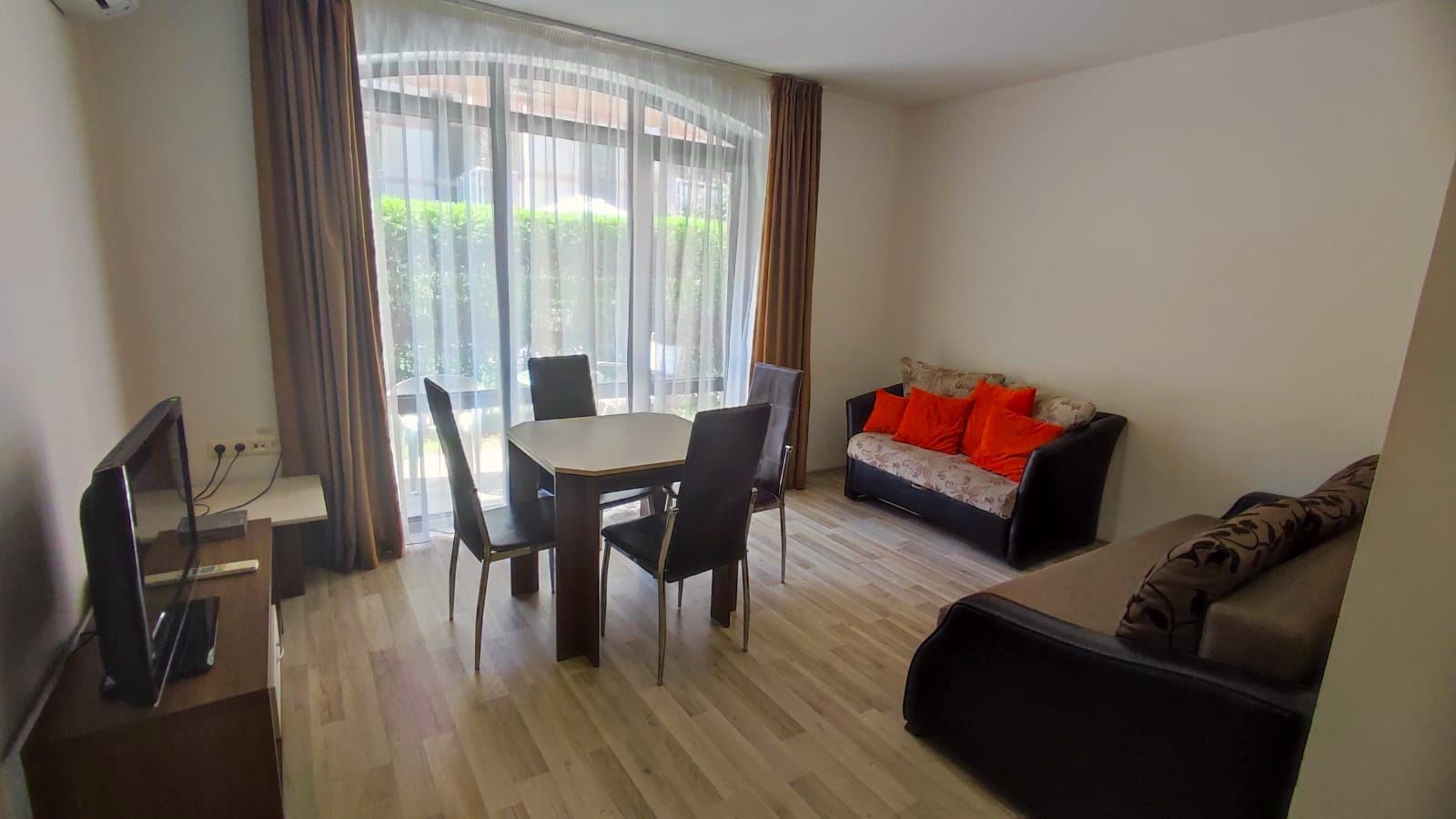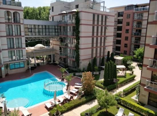One-bedroom flat in a complex located in its own park in the resort of Sunny Beach. The complex with modern architecture has an underground parking, swimming pools for adults and children, a hotel reception with lobby bar, 4 shops, restaurant, fitness center, own laundry room with drying room with ironing room, SPA centre, which includes a steam bath, Finnish sauna, jacuzzi, massage rooms, rest rooms. The flat has an area of 75 m2 + a 20 m2 yard which is not included in the total area of the flat. It consists of an entrance hall, living room, one bedroom, bathroom and a terrace. The property is sold furnished and with white goods.