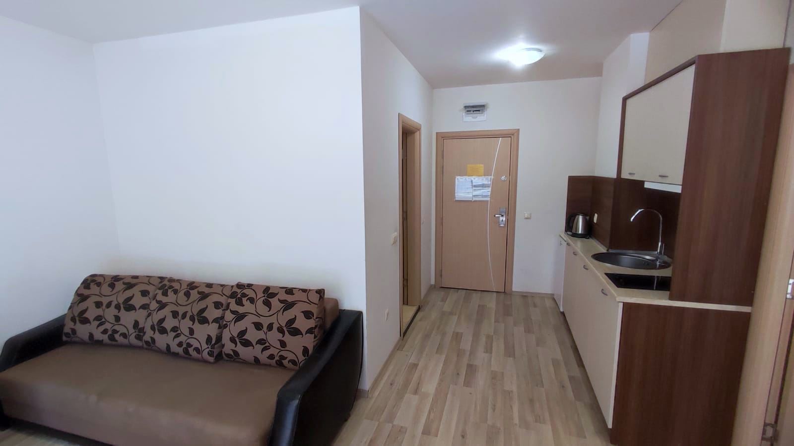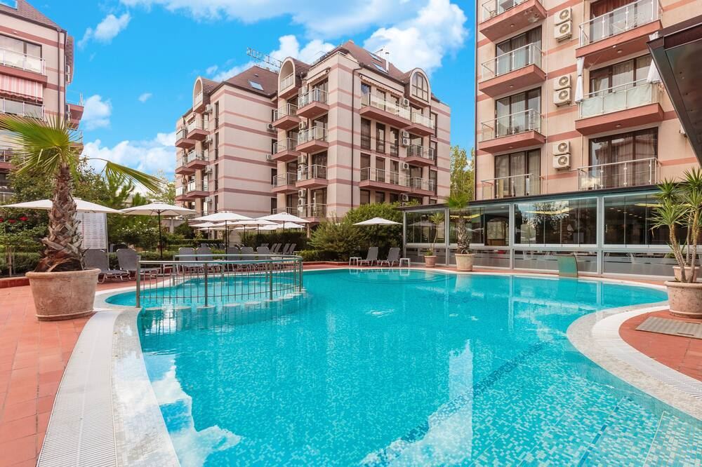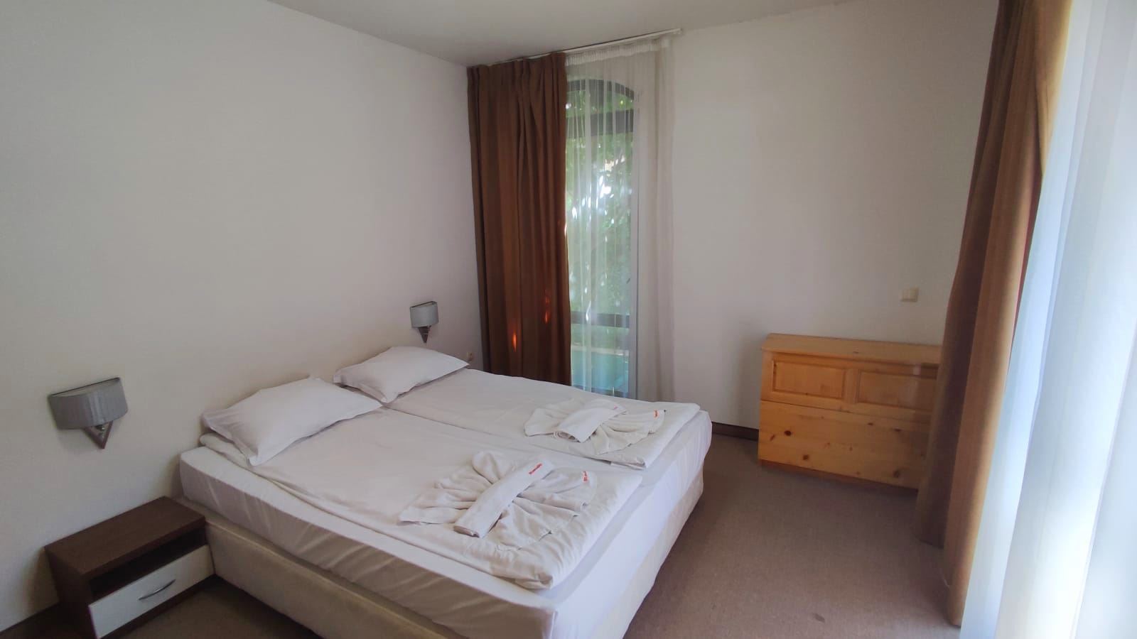 One-bedroom flat in a complex located in its own park in the resort of Sunny Beach. The complex with modern architecture has an underground parking, swimming pools for adults and children, a hotel reception with lobby bar, 4 shops, restaurant, fitness center, own laundry room with drying room with ironing room, SPA centre, which includes a steam bath, Finnish sauna, jacuzzi, massage rooms, rest rooms. The flat has an area of 75 m2 + a 20 m2 yard which is not included in the total area of the flat. It consists of an entrance hall, living room, one bedroom, bathroom and a terrace. The property is sold furnished and with white goods.