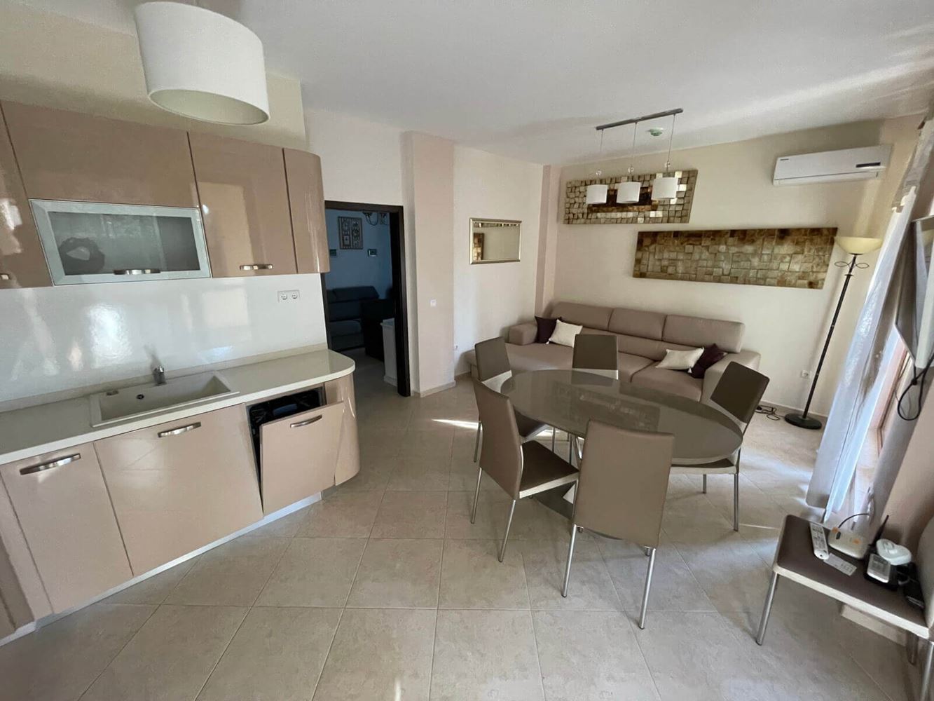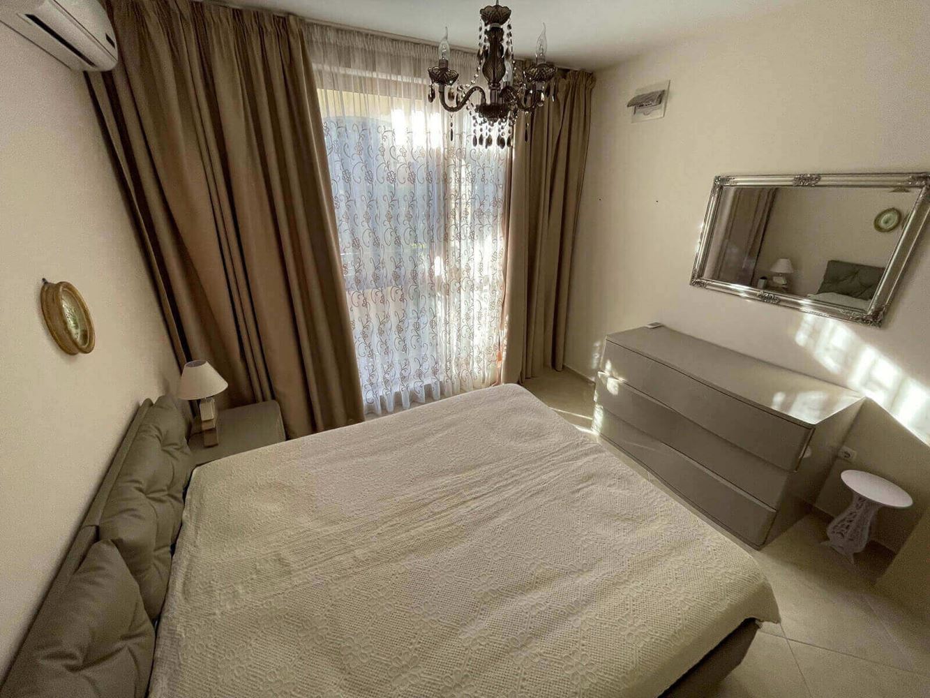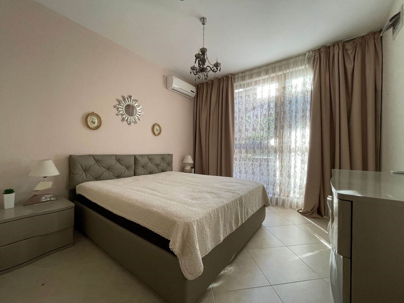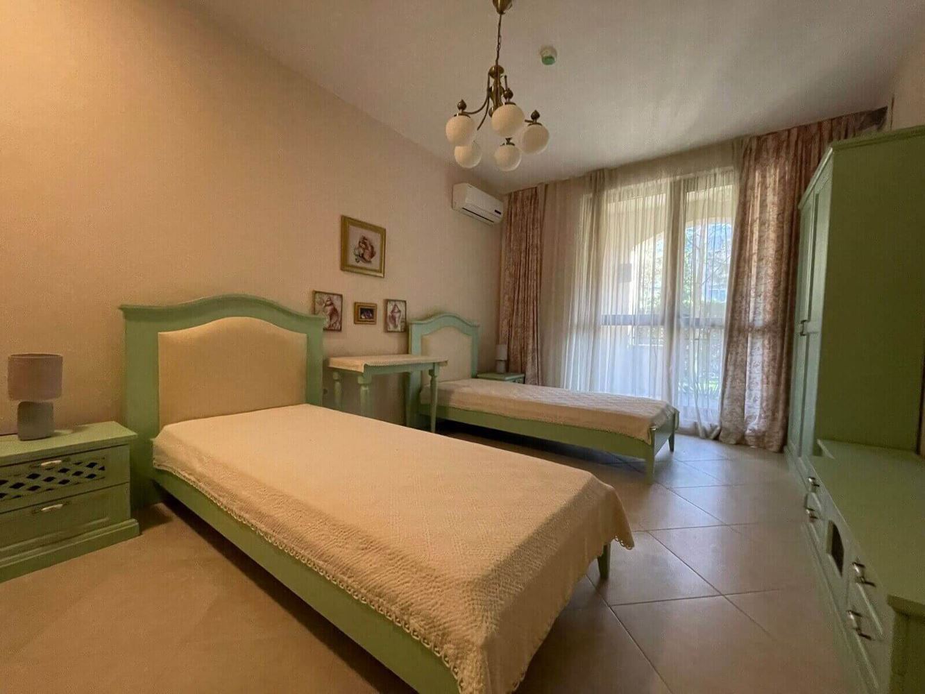 Four-bedroom flat in a luxury development in the centre of Sunny Beach, located 500 metres from the central beach. The total area is 150 m2 and the flat is located on the low ground floor of the building. The flat is sold furnished and equipped with sanitary facilities. The flat consists of an entrance hall, living room with kitchen, four bedrooms, two WCs and four balconies. It opens onto a private lawn. Mediterranean style complex. The interior and exterior finishes are tasteful and high quality. Landscaping and landscaping make a very pleasant impression, with swimming pools, seating areas, benches and swings, decorative street lights, play and sports complexes, well maintained walkways and lawns, palm trees and beautiful flower beds, artificial lakes, areas for rest and sport, several restaurants, shops, fitness club and sauna, underground parking and car parks will allow flat owners to experience the convenience and benefits of the largest complex on the coast.