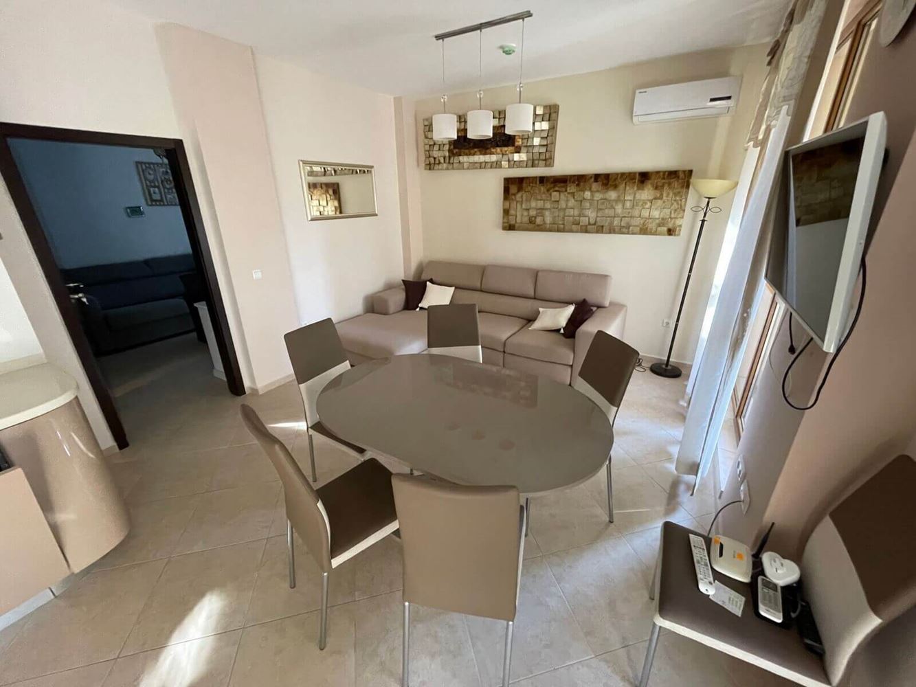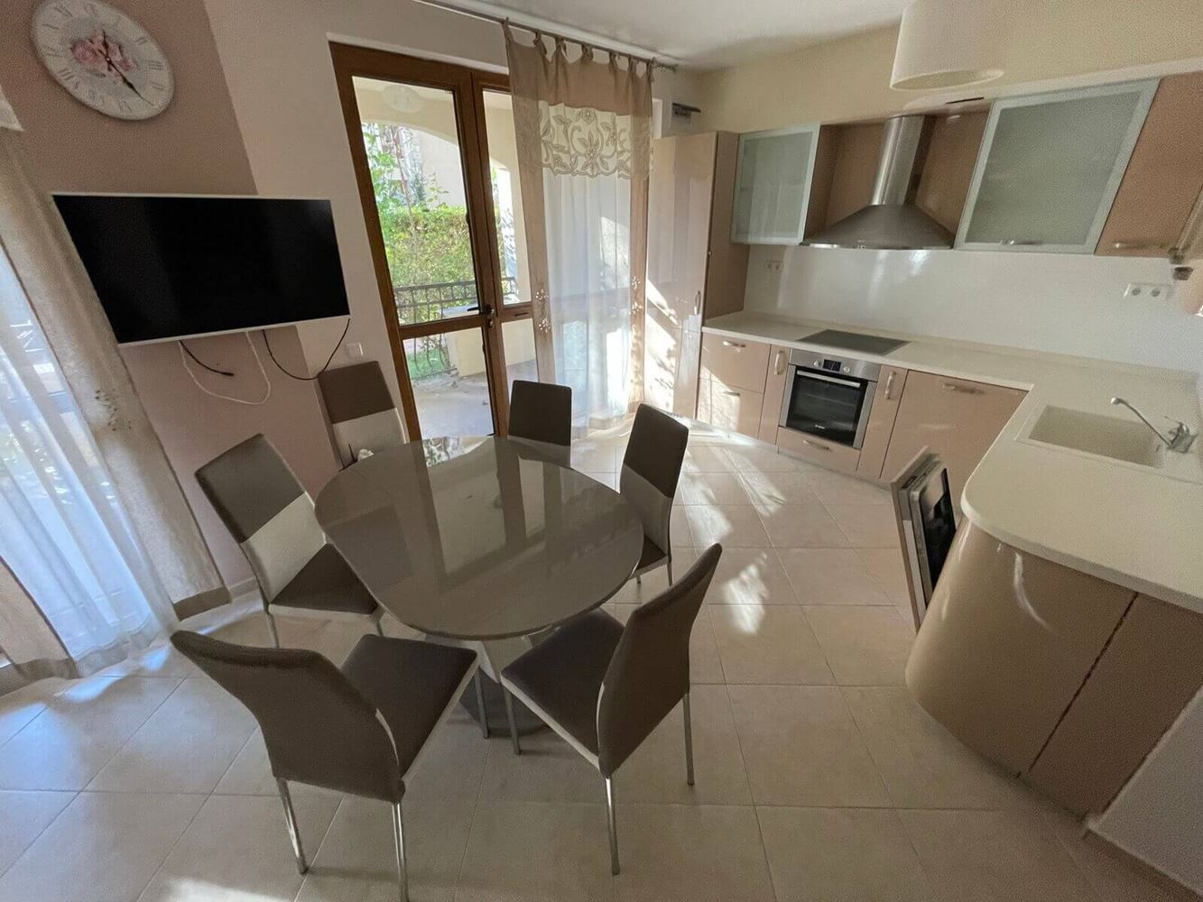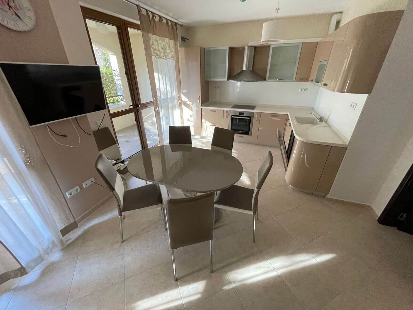 Four-bedroom flat in a luxury development in the centre of Sunny Beach, located 500 metres from the central beach. The total area is 150 m2 and the flat is located on the low ground floor of the building. The flat is sold furnished and equipped with sanitary facilities. The flat consists of an entrance hall, living room with kitchen, four bedrooms, two WCs and four balconies. It opens onto a private lawn. Mediterranean style complex. The interior and exterior finishes are tasteful and high quality. Landscaping and landscaping make a very pleasant impression, with swimming pools, seating areas, benches and swings, decorative street lights, play and sports complexes, well maintained walkways and lawns, palm trees and beautiful flower beds, artificial lakes, areas for rest and sport, several restaurants, shops, fitness club and sauna, underground parking and car parks will allow flat owners to experience the convenience and benefits of the largest complex on the coast.