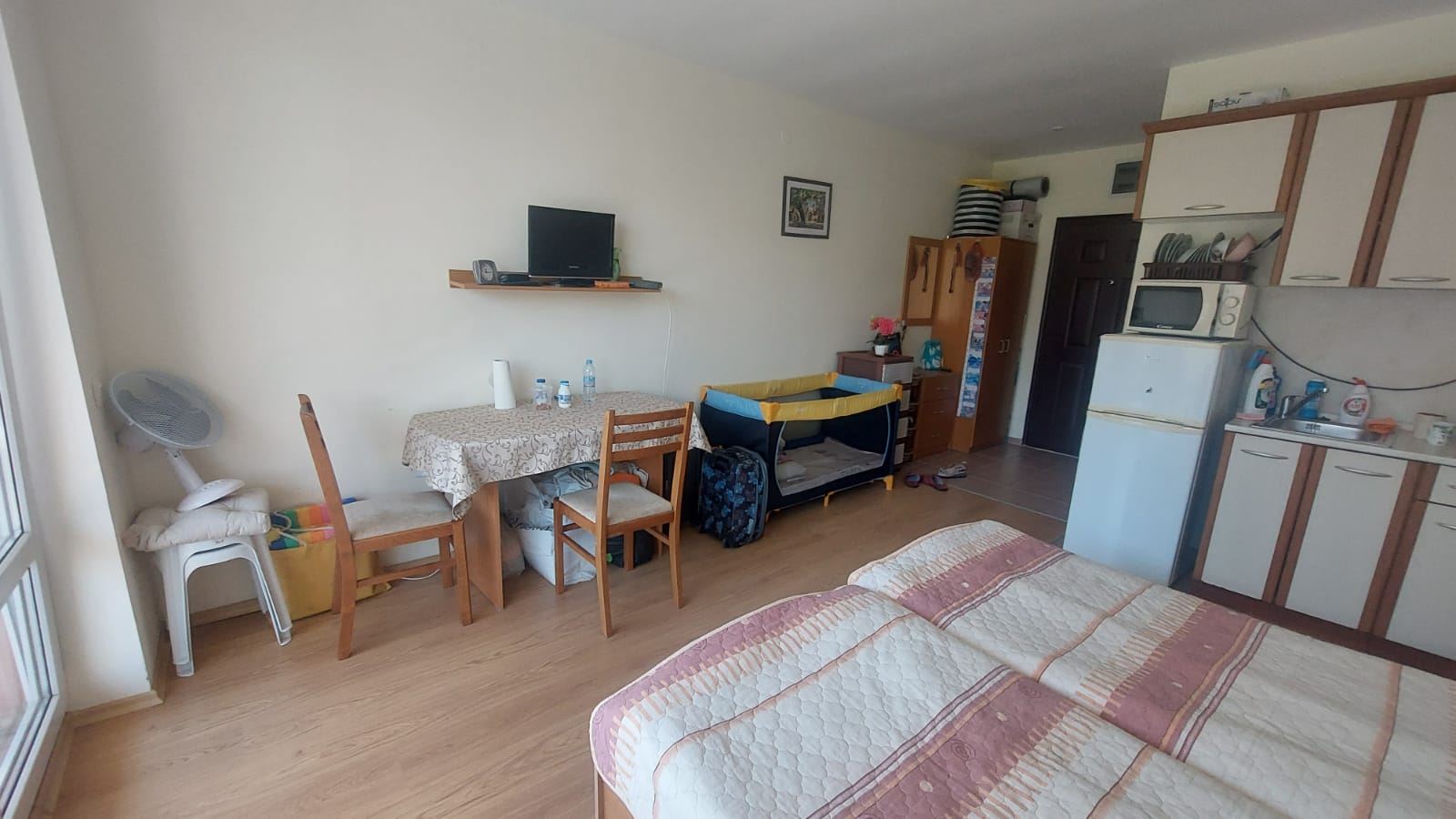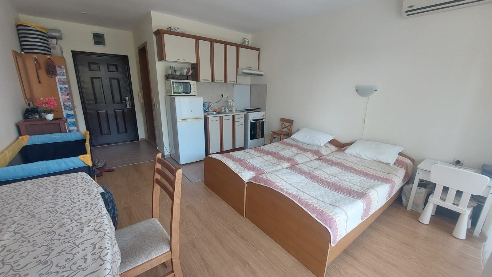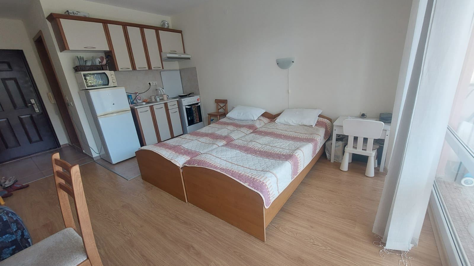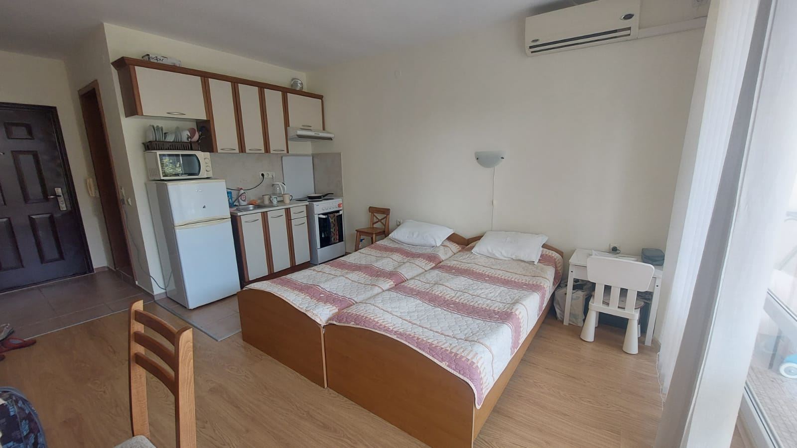 A large studio in a beautiful complex in Sunny Beach is an excellent opportunity for a comfortable stay or vacation. The apartment has an area of 40 square meters and provides a spacious living room with a kitchen, a combined bathroom and a balcony. This provides a comfortable space for living. The accommodation is fully furnished and equipped with everything you need, making it ready to move in. This includes furniture, appliances and other amenities. The complex has extensive and well-maintained grounds with several swimming pools, restaurant, bar, sports and children's playgrounds, tennis court, parking and 24-hour security. This provides residents with many opportunities for an active lifestyle and recreation. There is an Aquapark and a large supermarket next to the complex, making it easy to access various services and products. This apartment and the complex in which it is located are perfect for permanent year-round living due to the amenities and infrastructure.