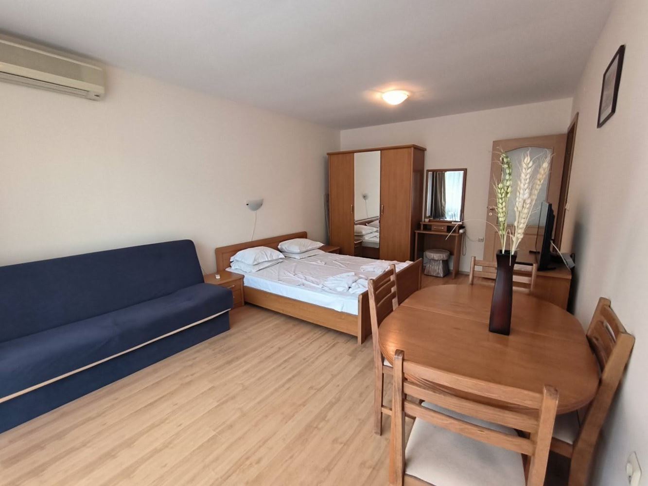 Large studio is located in a complex located on the first line of the sea right at the foot of the Stara Planina mountains. The apartment has an area of 51,38 m2 and consists of a living room with a kitchenette and a place to relax, a bathroom with WC and a terrace with a view to the mountains and the resort. Fully furnished and equipped with everything you need for a cozy holiday and accommodation. The place is ideal for family vacations, health promotion and recuperation, as the combination of mountain, forest and sea air is extremely beneficial. You can spend time enjoying sunbaths, swimming in the clear sea water rich in iodine, doing sports in the fitness club or strolling in the pine forest. Children will enjoy swimming in the huge pool under the supervision of a lifeguard, having fun in the children's pool with a water slide and fountain, playing on the playground. You can spend time in the restaurant by the pool. In the complex there is a sauna, hairdresser, manicure and pedicure, massage salon, private beach on the territory, office and reception, offering a variety of services and excursions to historical places in Bulgaria and neighboring Turkey and Romania. Laundry services, free parking in the complex and paid parking next door are also at your disposal.