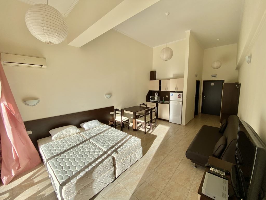 A large 57.15 m2 studio flat with panoramic sea views is located in a luxury development on the first line. The complex has four swimming pools for adults and three for children. A restaurant, children's playground, parking are all at the owners' disposal. There is a park with amusements nearby. The pools with running clear water, sun beds, umbrellas, children's playground, beach football and volleyball pitch are free of charge for the owners. Paid services are offered in the spa, the water park and the beauty salon. There are lots of green areas. There is a pool bar and restaurant, several sports and children's playgrounds, mini golf, shops, fitness club, spa centre, medical centre. The flat is located on the eighth floor and consists of a living room with kitchen area, a combined bathroom and a large balcony. The sea is literally at your feet.