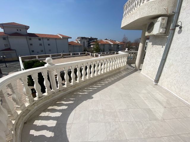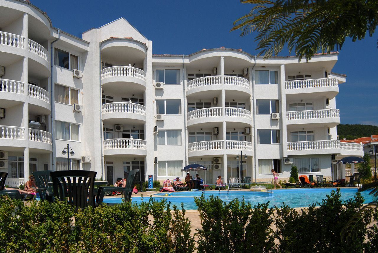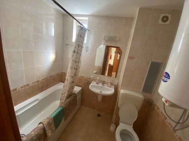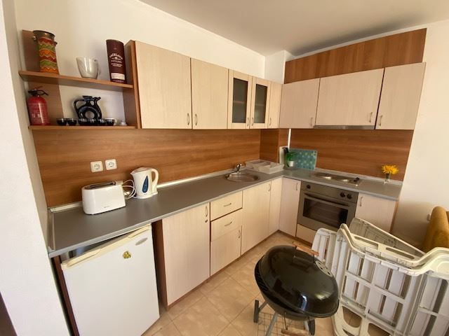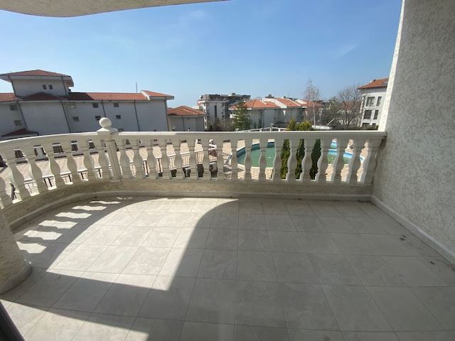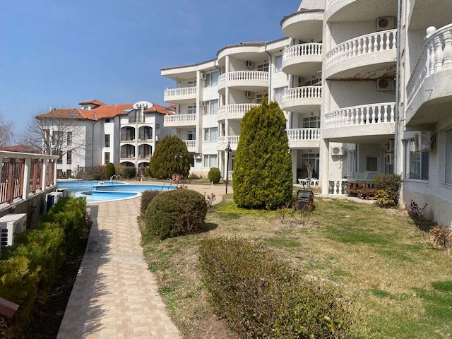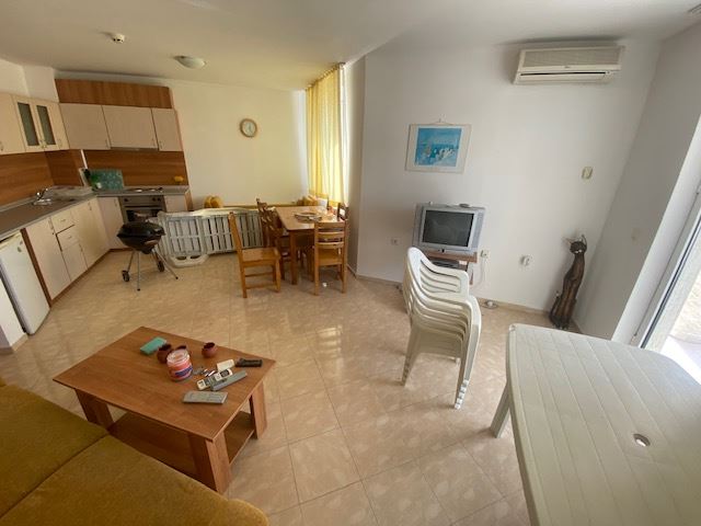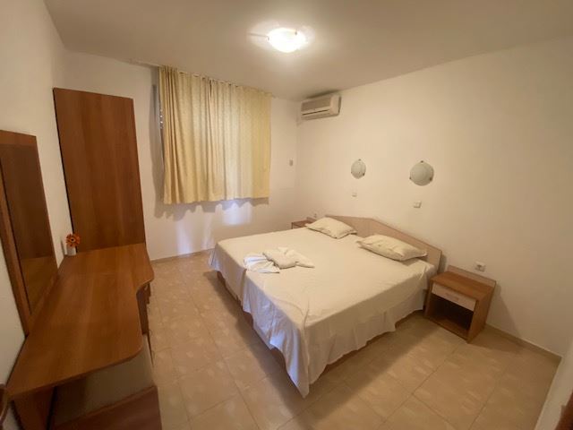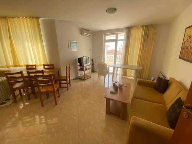 We offer for sale a two bedroom flat with a large balcony in a luxury complex in the seaside town of St. Vlas. The residential complex with luxury flats is located 200 meters away from the modern yacht marina of the resort town and the sandy beach. The small cozy complex is built in modern architectural style. In the yard of the complex there is a swimming pool with children area. The offered flat has built-up area 109m2 and consists of a living room with open plan kitchen, two separate bedrooms, bathroom with WC, separate WC and a splendid terrace overlooking the pool. The flat is being sold fully furnished with quality furniture and equipped with everything you need.