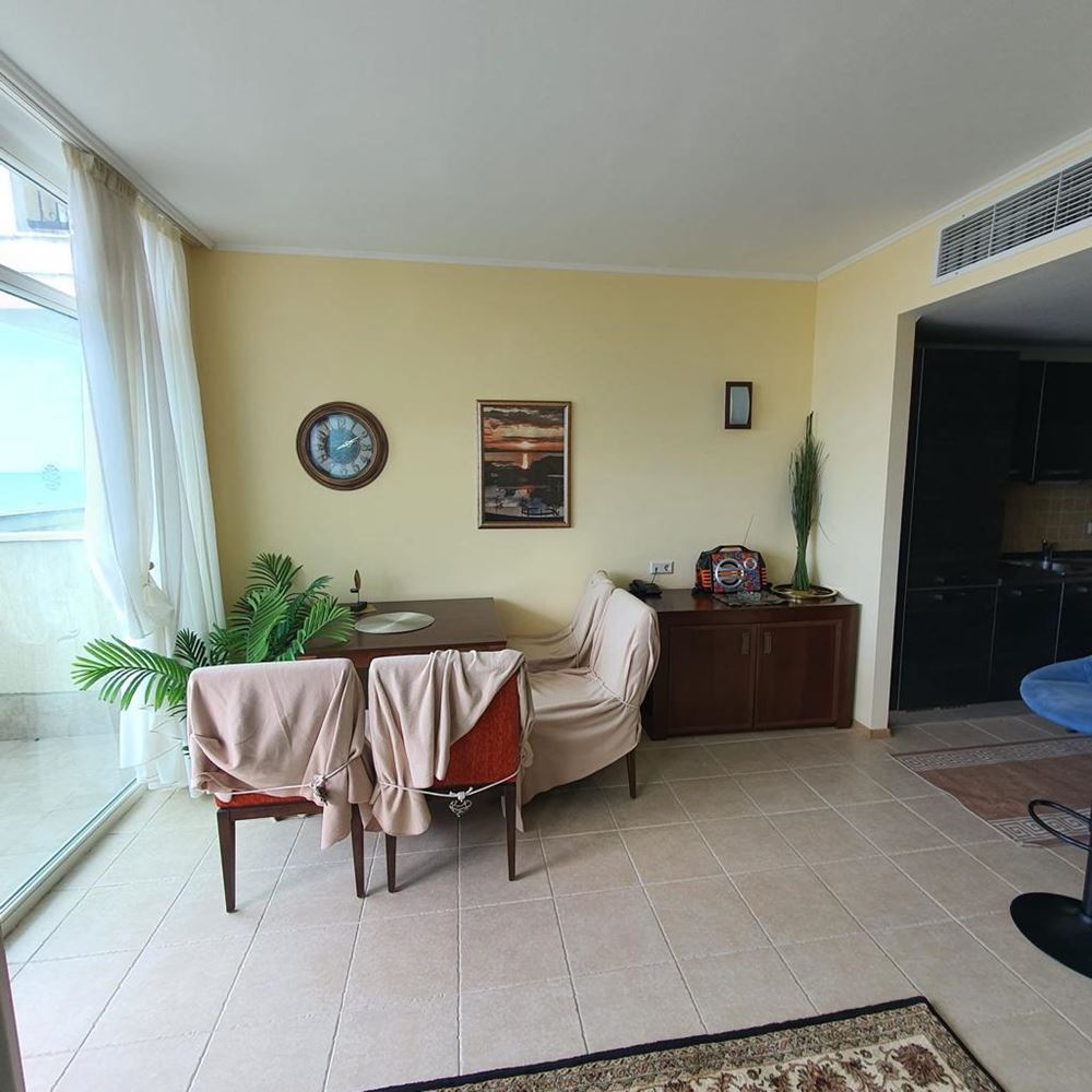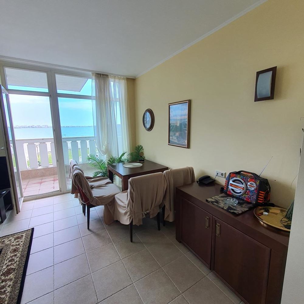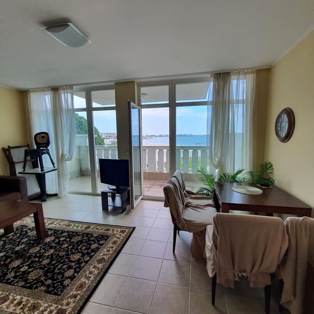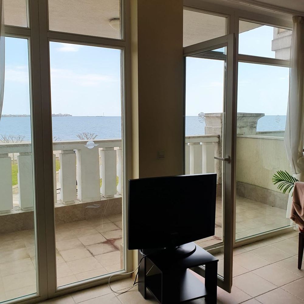 Beautiful one-bedroom flat in the famous resort town of Pomorie. The flat is located in a fashionable complex, which is located on the first line directly to the sandy beach. The complex has a perfectly equipped infrastructure, including swimming pools with recreation areas, SPA-center, fitness centre, bars, restaurants, reception, security, parking. This spacious one-bedroom flat is located on the high ground floor, actually the first floor. The size of the flat is 72 m2. The bright and spacious flat is offered furnished and equipped. It has a sea view.