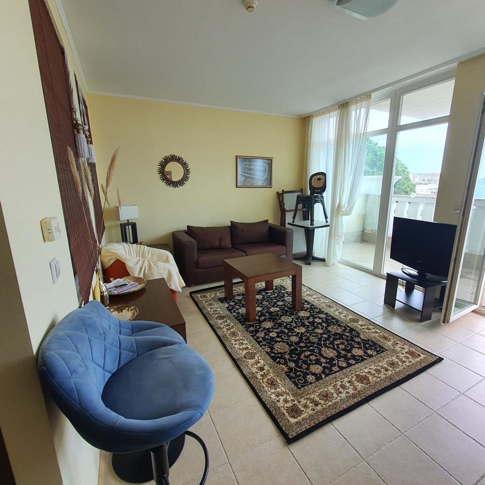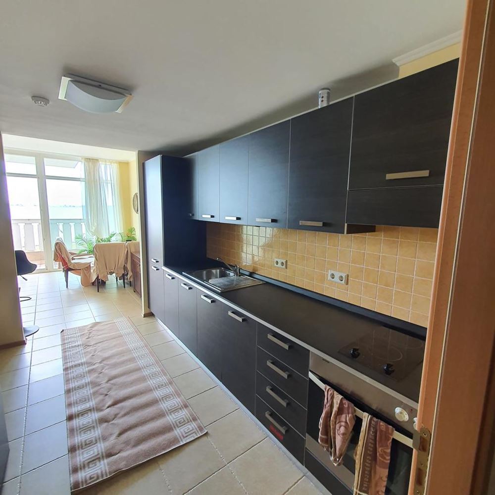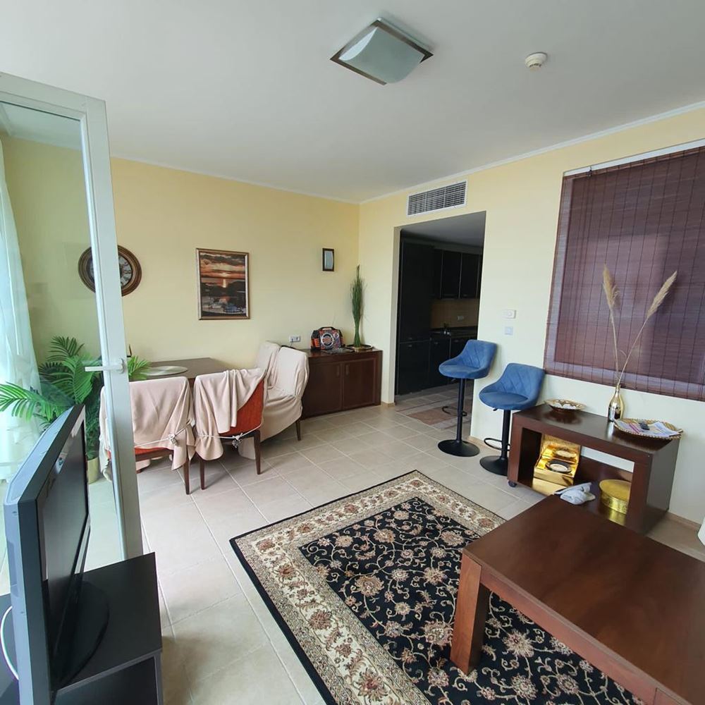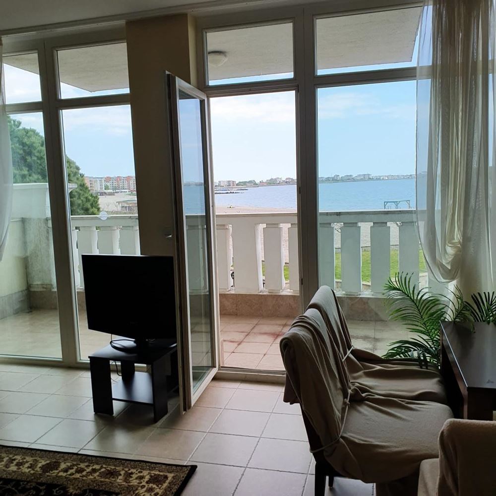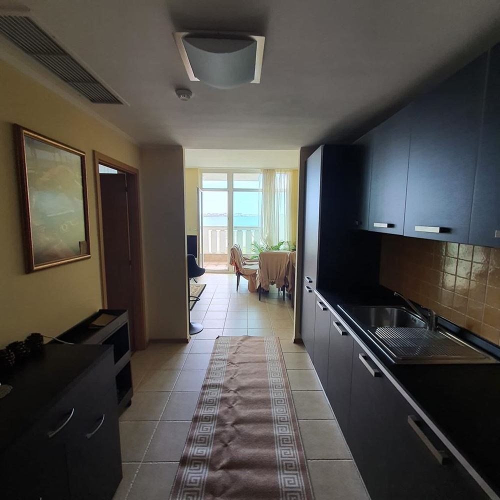 Beautiful one-bedroom flat in the famous resort town of Pomorie. The flat is located in a fashionable complex, which is located on the first line directly to the sandy beach. The complex has a perfectly equipped infrastructure, including swimming pools with recreation areas, SPA-center, fitness centre, bars, restaurants, reception, security, parking. This spacious one-bedroom flat is located on the high ground floor, actually the first floor. The size of the flat is 72 m2. The bright and spacious flat is offered furnished and equipped. It has a sea view.