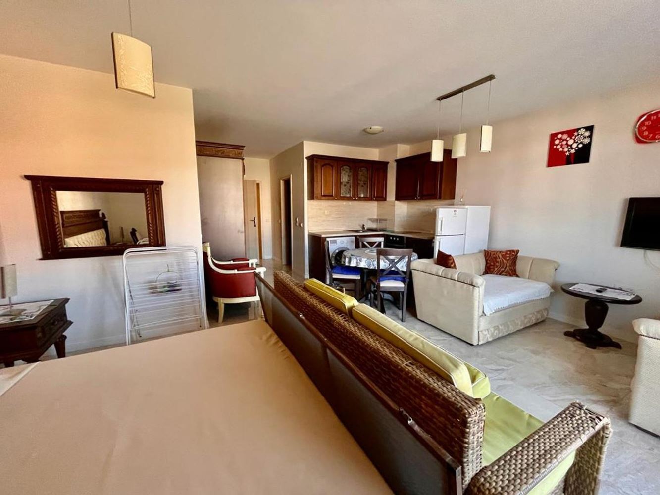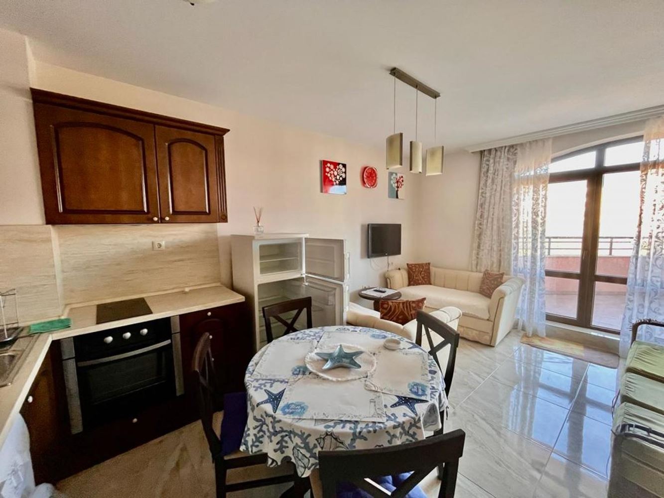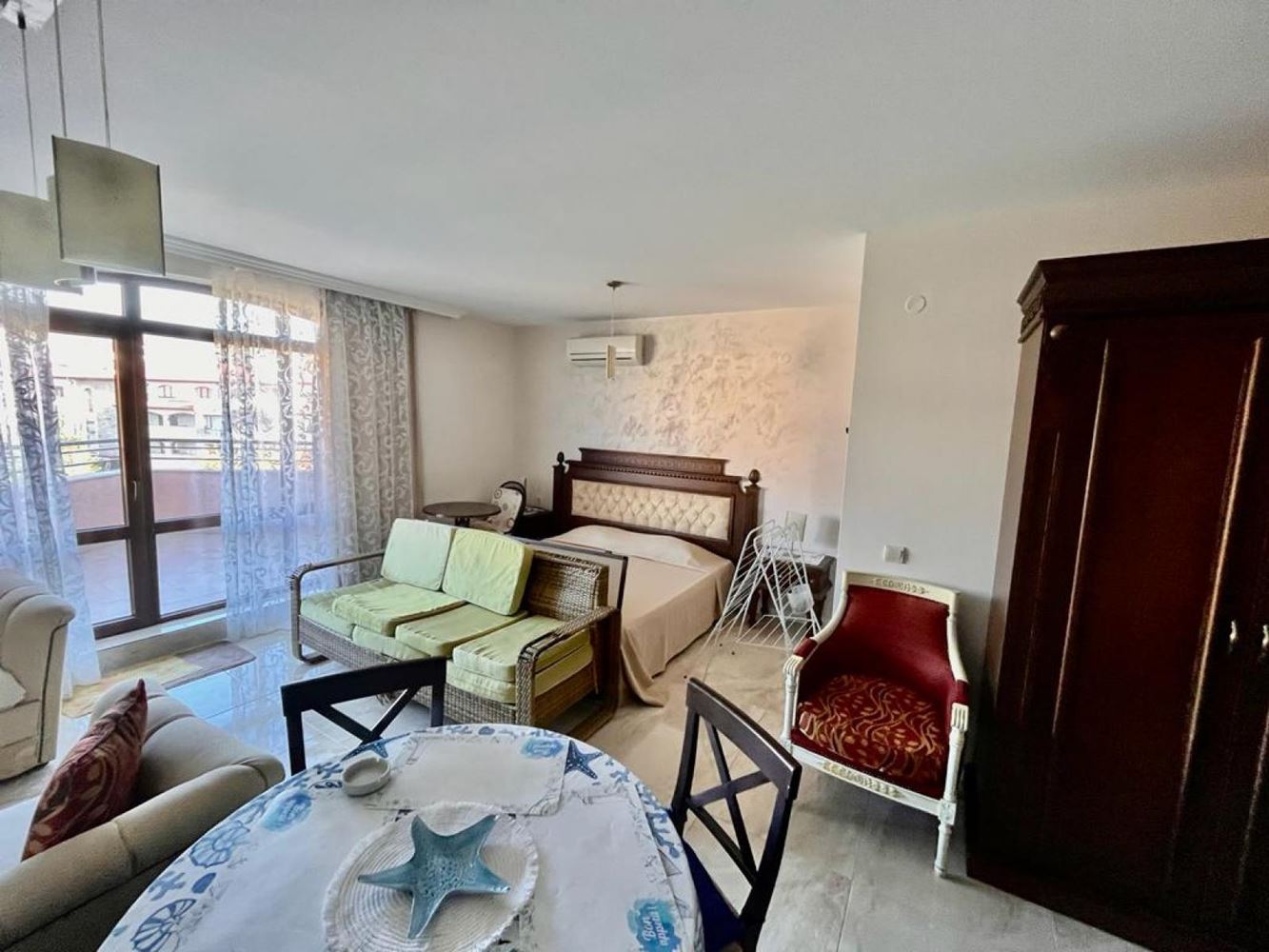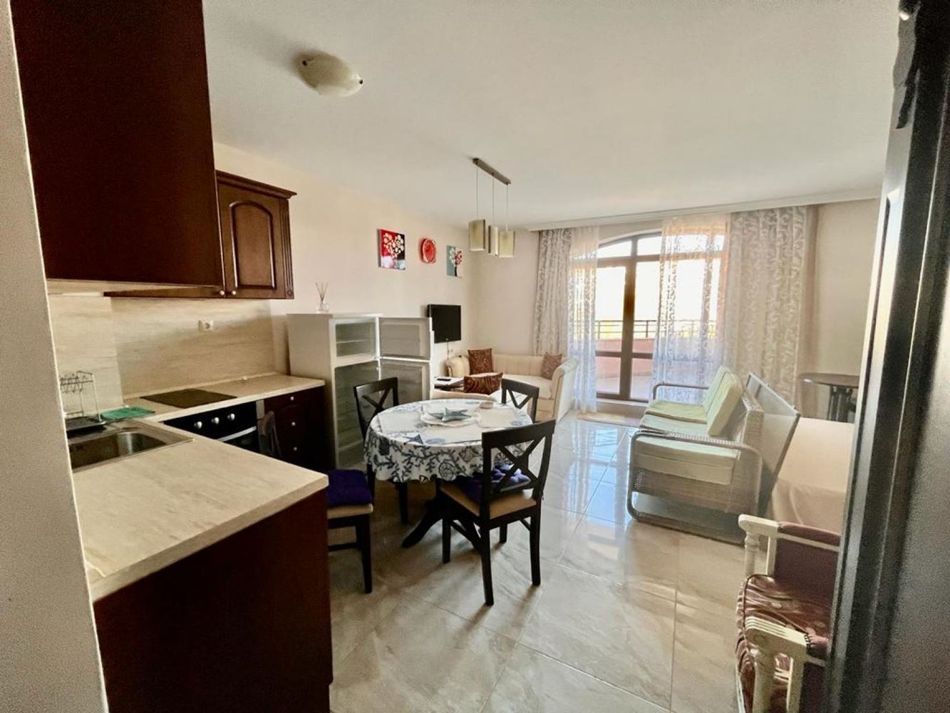 This beautiful studio with sea view in the seaside town of Sveti Vlas is a perfect combination of comfort and aesthetics within a modern accommodation. The apartament has a spacious area of 62 square metres and is located on the 5th floor of an exclusive complex on the first line from the beach. The layout of the apartament is as functional and comfortable as possible. Upon entering, you are greeted by the entrance hall, which creates a feeling of cosiness and hospitality. From here you have access to the living room, which serves as both a kitchen area and a sleeping area. This provides an open and airy space filled with light and fresh air thanks to the balcony with mesmerising views of the sea, mountains and the complex grounds. The apartament is fully furnished with stylish and functional furniture, making it ready for instant move-in or rental. This exclusive luxury complex is a top quality project. The high standards of construction, finishing materials and interior design create an atmosphere of luxury and cosiness. The infrastructure of the complex is designed to provide residents with a full-fledged holiday without domestic problems. Here you can enjoy all the comforts of modern civilisation while being surrounded by the beauty of nature and sea breeze.