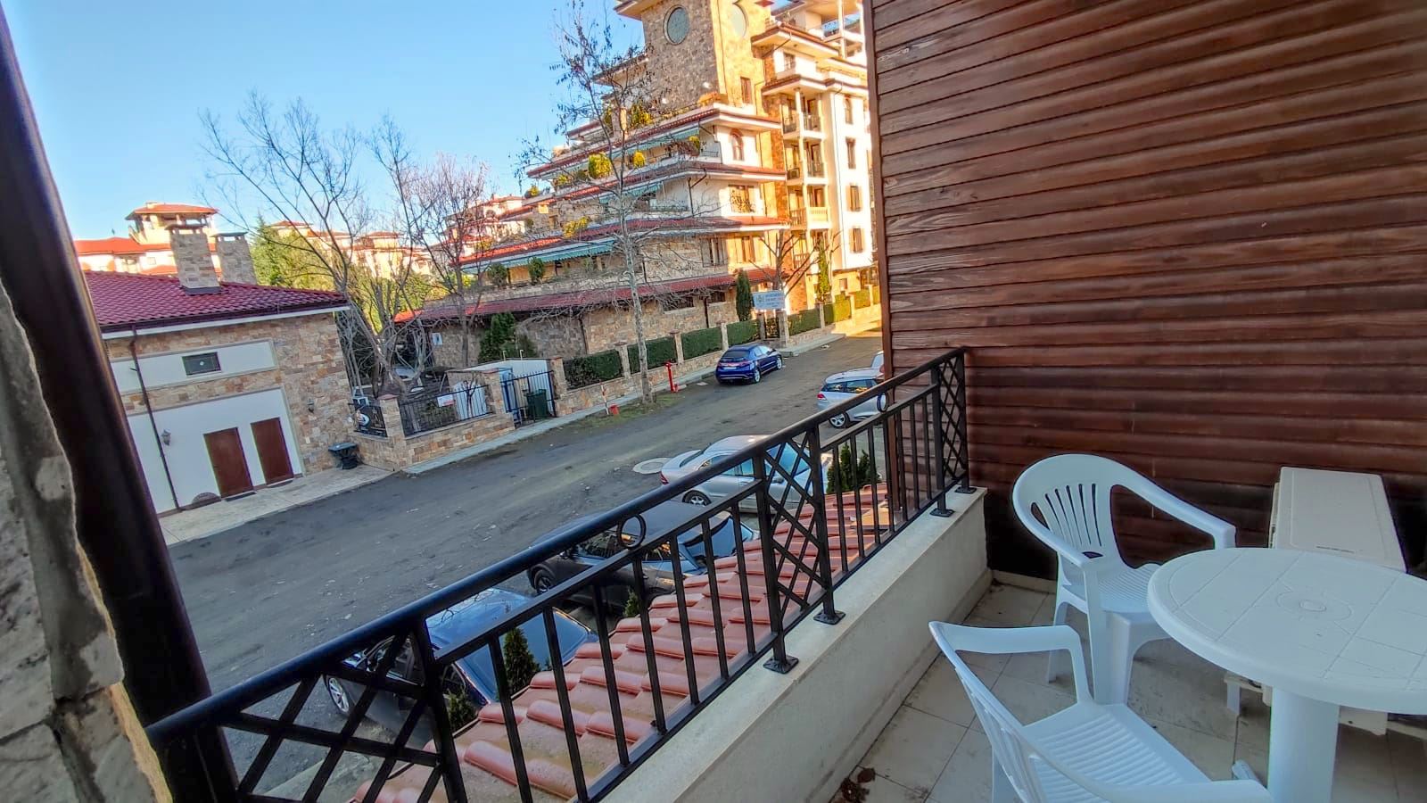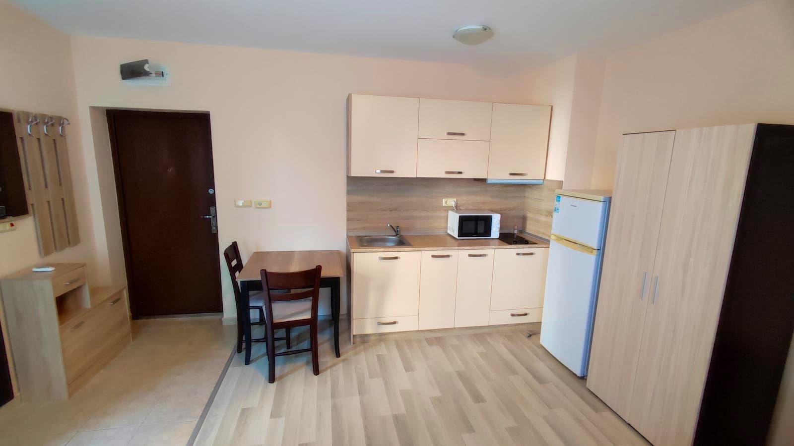 Brand new and comfortable studio in the picturesque Bulgarian resort town of Nessebar. The flat is located in a gated complex, which is located in a quiet and peaceful area, close to the beach and all infrastructure. The complex has a well established system of services and amenities, running two restaurants, cafes, supermarket, swimming pools, spa centre, fitness centre, tennis courts, children's playroom and playgrounds. All year round security is provided and there is free parking. This flat of 40 m2 is located on the first floor of the building. The flat layout is as follows: entrance hall, living room with open plan kitchen and separate sleeping and relaxation area, bathroom with WC and terrace.
