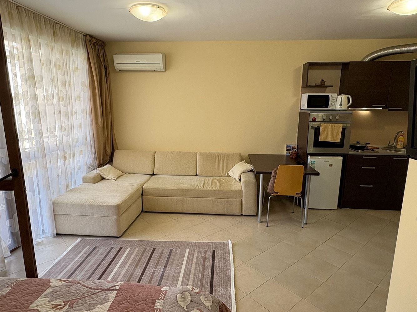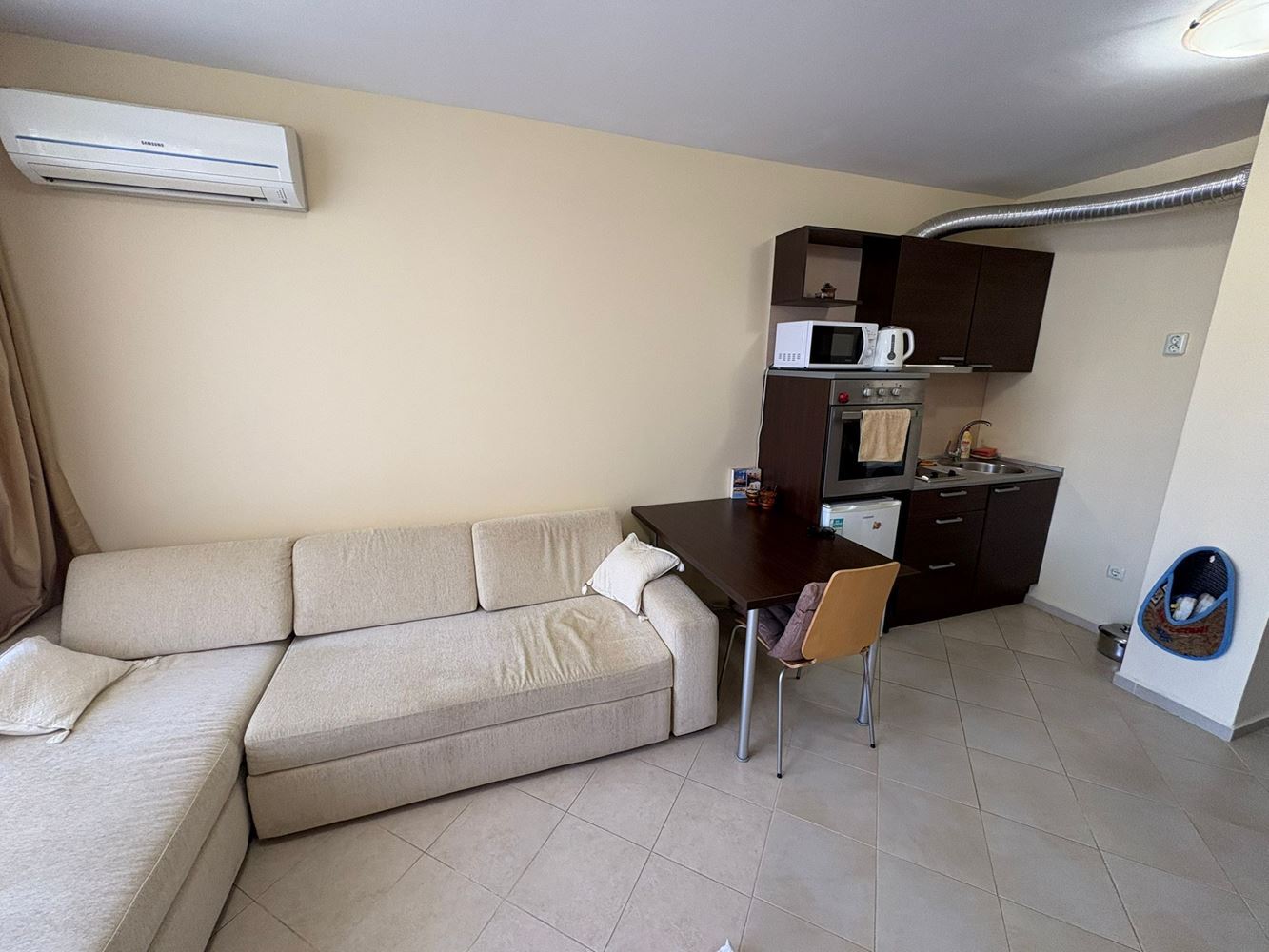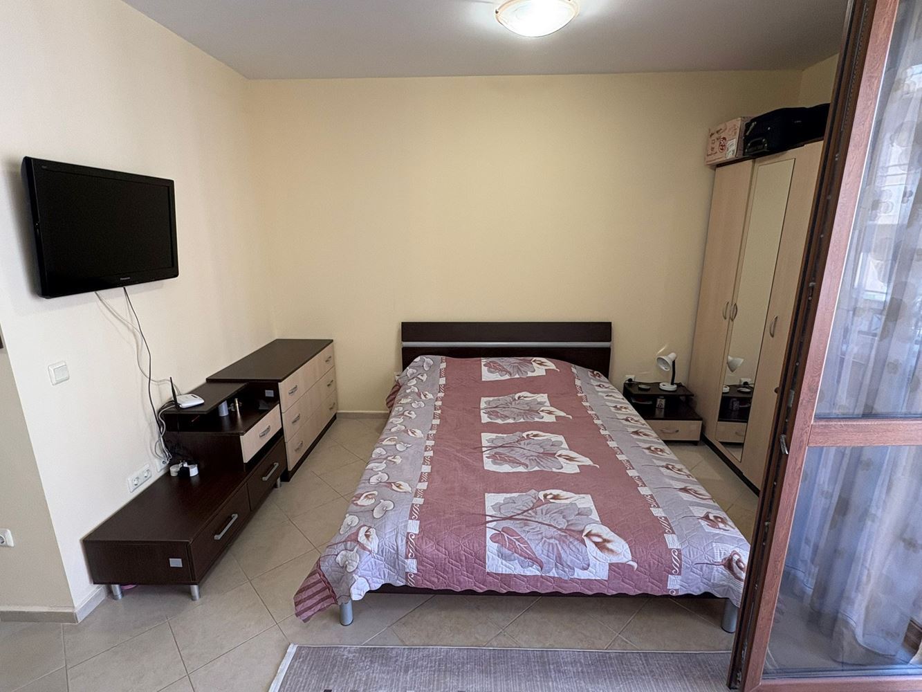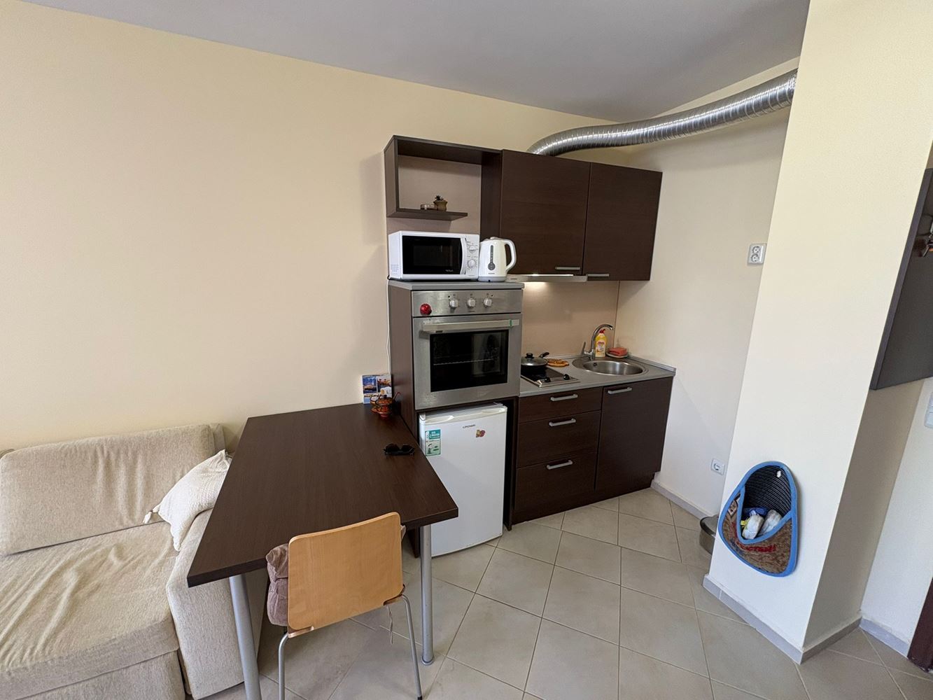 A spacious studio in a luxurious elite complex with its own infrastructure in Sunny Beach is an attractive offer for buyers. Here are some key features of this property: it is located in the center of Sunny Beach and only 500 meters from the beach, making it ideal for a vacation in the resort. The apartment has an area of 54 m2 and is located on the fourth floor. It is sold fully furnished and equipped, making it ready to move in. It consists of an entrance hall, living room with kitchenette, bathroom with toilet, and balcony with pool view.