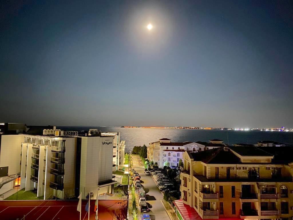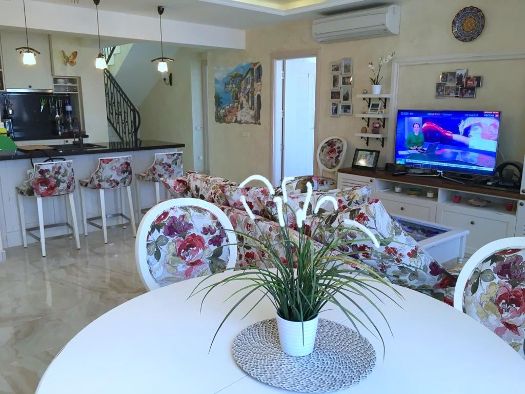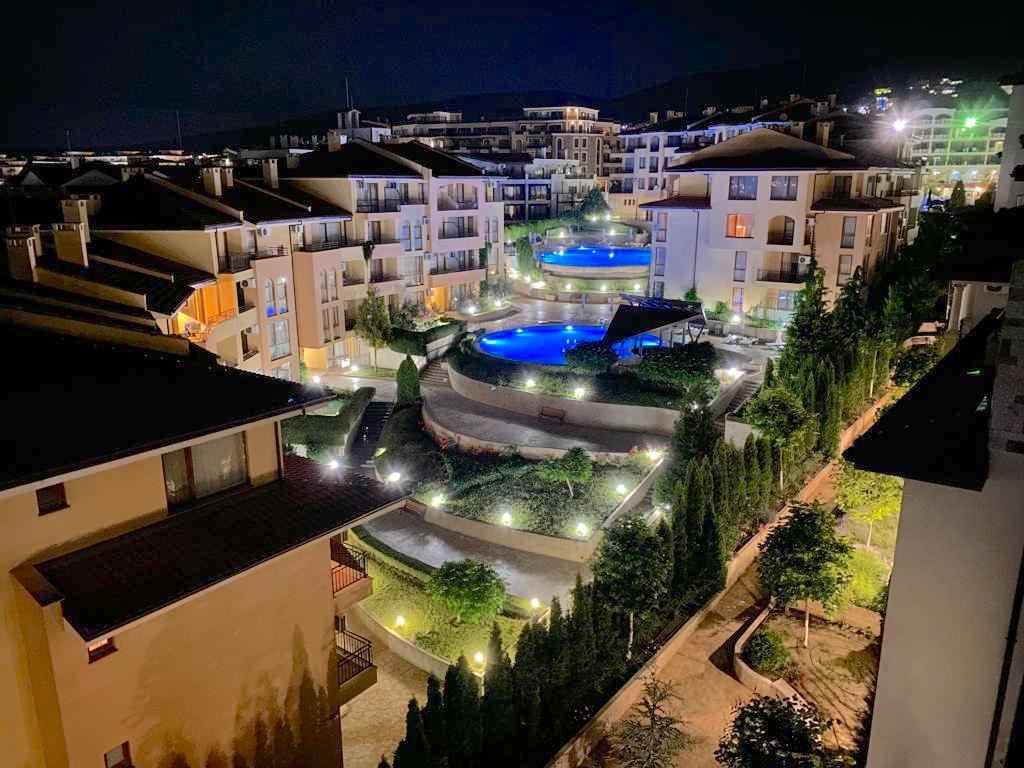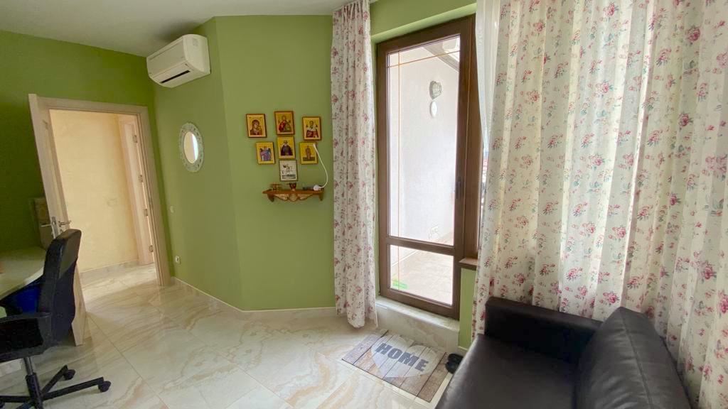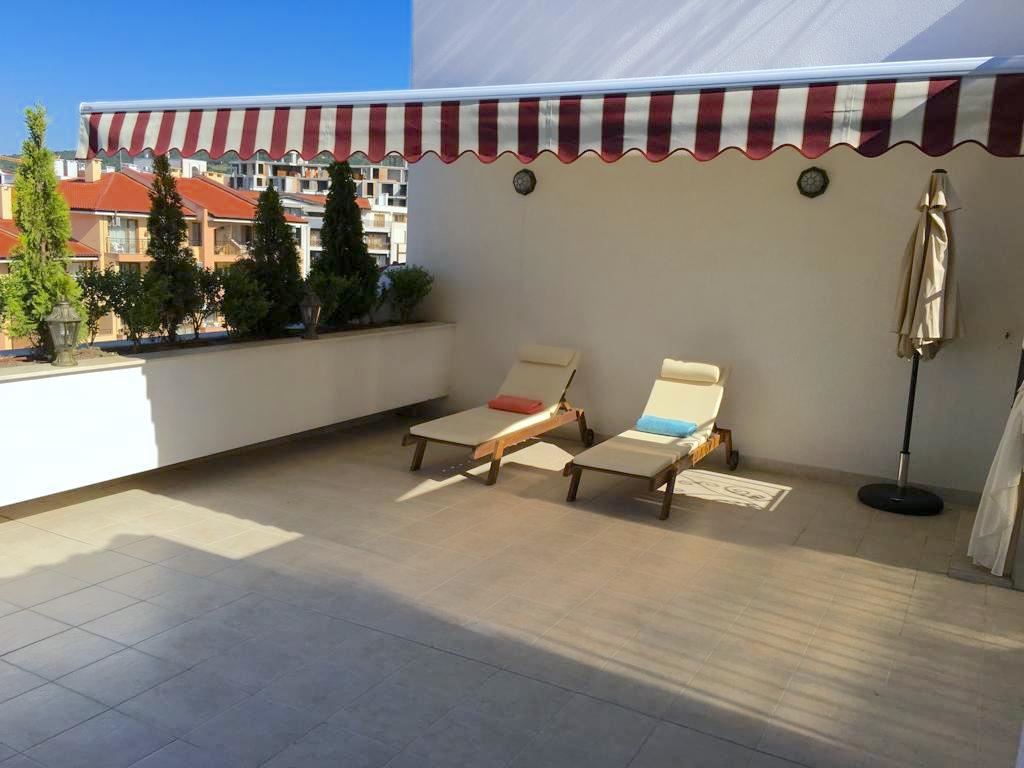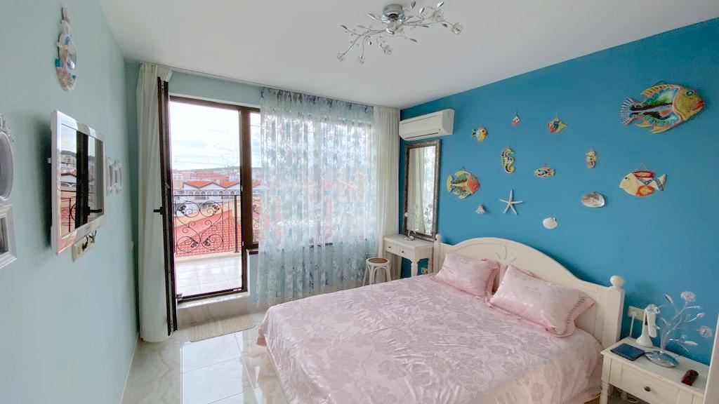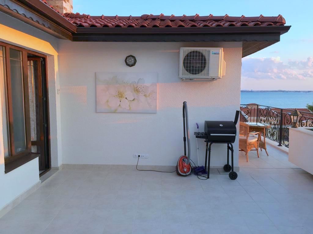 Luxury duplex apartment overlooking the sea in the complex, located on the coast, with incredible views of the seascape in the amazingly beautiful prestigious resort town of Sveti Vlas. The apartment of 216 m2 is located on the fourth and fifth floors and consists of a living room with equipped kitchen, dining area, bedroom, bathroom - on the first level. On the second level there are two bedrooms, two bathrooms, a patio-terrace with a equipped kitchen area with barbecue and sunbathing area. The apartment is in perfect condition, furnished with quality furniture and appliances. There is everything you need for all year round living and summer vacations. The architectural design of the complex impresses with its diversity, you can enjoy a walk in the fresh air or relax under the fabulous tents. There are beautiful statues, fountains and trees on the territory of the complex. The total area of the greened territory is about 3000 m2. The complex has its own infrastructure, there are all conditions for convenience, full recreation and year-round residence on the seashore.