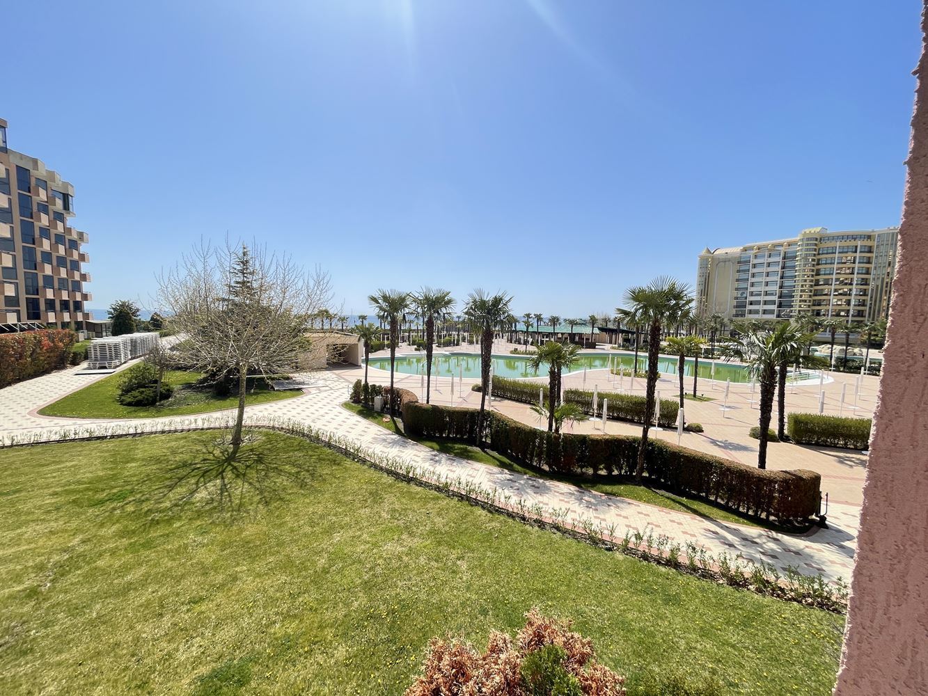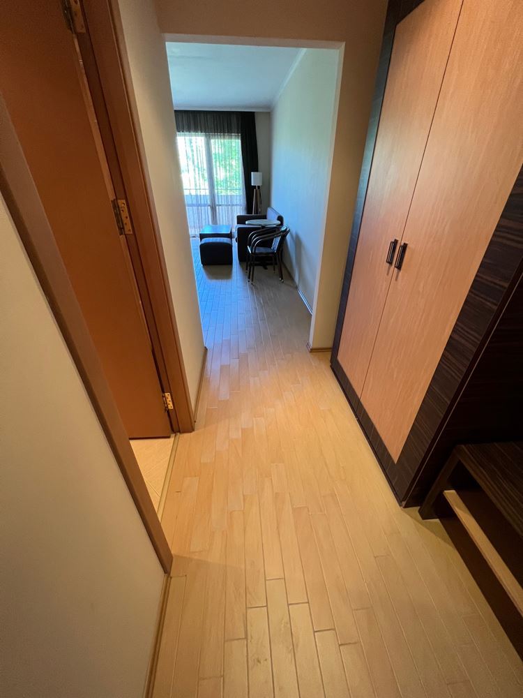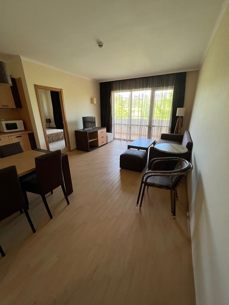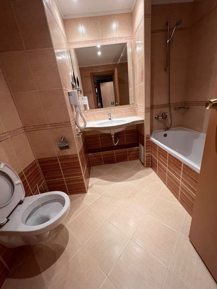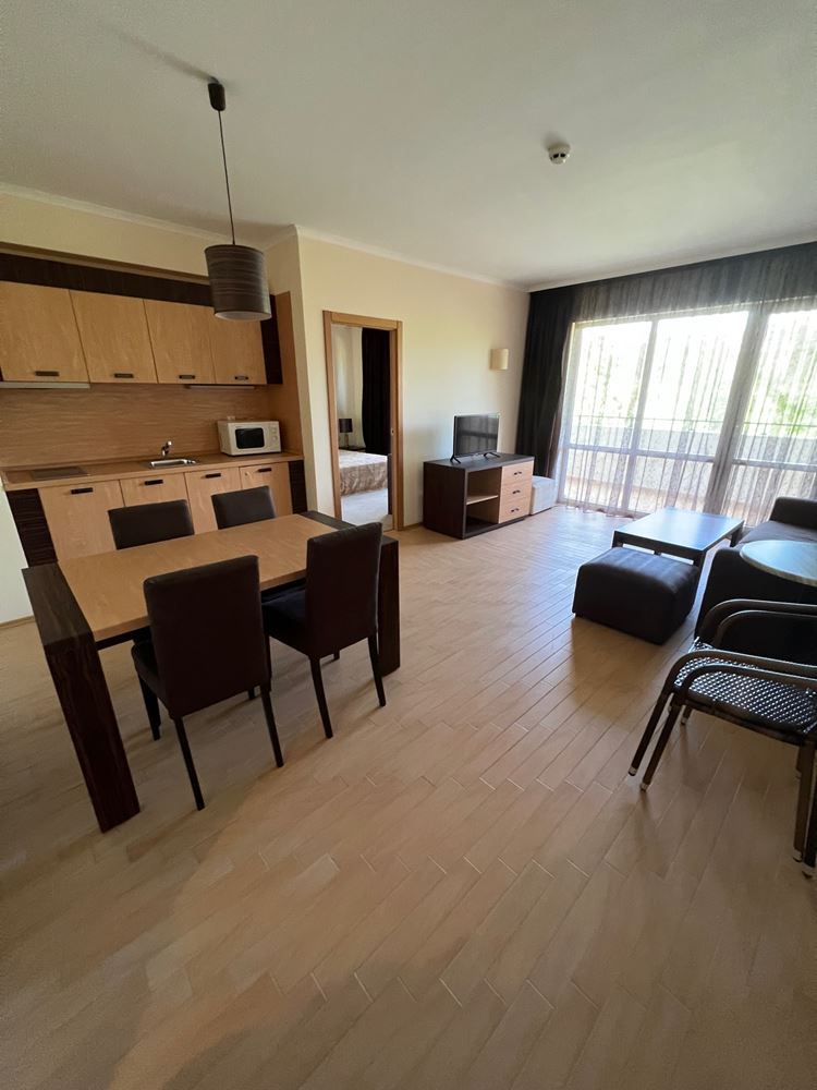One bedroom flat on the sea in a luxury beachfront development. The complex is located in the most prestigious northern part of the resort of Sunny Beach. Luxury hotels and complexes are located nearby. The complex has a magnificent area with a lot of interesting infrastructure: thematic restaurants, stylish bars, pools and slides, children's zone and animation, sports area, gym, SPA centre with Turkish sauna, Finnish sauna, massage, jacuzzi, beauty centre, beauty salon, business centre, mini golf, front desk, room service, parking. The complex has a VIP-zone and its own beach strip with umbrellas and sun loungers. The lush park area has a unique landscape with palm trees and tropical trees. The flat is located on the first floor of the building. The property measures 83 m2 on the third floor. The flat is spacious and comfortable. It is offered furnished.