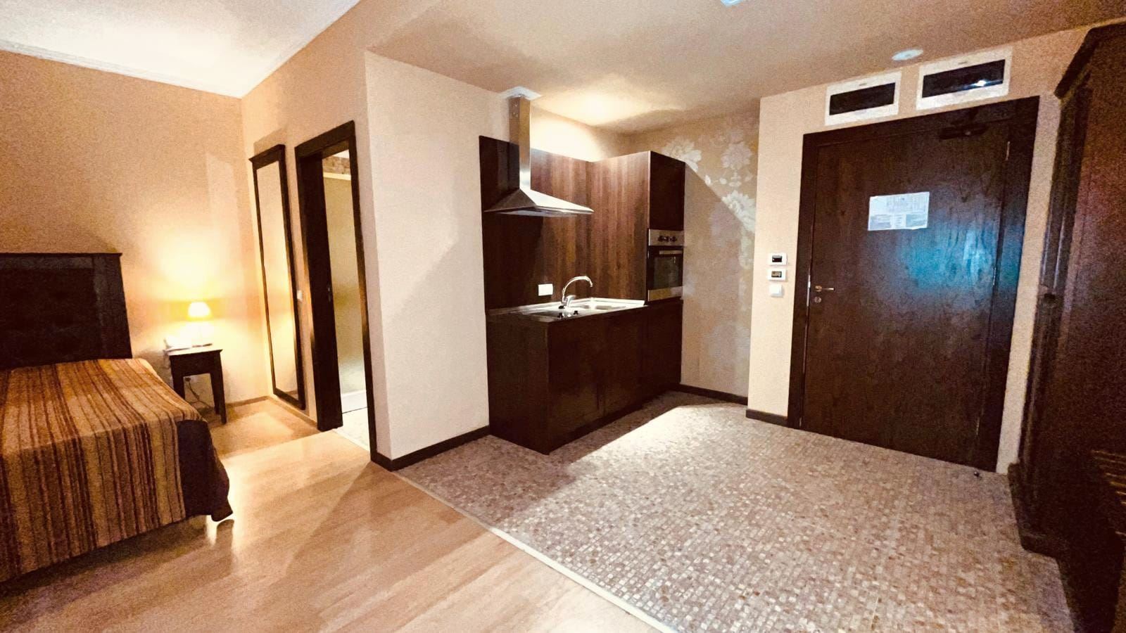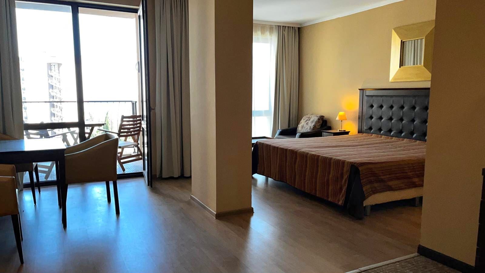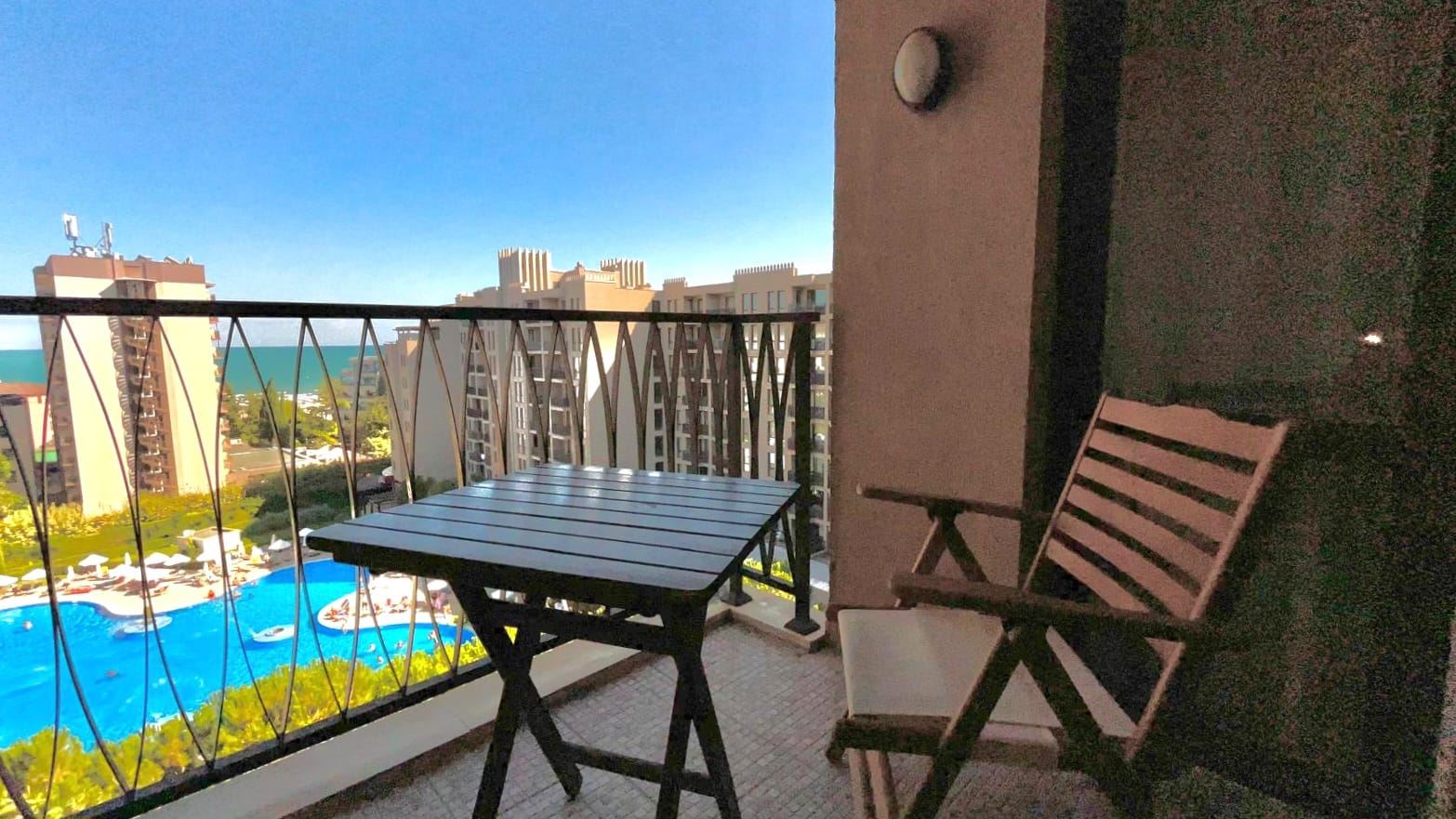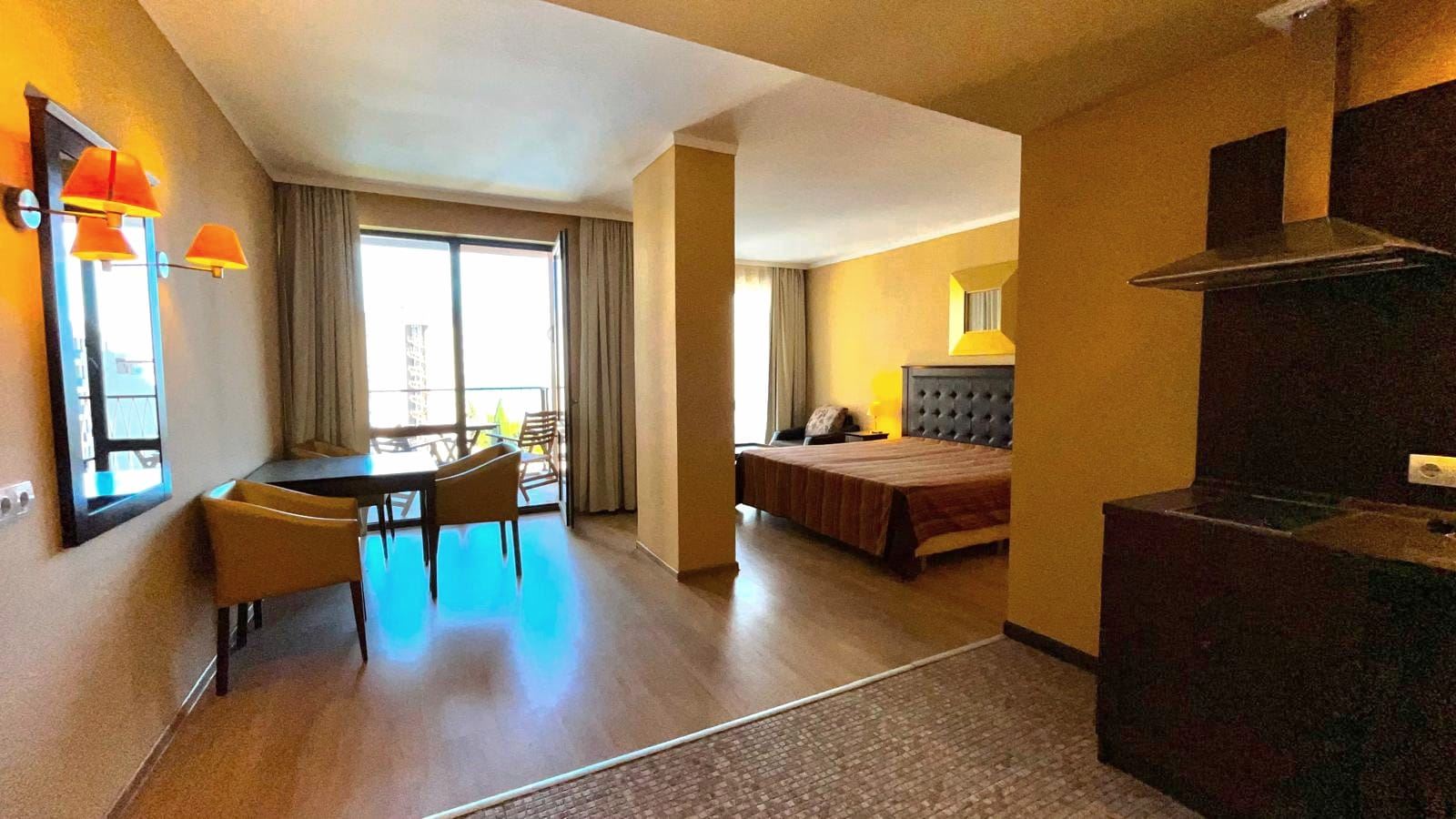 It consists of an entrance hall, a spacious living room with kitchenette and sleeping area, a bathroom with toilet, and a balcony with a wonderful view of the resort.