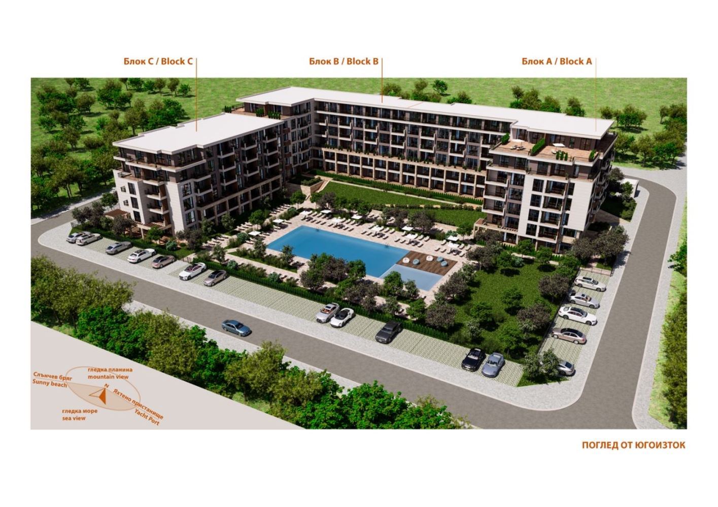 The complex is located in one of the most preferred seaside resorts – the town of Sveti Vlas, at the foothills of the Balkan Mountains. This place offers a unique combination of sea and mountain climate, tranquility, and excellent infrastructure, making life here comfortable and pleasant throughout the year. Thanks to convenient transport connections, access to the beach, the center, and neighboring resorts is easy and quick by car, on foot, or by bicycle, which further increases the convenience and value of the property.