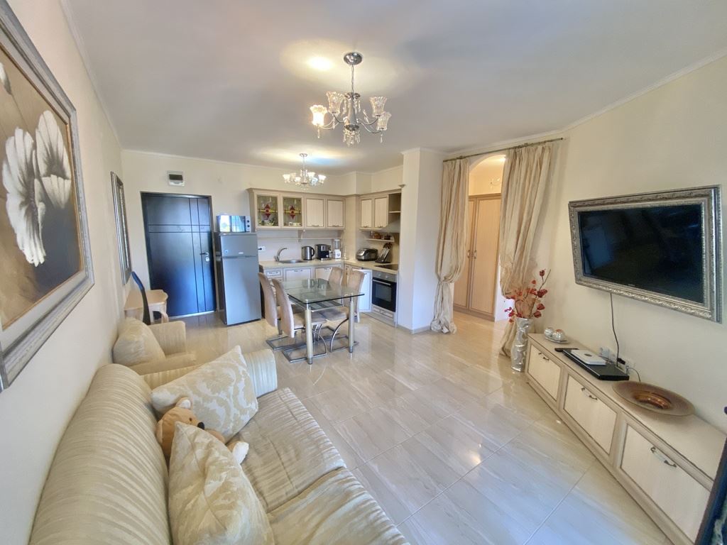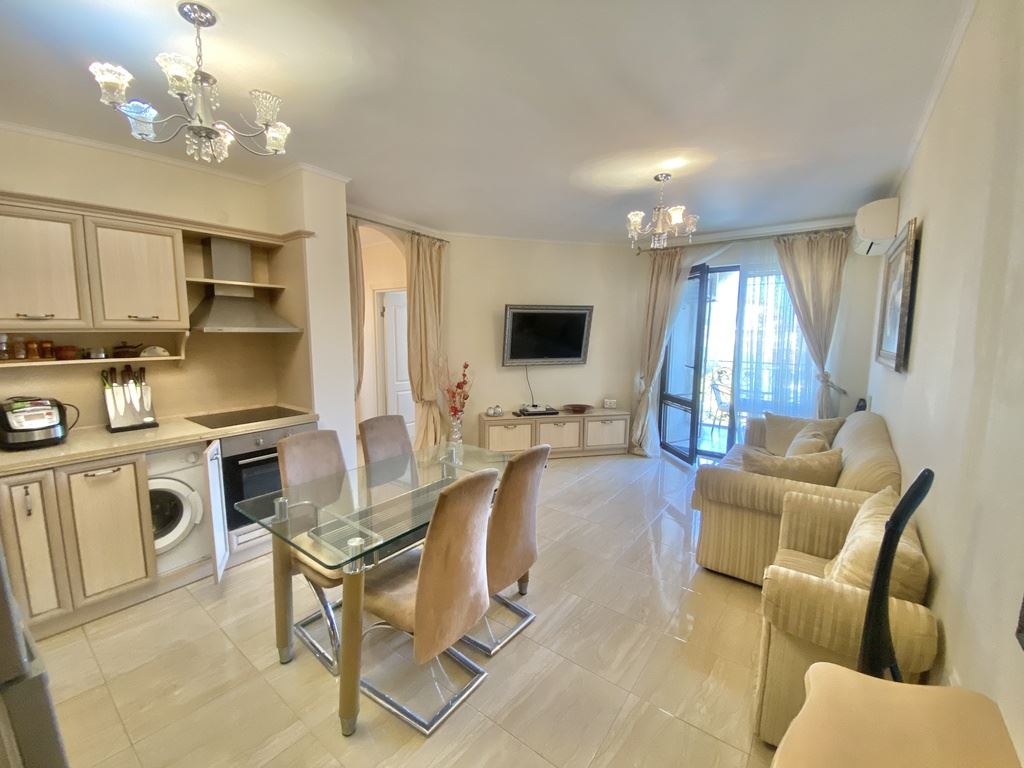 For sale is an exclusive two-bedroom apartment in one of the most prestigious complexes in the town of. In the most exclusive complex in Nessebar. With a total area of 82 m², this property offers contemporary comfort and luxury combined with unique pool views from your private balcony. Conveniently located in the complex, the apartment consists of a spacious entrance hall, a bright living room with kitchenette, two cosy bedrooms and two fully equipped bathrooms. Facing east, you will be greeted by the warm rays of the sun every morning, adding an extra sense of cosiness and comfort. Each room is equipped with modern air conditioning, ensuring a pleasant environment at any time of the year. The apartment is furnished with high quality furniture and appliances that have been carefully selected for maximum functionality and elegance.