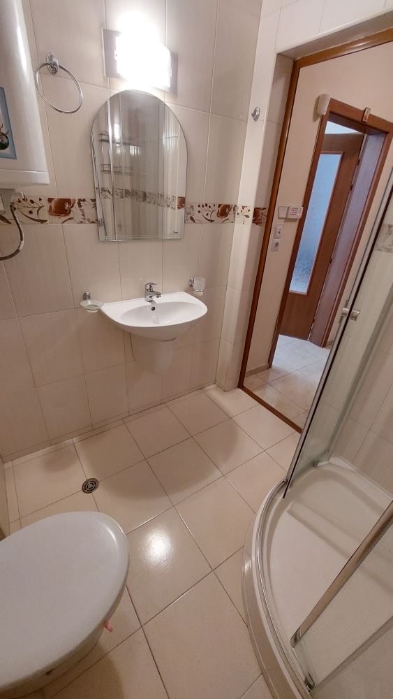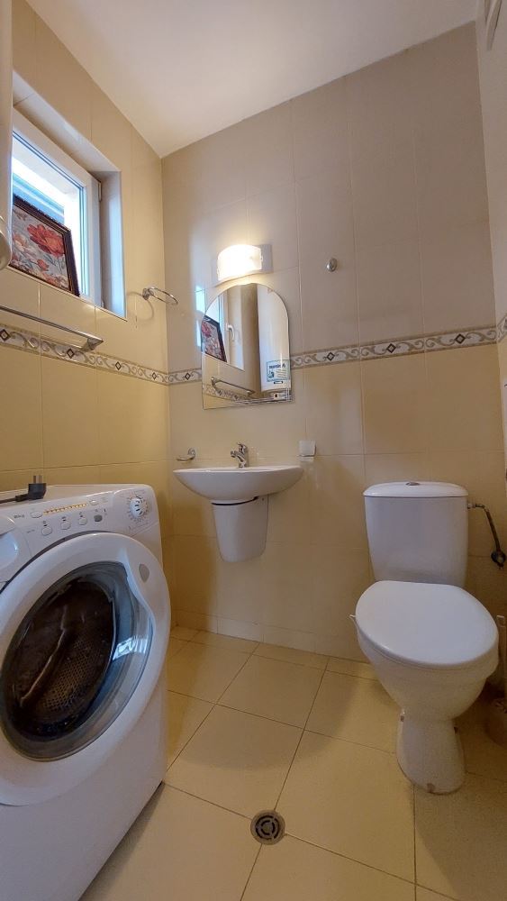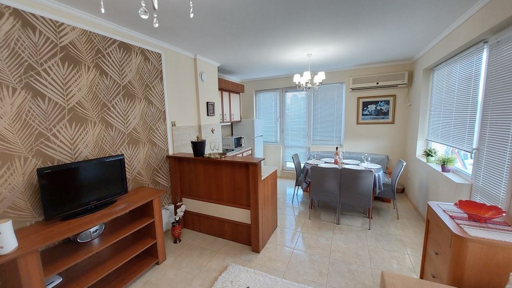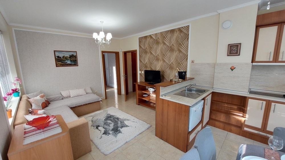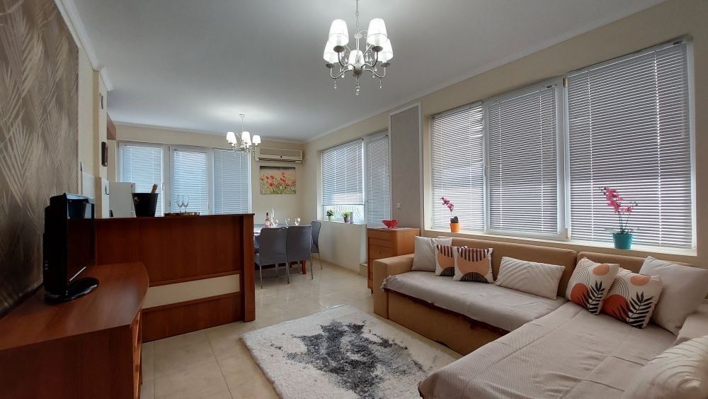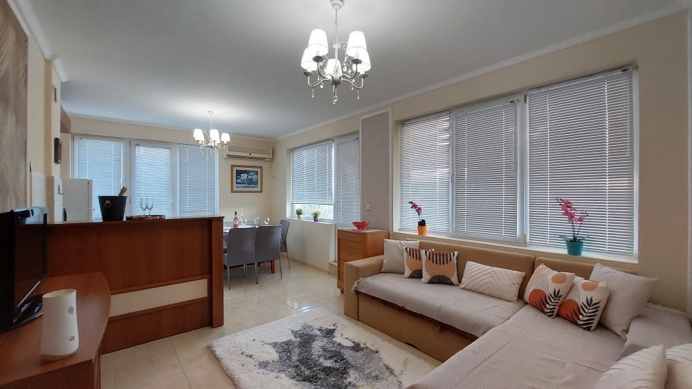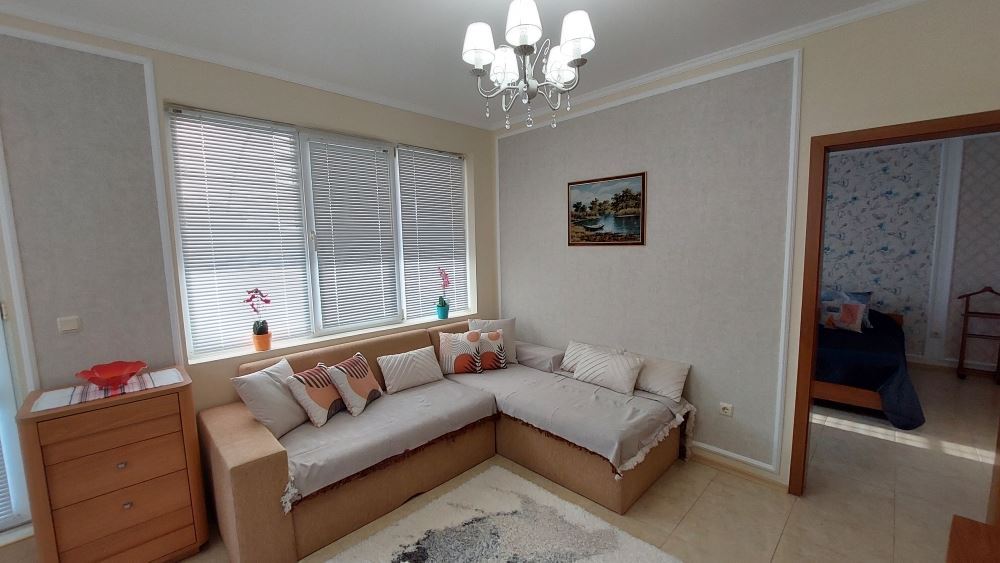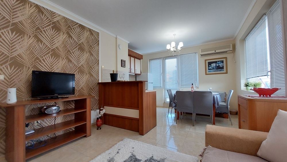 A magnificent one bedroom apartment in the central part of Pomorie, just 200 meters from the sea, is an attractive offer for those who are looking for comfortable and modern accommodation. The apartment is located just 200 meters from the sea. This provides easy access to the beach and proximity to many cafes, restaurants and stores. The apartment offers a spacious layout and floor space, providing a comfortable living space. It consists of a corridor, a large living room with kitchen and dining area, a bedroom, two bathrooms and a spacious balcony with separate areas to enjoy the views and fresh air. Fully furnished with quality modern furniture, which gives it style and comfort. Expensive renovations ensure a high quality finish. The lack of service charges can be an attractive factor for buyers as it saves on additional costs. Separate utility bills, which gives you control over your expenses to avoid unexpected surprises in the bills.
