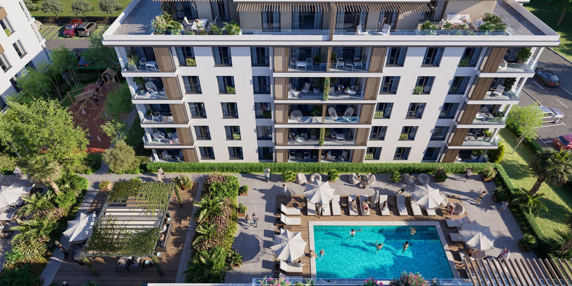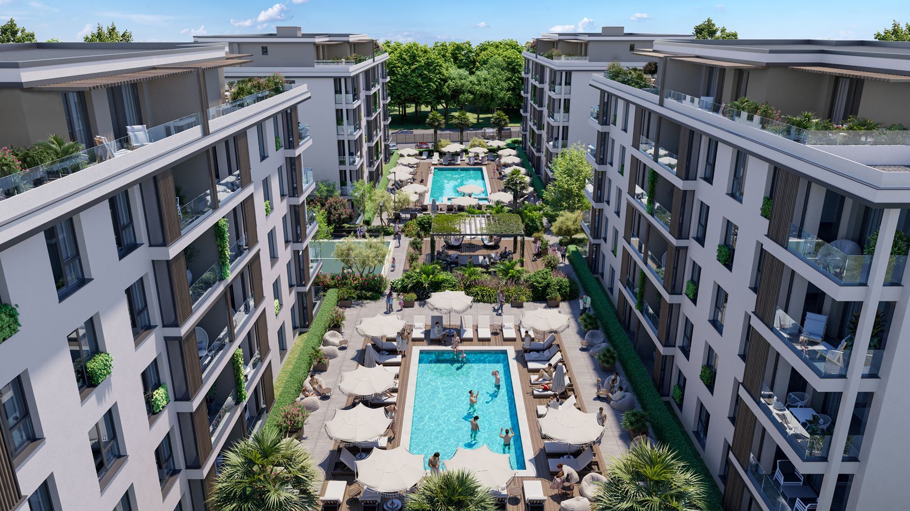 The complex consists of four elegant buildings with a total of around 200 apartments, designed with attention to functionality, natural light, and a sense of space. It offers one- and two-bedroom apartments, with one or two bathrooms, as well as penthouses, with all properties delivered fully finished “turnkey”, allowing quick and hassle-free move-in or rental.
