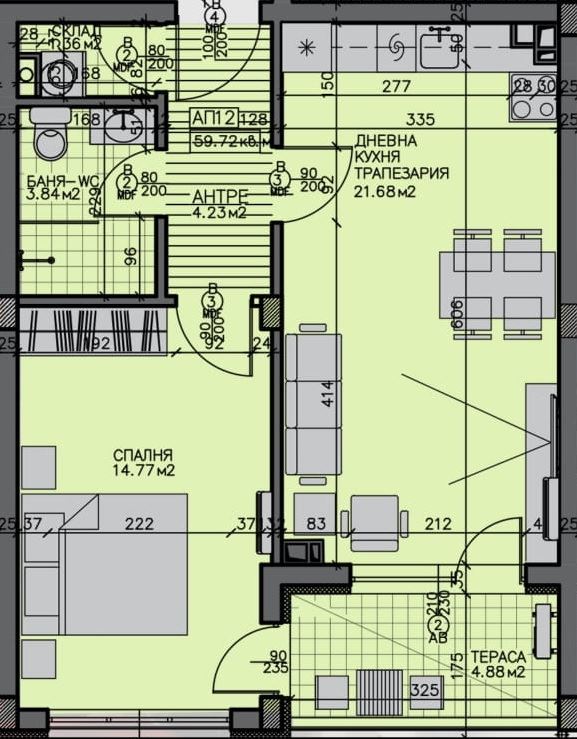 We present a modern one-bedroom apartment with an area of 71.42 m², located on the fourth floor of a contemporary residential building in the prestigious Zornitsa residential district in Burgas. The property is part of a new modern development, designed with the comfort of future owners in mind, combining modern design, functionality, and a strategic location.