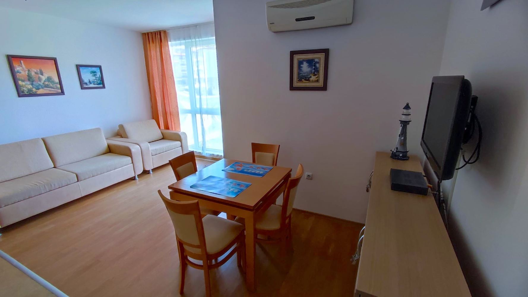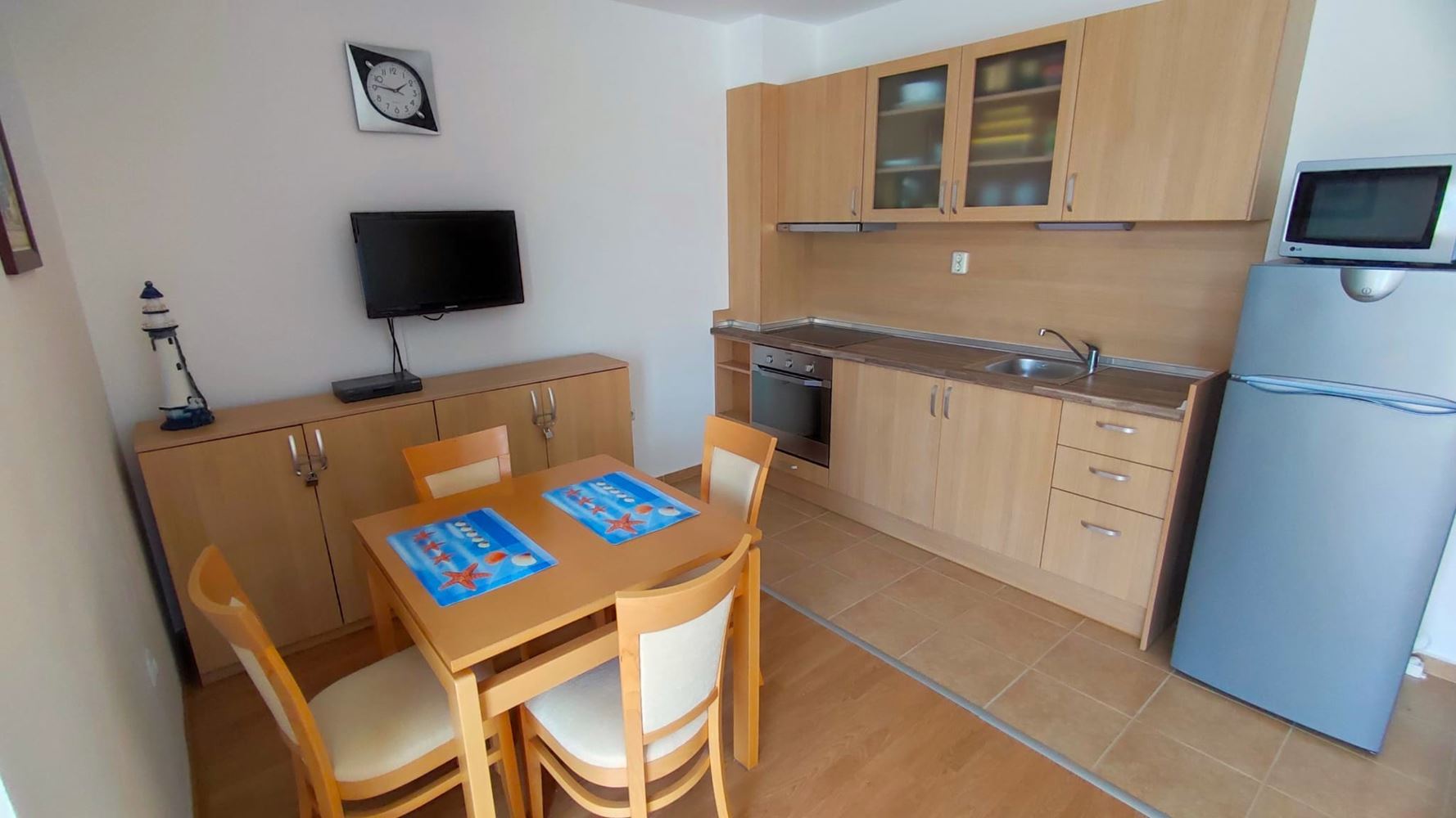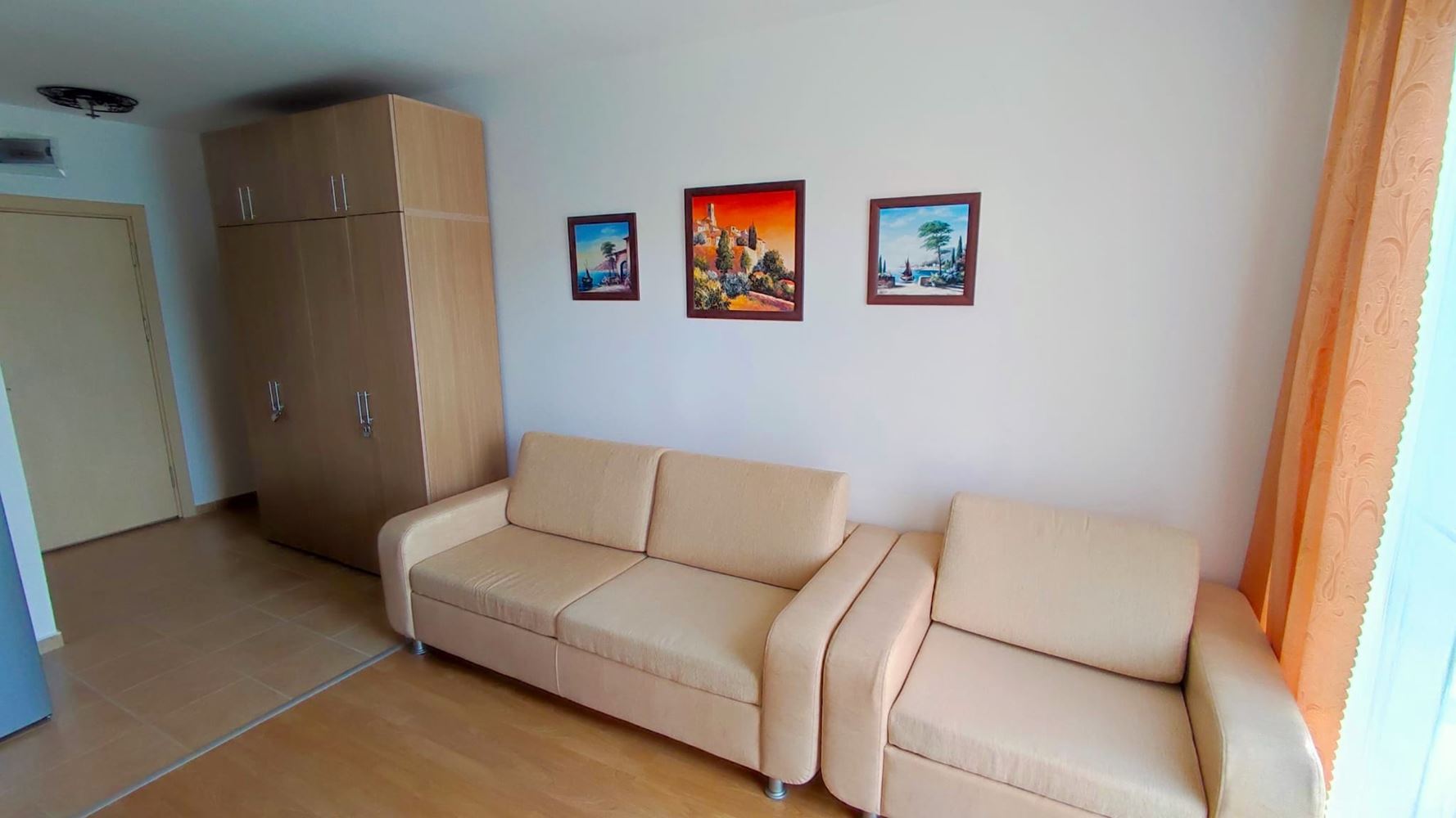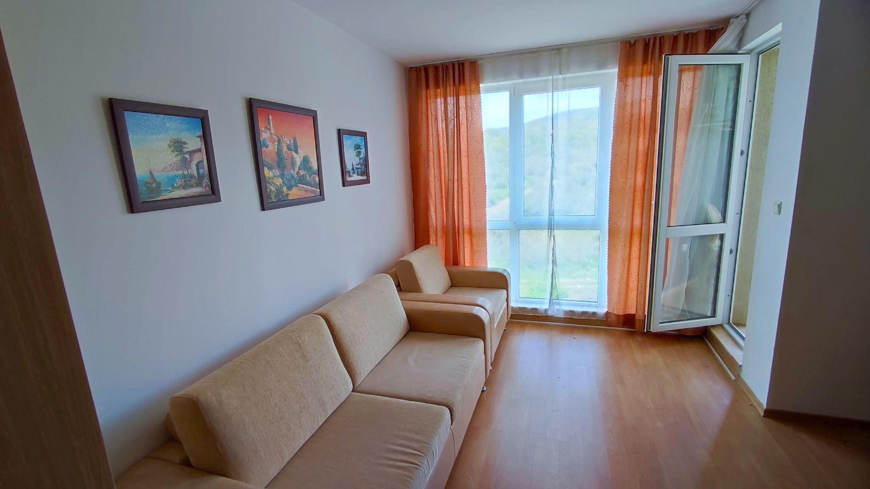 For sale is a studio flat in Sveti Vlas, in a complex located 500 meters from the beach. Most of the flats have magnificent view to the sea, the ancient town of Nessebar and Sunny Beach Resort. Other flats have magnificent view to the mountain, because the complex is located on a picturesque hill. The complex has a swimming pool, children's playground, parking, round-the-clock security and maintenance of the complex. The flat to be considered is located on the third floor and has an area of 40 m2. It is sold with furniture, appliances and equipment. The complex is completed and all commissioning documents are available, including Act 16 which is required for a visa.