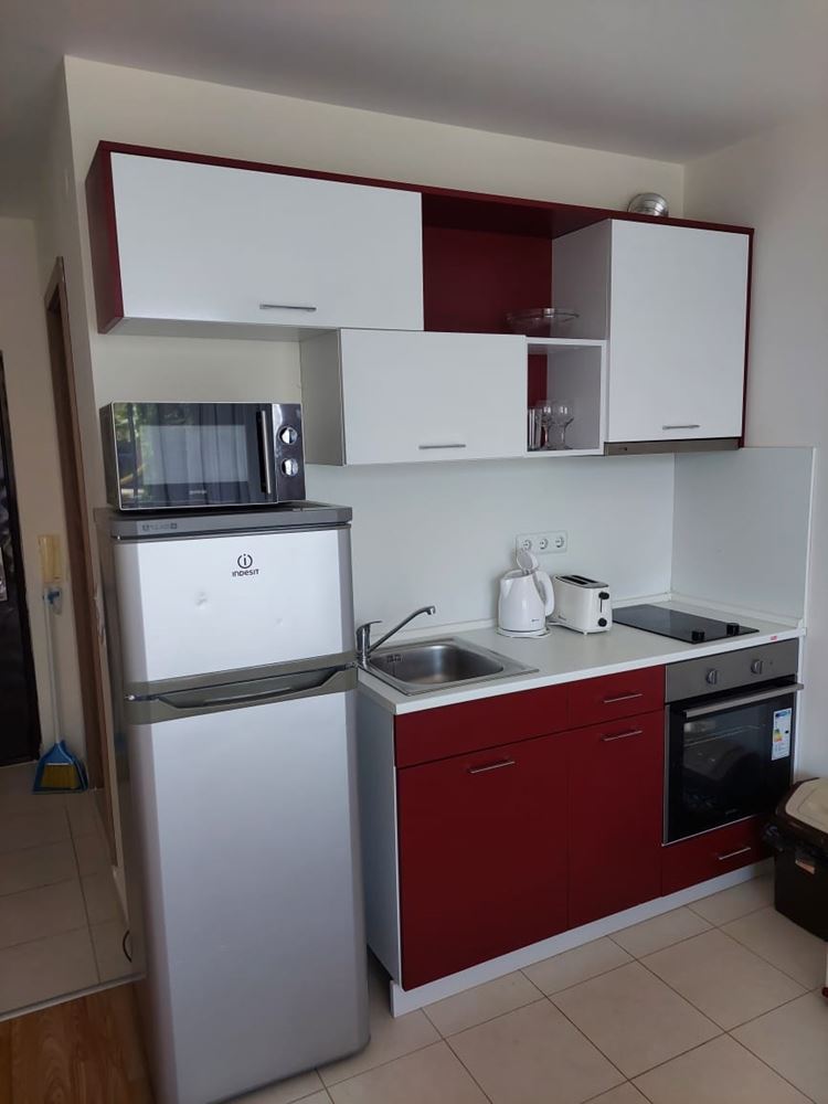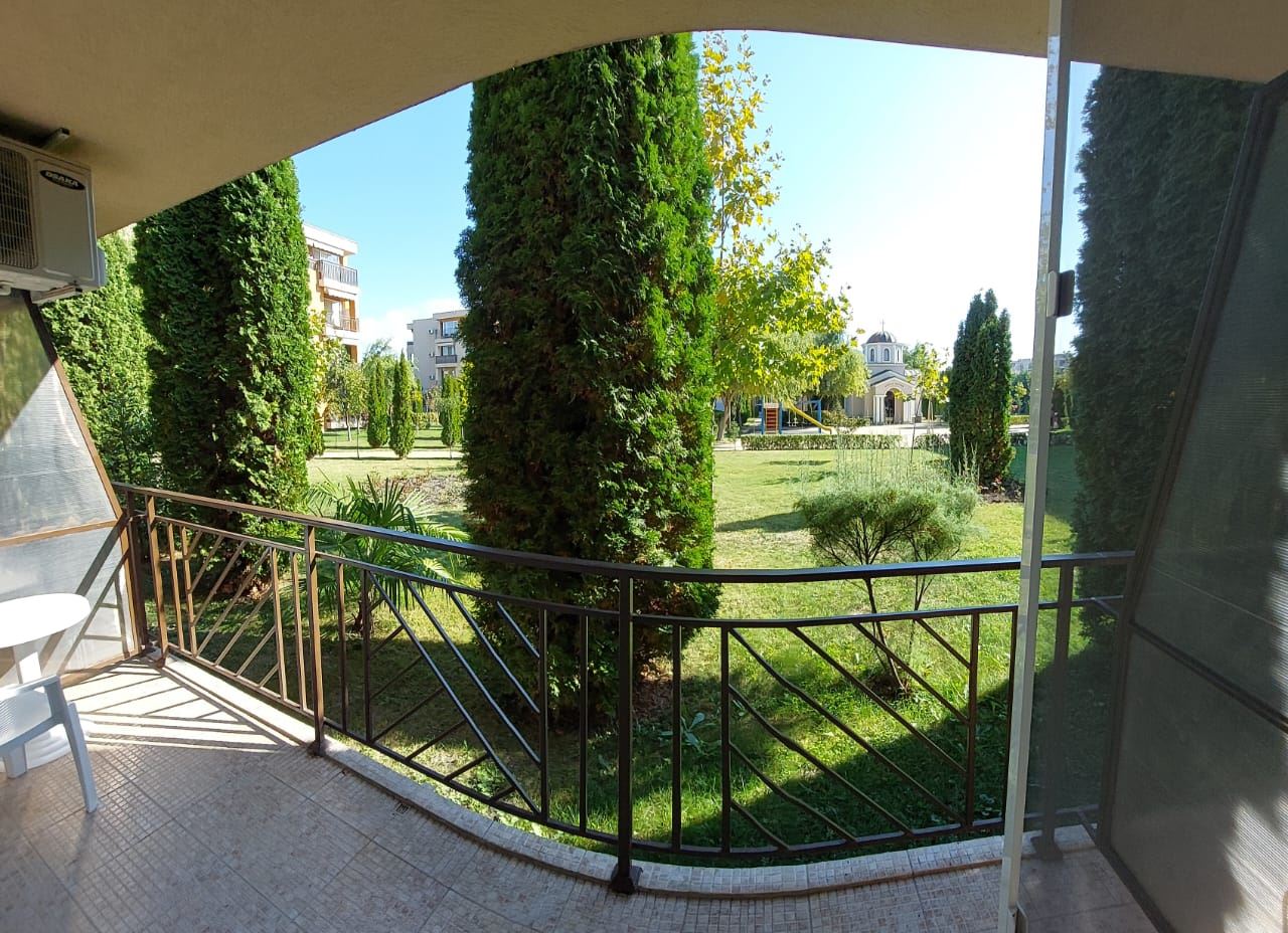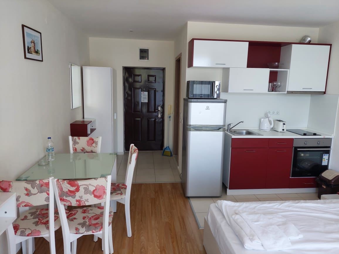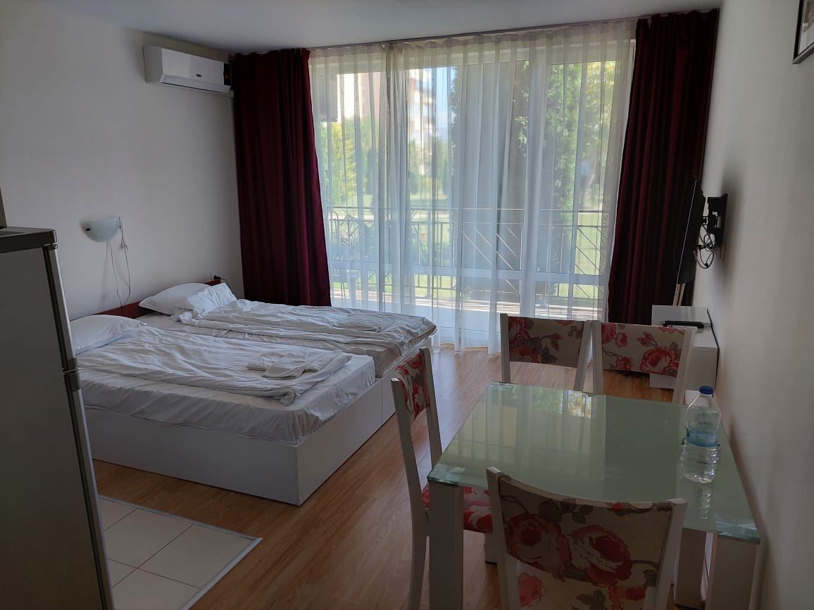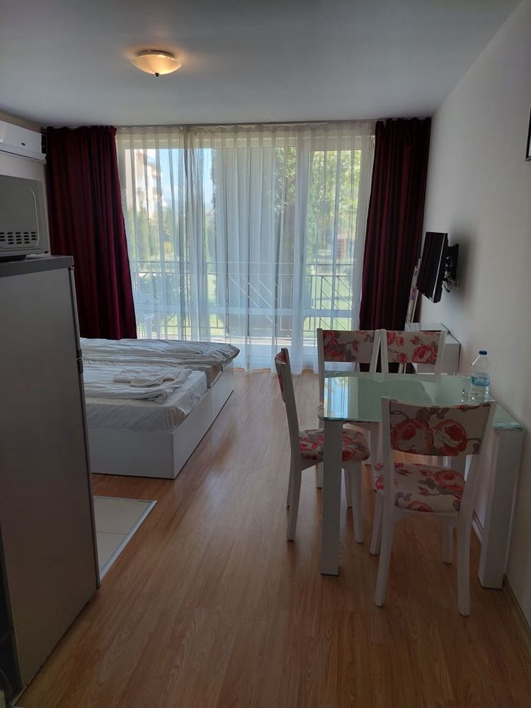 A cosy fully furnished studio in a gated complex in Sunny Beach provides ideal conditions for a comfortable stay just ten minutes walk from the sea. With an area of 40 square metres, this studio is ideal for permanent living. Placed on a parterre, the studio provides easy access and convenience of movement. The windows overlook a cosy courtyard, creating an atmosphere of privacy and tranquility. The accommodation is move-in ready, allowing you to instantly enjoy your time at the resort. The complex in which the studio is located provides extensive amenities for a variety of holidays. There are adult and children's swimming pools, water slides, two restaurants, a shop, spa, tennis court, golf course, playgrounds and laundry facilities. You will be able to enjoy outdoor activities right within the confines of your apartment complex. The complex also offers security with a gated community, which is especially important for family holidays. There is a large supermarket, cafes, Aqua Park nearby, making your stay as convenient and carefree as possible. All these factors make this studio an ideal place for a family holiday, where you can enjoy proximity to the sea, a variety of entertainment and the comfort of your own home.