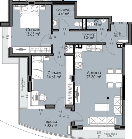 The apartment features an excellent functional layout, including a spacious corridor, bright living room with kitchen area, two separate bedrooms, a bathroom with toilet, an additional toilet, and a terrace suitable for a relaxation corner or a small green zone. The living area is designed to maximize a sense of space and allows for a comfortable living room and dining area setup. The two bedrooms offer flexibility – a master bedroom and a children’s room, office, or guest room, according to the needs of the future owners.