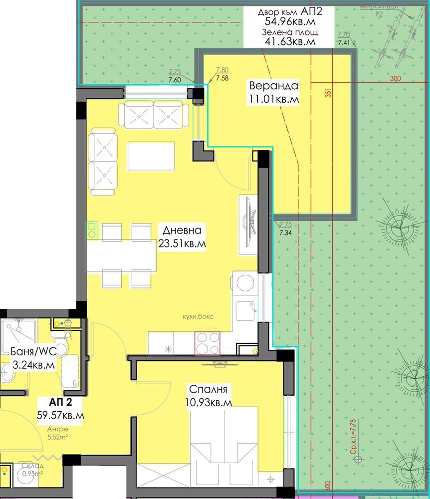 This new one bedroom apartament in a small apartment building in the Kraimorie neighbourhood of Burgas is an attractive accommodation in a new and developing area. The apartament is located on the parterre and offers a total area of 114,53 m2. Upon entering the apartament you are welcomed into a spacious entrance hall which provides easy access to the rest of the rooms. The bedroom provides a private space for relaxation, while the living room with kitchen creates a common area for socialising and cooking. A sanitary unit, a pantry and a veranda complete the functionality of the apartament. A special feature of this apartament is the 54.96 m2 private courtyard, which provides a great place for open evenings and outdoor relaxation. The apartament is sold unfurnished but ready to be finished, which gives the future owner the opportunity to realise his design ideas and preferences in interior decoration. The location of the building near all infrastructure makes this place convenient for life. The developing Kraimorie neighbourhood provides access to all necessary amenities and creates a pleasant atmosphere for comfortable living.