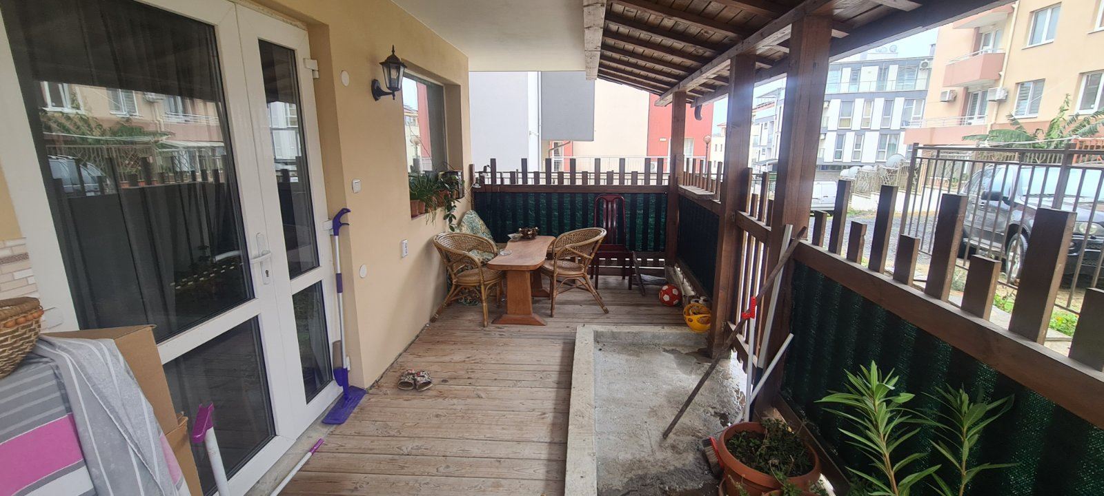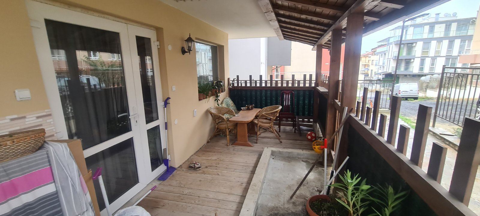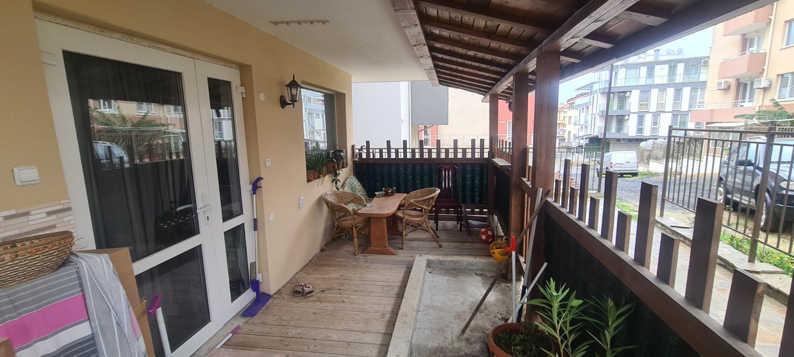 This one bedroom apartament in a residential building with no service tax is a comfortable and functional accommodation. Located on the ground floor, it provides easy access. The building is also equipped with a lift, which is convenient for residents. The apartament has two non-transitional rooms, providing a cosy division of space. From the living room there is direct access to the courtyard, where there is a spacious enclosed veranda of about 20 square metres. This veranda serves as a private courtyard for the apartament and can be continued in front of the bedroom, creating an additional space for outdoor relaxation. From the veranda there is access to the courtyard which also provides access to the street. The cul-de-sac provides a tranquil setting and has space for parking. An important element of the courtyard is the communal barbecue for use by all neighbours. The building is maintenance free which is an attractive factor. It is located in a new part of Sozopol with year-round access. The area is already equipped with necessary infrastructure including supermarkets, cafes, restaurants, shops, clubs, pharmacies and banks. The proximity to Harmani beach makes it ideal for lovers of seaside holidays. It is important to note that the neighbourhood is also attractive for tourists who prefer peace and quiet. New public buildings, a hospital, a library and a bus station add to the comfort of the neighbourhood.