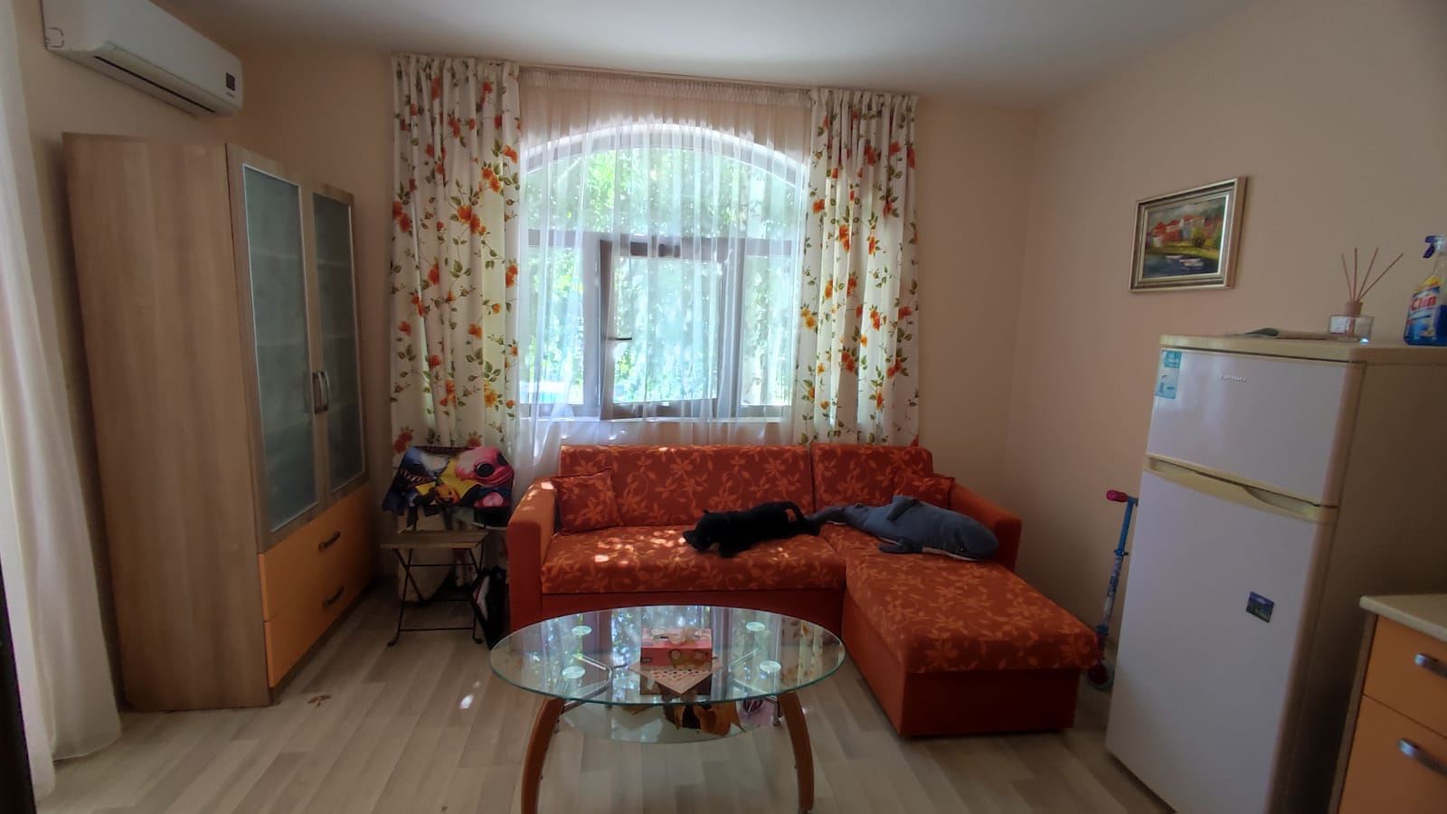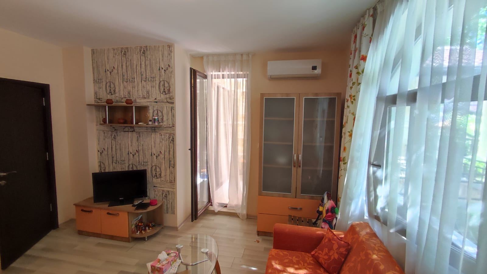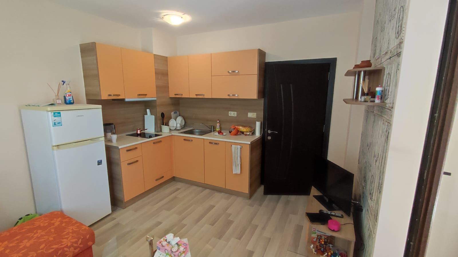 One bedroom furnished flat in a beautiful residential complex with its own convenient infrastructure, built in a new, rapidly developing area of Nessebar, a UNESCO World Heritage Site. The complex is located just 300 meters from the beautiful sandy beach and 2 km from the centre of Nessebar. All necessary infrastructure for a complete life is in walking distance. The water park is 500 m away from the complex. The flat of 55 m2 is located on the low ground floor. It consists of one bedroom, living room with kitchen, bathroom with WC and a cozy terrace with direct access to the grounds and pool. The flat is in excellent condition and ready to move in.