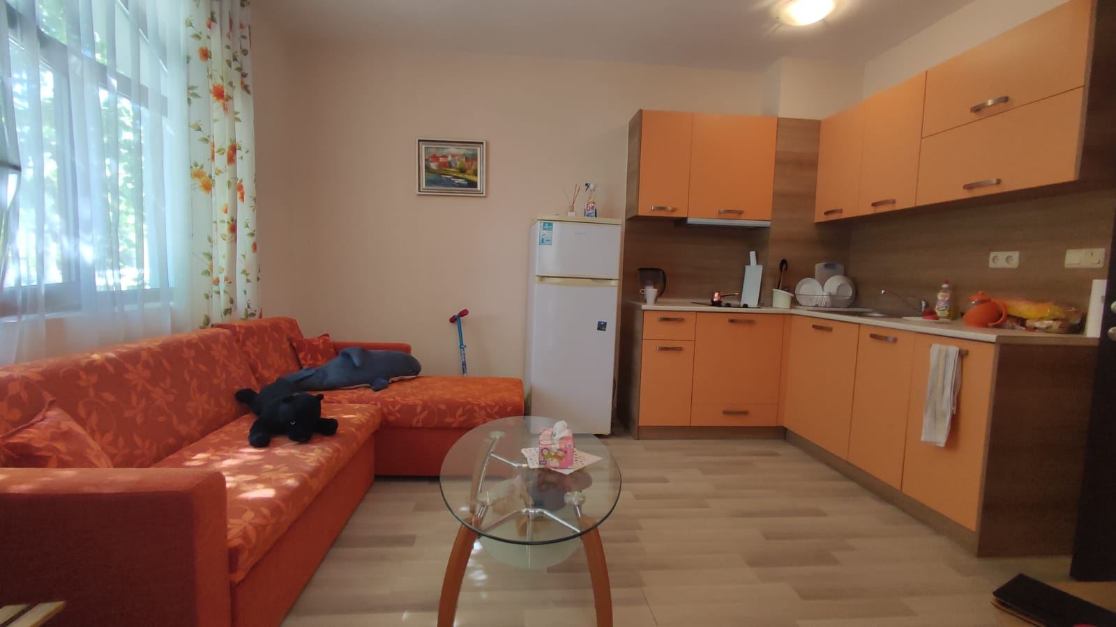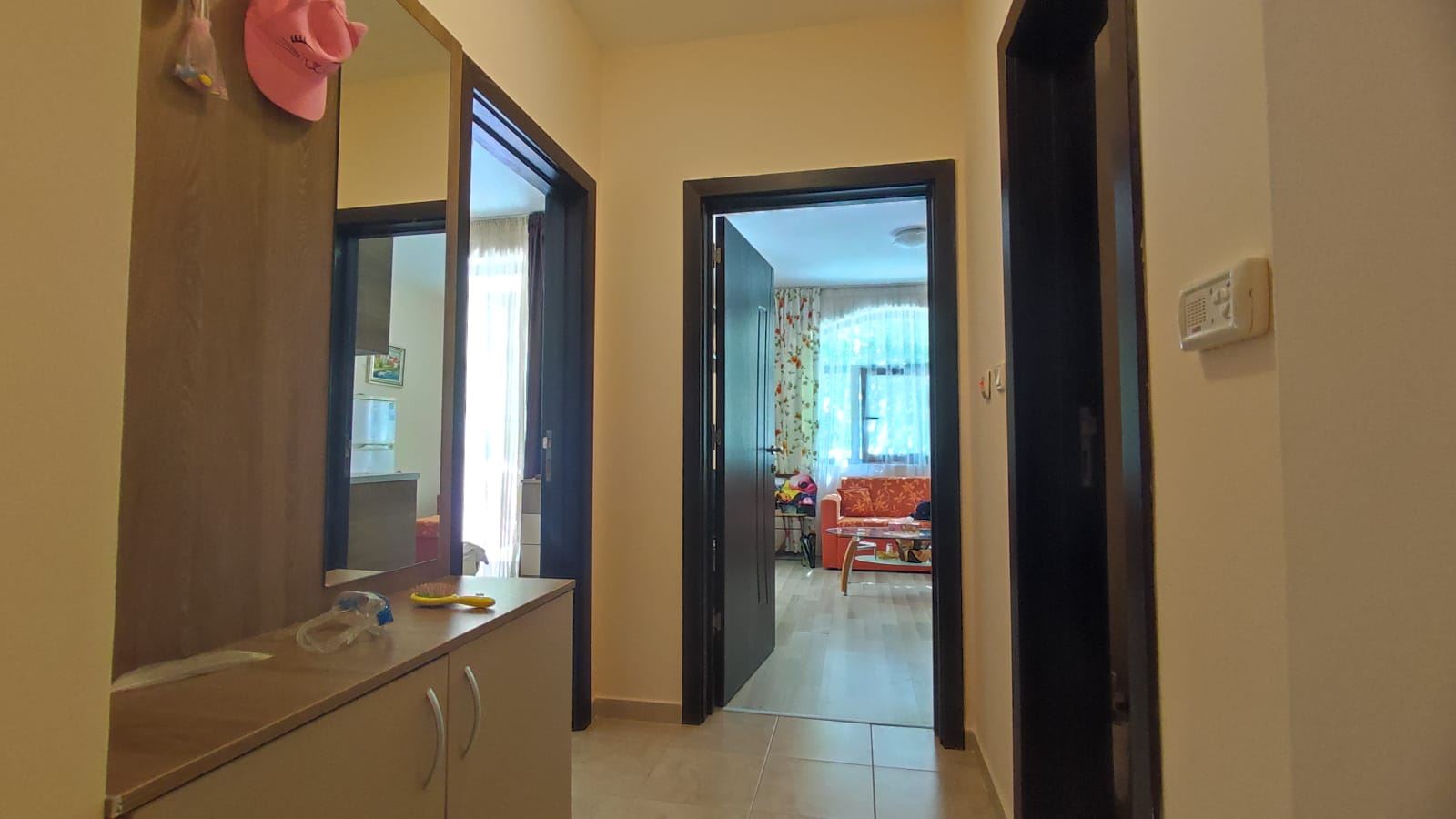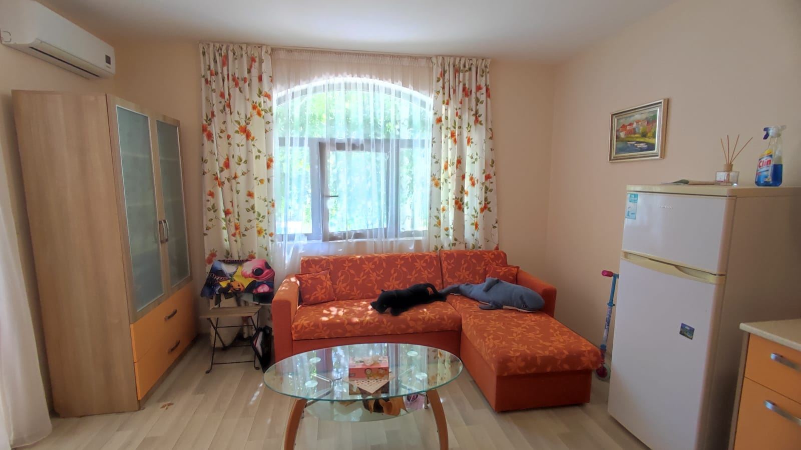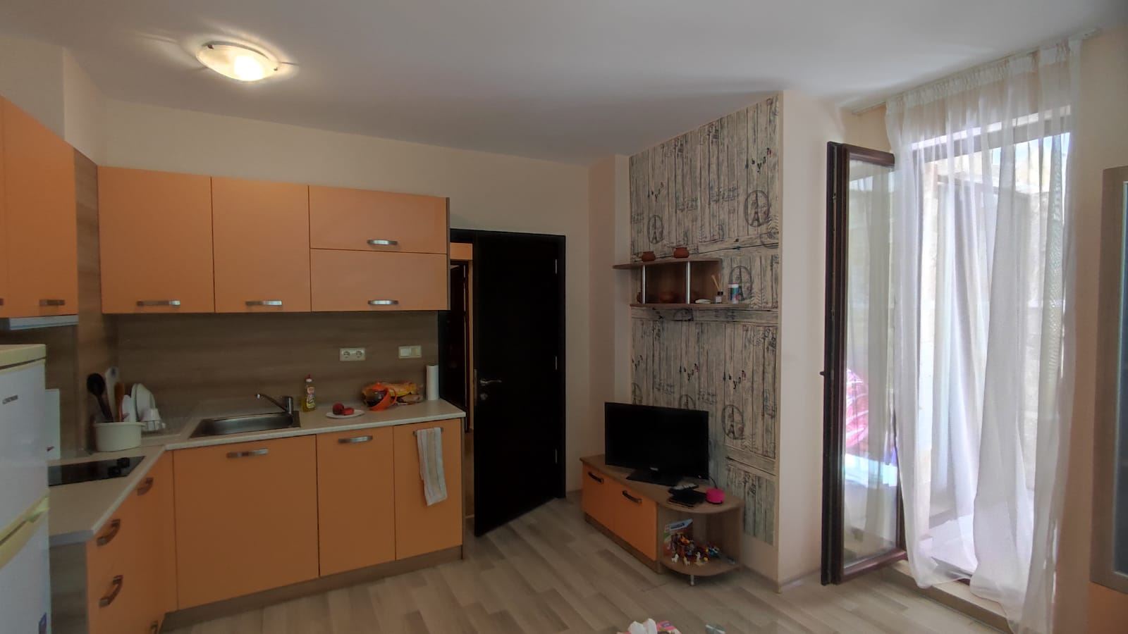 One bedroom furnished flat in a beautiful residential complex with its own convenient infrastructure, built in a new, rapidly developing area of Nessebar, a UNESCO World Heritage Site. The complex is located just 300 meters from the beautiful sandy beach and 2 km from the centre of Nessebar. All necessary infrastructure for a complete life is in walking distance. The water park is 500 m away from the complex. The flat of 55 m2 is located on the low ground floor. It consists of one bedroom, living room with kitchen, bathroom with WC and a cozy terrace with direct access to the grounds and pool. The flat is in excellent condition and ready to move in.