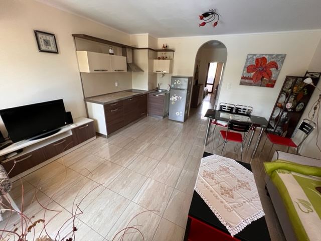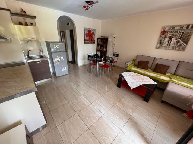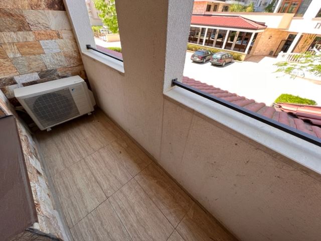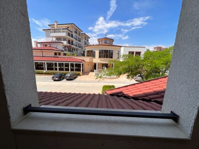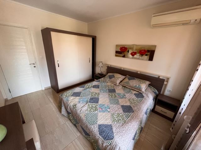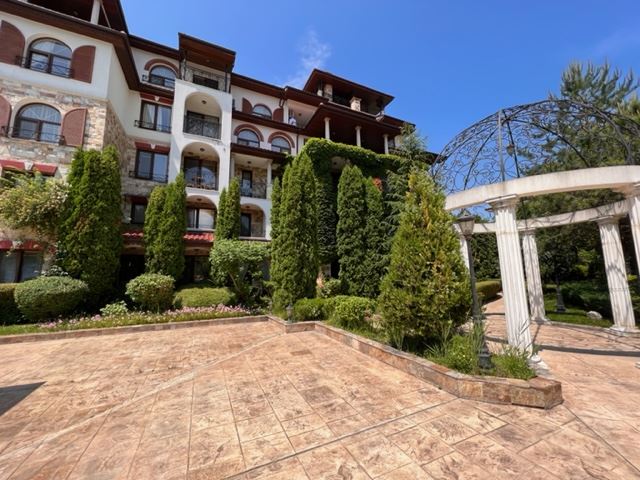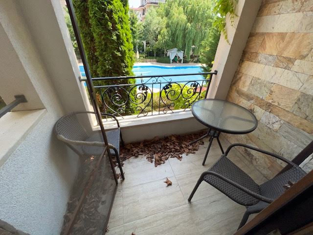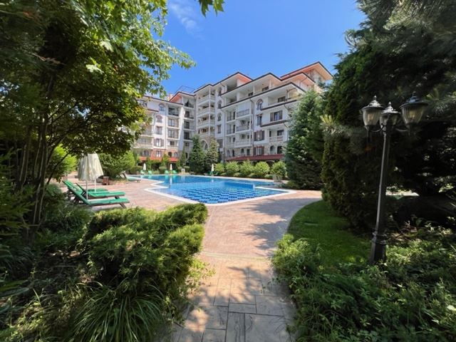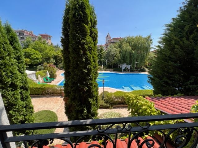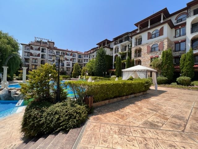 One-bedroom flat in a complex with striking architecture. It is ideal for those who love comfort and luxury. The complex has excellent infrastructure including its own garden with fountains, parks, sculptures, art gallery, two heated swimming pools, Jacuzzi and hydro massage, umbrellas and sun loungers, mini golf, lighted tennis court and BBQ area, restaurants, mini hotel, lobby bar, management company office, reception, 24 hour concierge service, parking, security and video surveillance. There is also a SPA centre, a hairdresser's, a playground, a children's room, billiards and a fitness room. The offered flat has a size 65m2 and consists of a corridor, living room with a kitchen area, a bedroom, a bathroom with WC and two balconies. The flat is equipped with quality furniture and appliances.