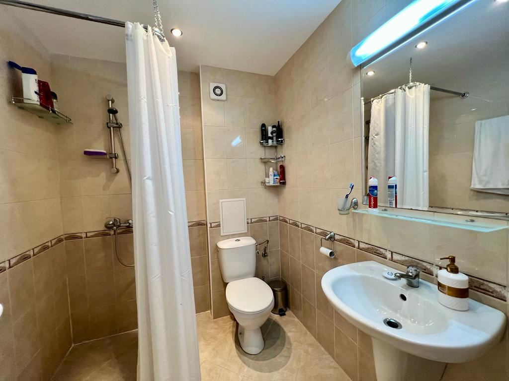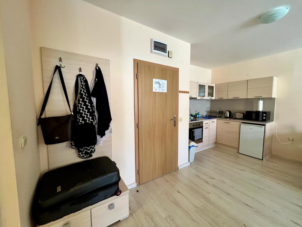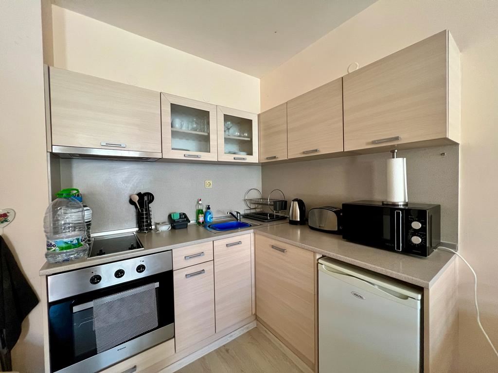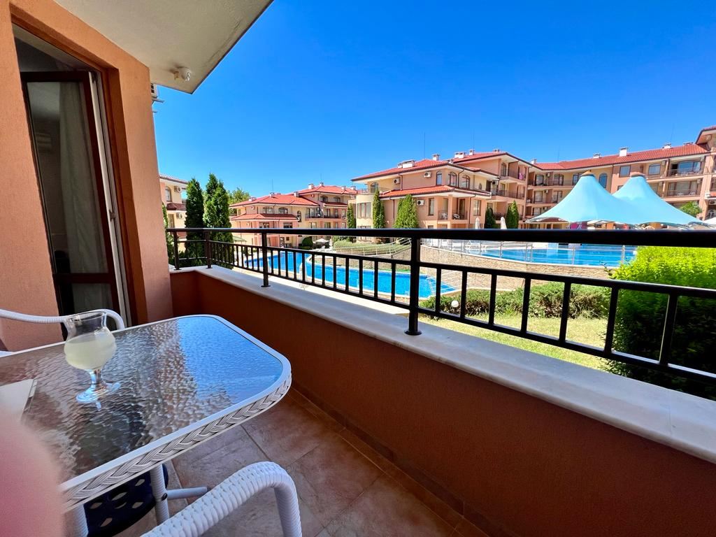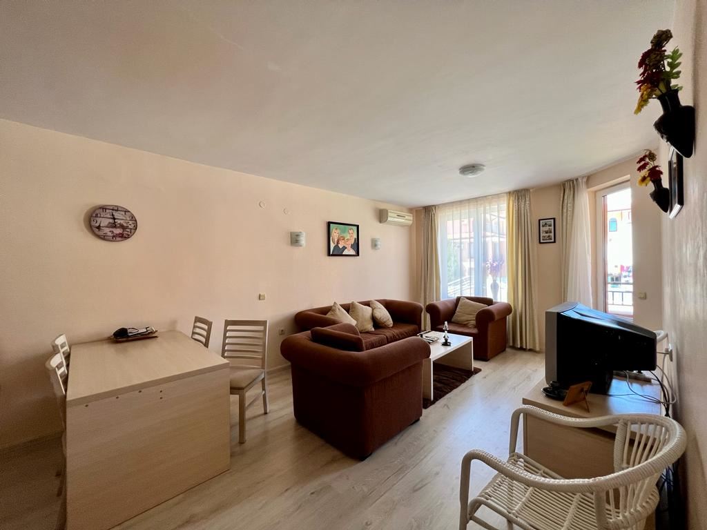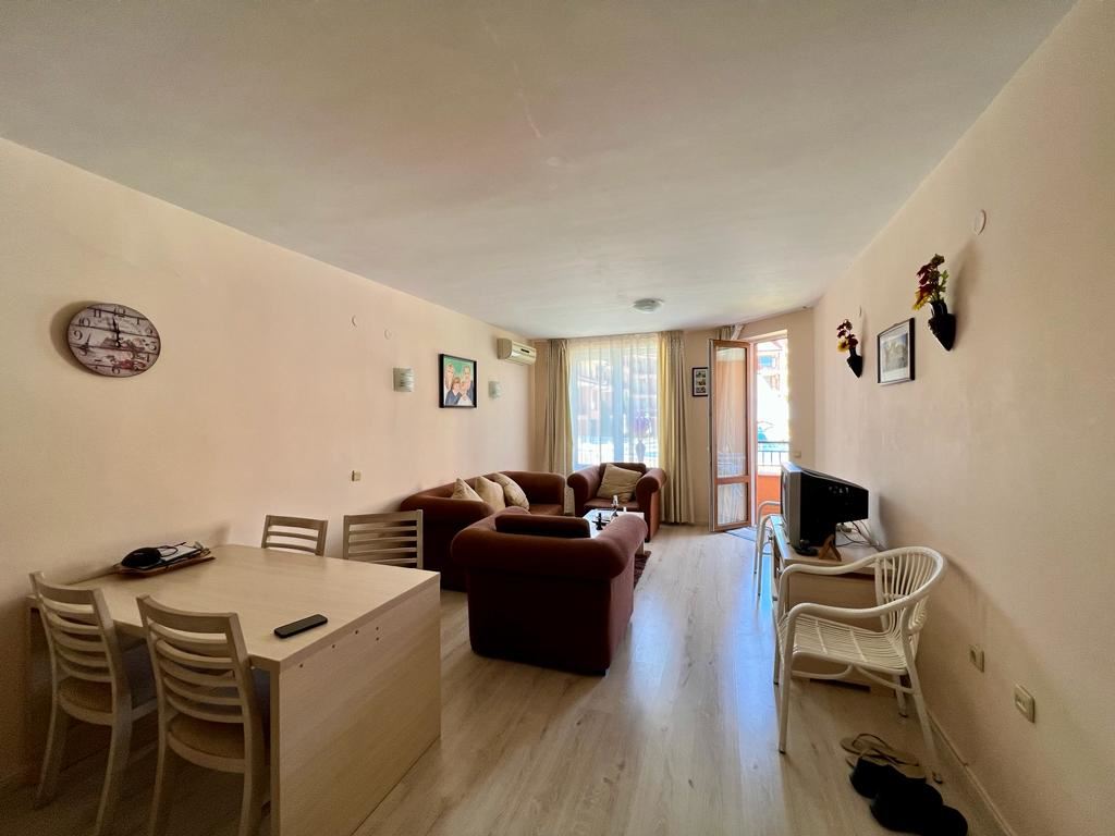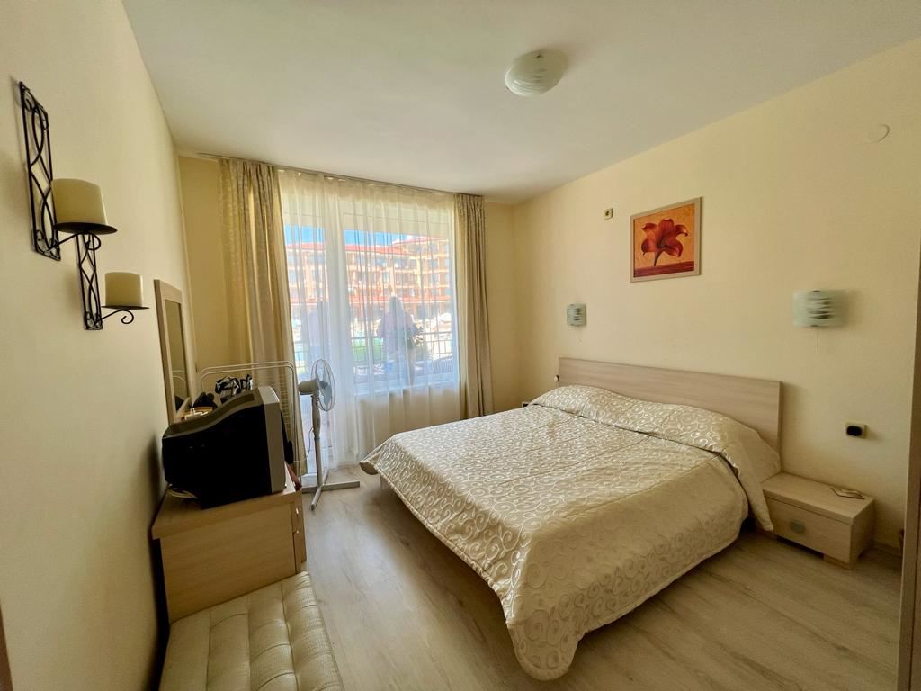 Wonderful one-bedroom apartament in a great complex 100 m away from the sea, near the centre of St. Vlas. The flat of 65 m2 is located on the ground floor in a building with a lift. The flat has a living room with zoned kitchen, bedroom, bathroom with shower, spacious balcony. Comfortable complex is located in the picturesque area of St. Vlas. The area is beautiful and quiet and is suitable for a quiet summer holiday or permanent year-round residence. There is a public transport stop, a large market, shops, cafes and restaurants and other infrastructure. The complex has two swimming pools for adults, one pool for children, pool bar, lobby bar, restaurant, playground, shops, supermarket, reception, and security.
