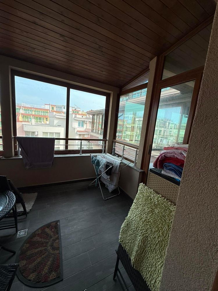 We present to you a one-bedroom apartment with an area of 57 m², located on the sixth floor (not the top floor) in a luxury building in one of the most preferred areas of Pomorie, only 100 meters from the beach. The property combines an excellent location, comfort, and readiness for immediate use. The apartment has a functional layout, including a corridor, bright living room with kitchenette, cozy bedroom, bathroom with toilet, and two terraces, which provide additional space and comfort. The terrace to the bedroom is glazed, making it suitable for use in all seasons.