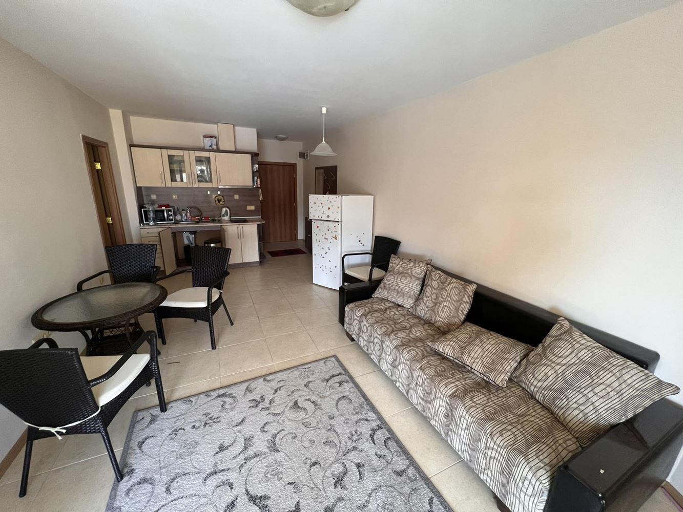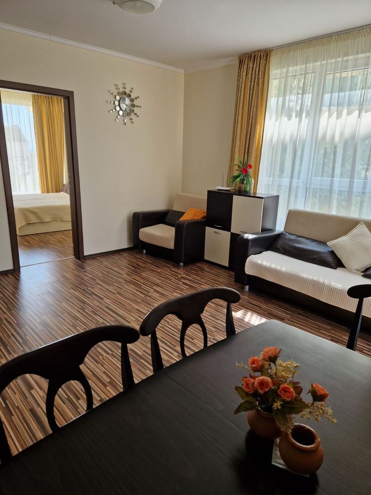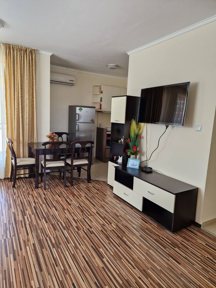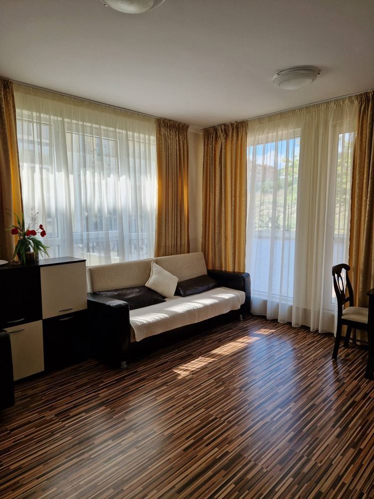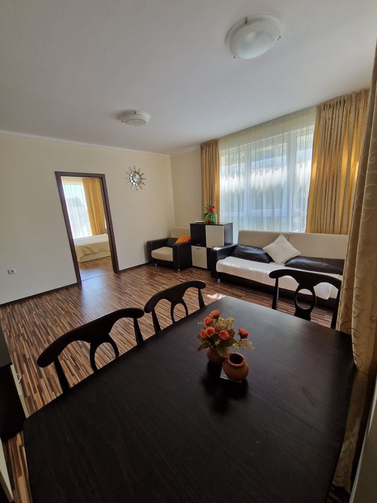 One bedroom apartment in a magnificent residential complex with all amenities, which is located in a quiet picturesque location in the resort town of Sveti Vlas, 500 meters from the sea and sandy beach and 1.5 km from the yacht harbor. It consists of two five-storey buildings of modern architecture with elevators. The roof of the building is exploited, with a cafe and solarium. In walking distance from the complex is located all the necessary urban infrastructure: stores, restaurants, green areas, kindergarten, playgrounds, a beautiful promenade and other amenities. The apartment, which is offered for sale, has an area of 60 m2, located on the second floor. Fully furnished and equipped, ready to move in.