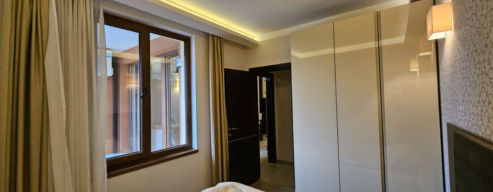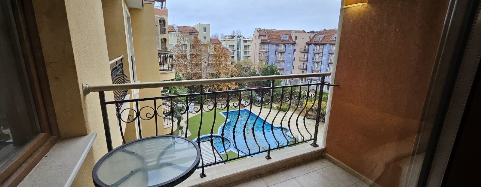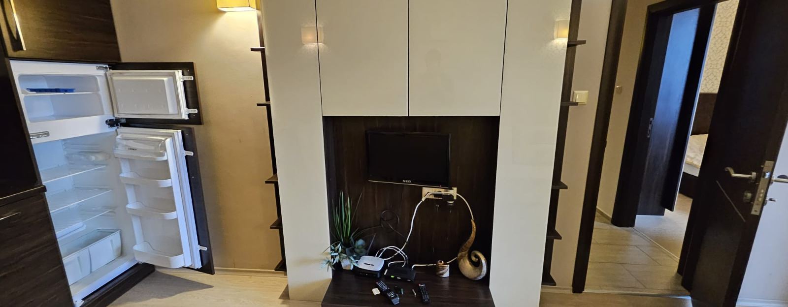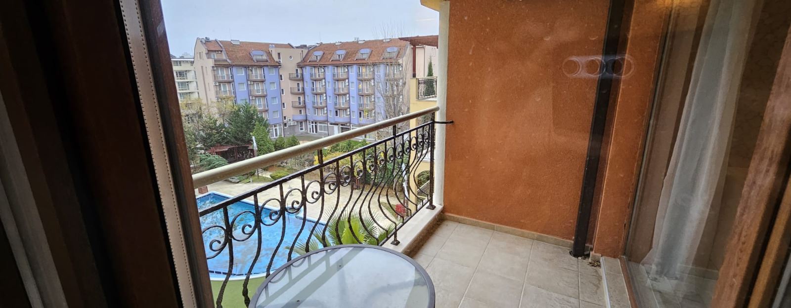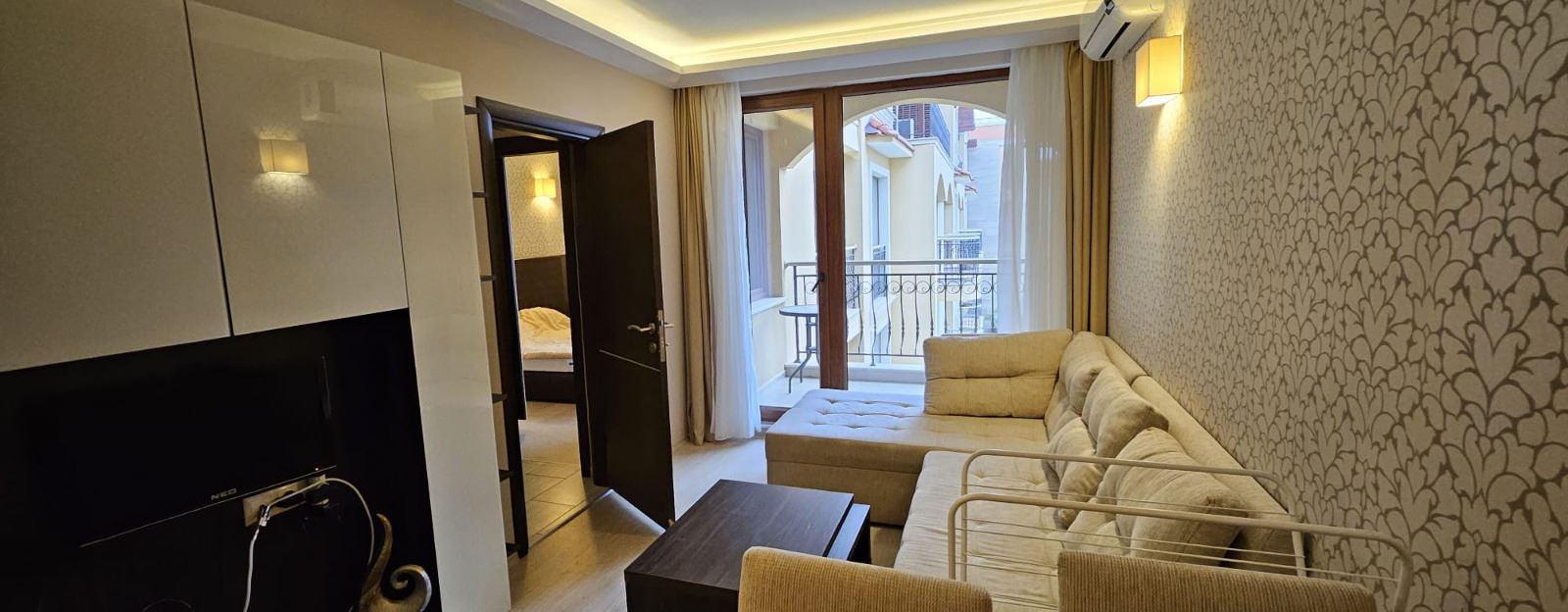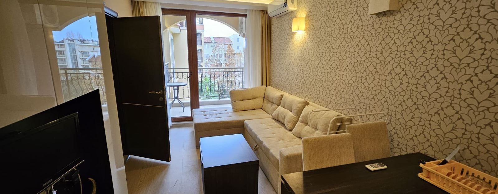 This one bedroom apartment represents a unique opportunity to live in a magnificent complex in Sunny Beach resort, which combines comfort and a variety of amenities. The 54.68 m2 apartment offers a cosy and stylish space for your comfort. The layout comprises an entrance hall, a bedroom for peace and relaxation and a spacious living room combined with a kitchenette. This creates an open and harmonious environment, ideal for a modern lifestyle. The bathroom with toilet is equipped with modern amenities, ensuring a comfortable standard of living. Also at your disposal is a terrace where you can enjoy the fresh air and beautiful views, especially being on the 5th floor. Living in this complex you will have access to a variety of infrastructure. There are swimming pools, sports facilities, recreation areas, as well as concierge and security services for your peace of mind. This 54.68 m2 apartment is located on the 5th floor and offers beautiful views of the surrounding area, creating a kind of isolation from the hustle and bustle of the city. This is the perfect place for those looking for a combination of comfort and uniqueness in accommodation in the popular resort of Sunny Beach.