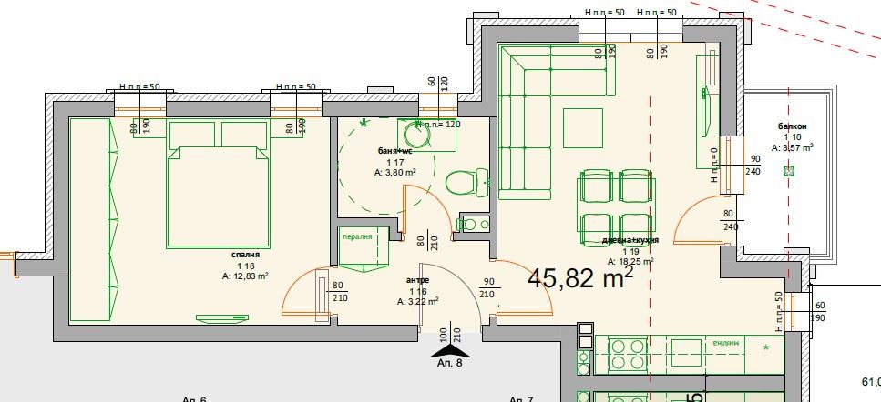 - Layout: living room with kitchenette, bedroom, bathroom/WC, 1 balcony