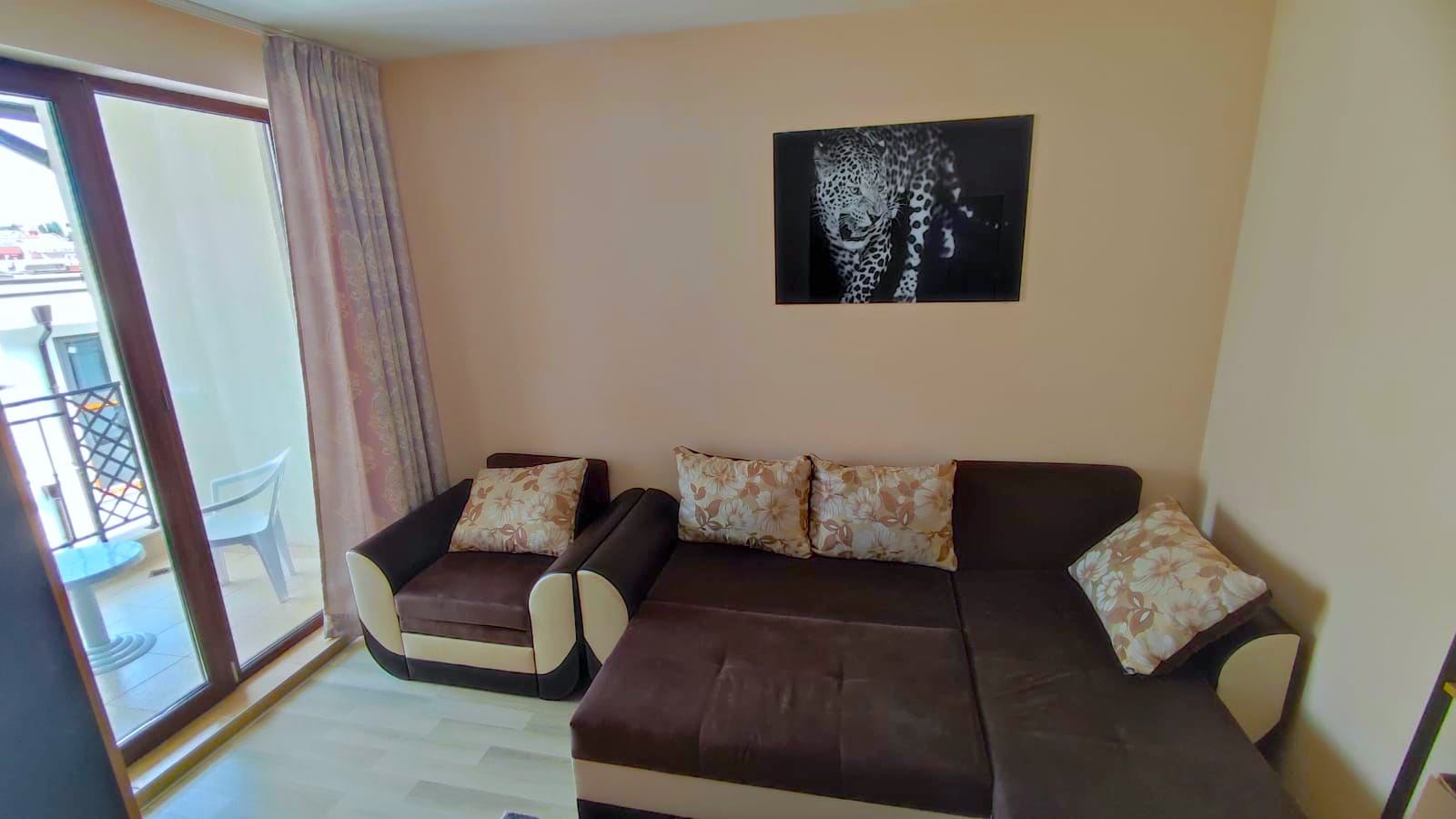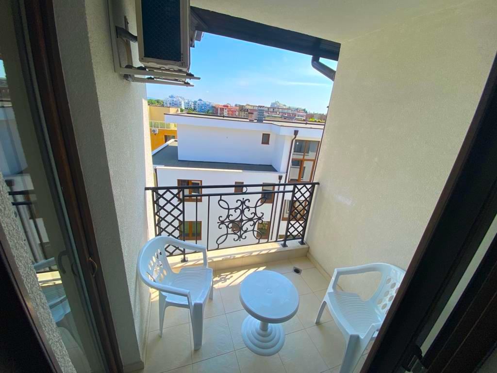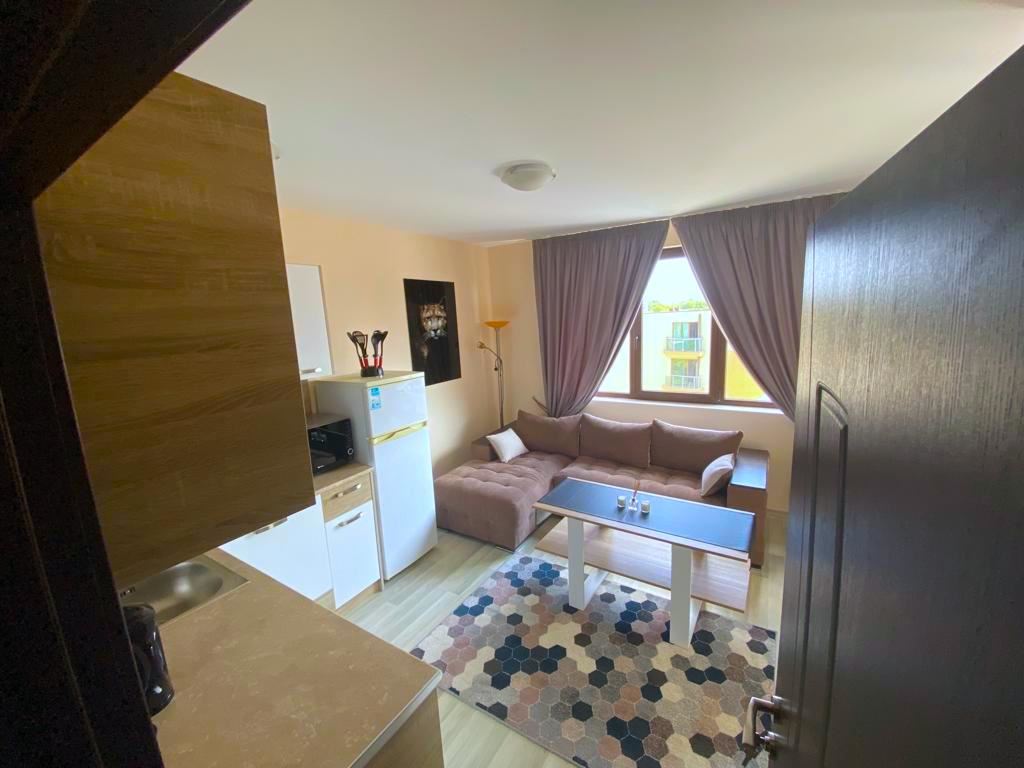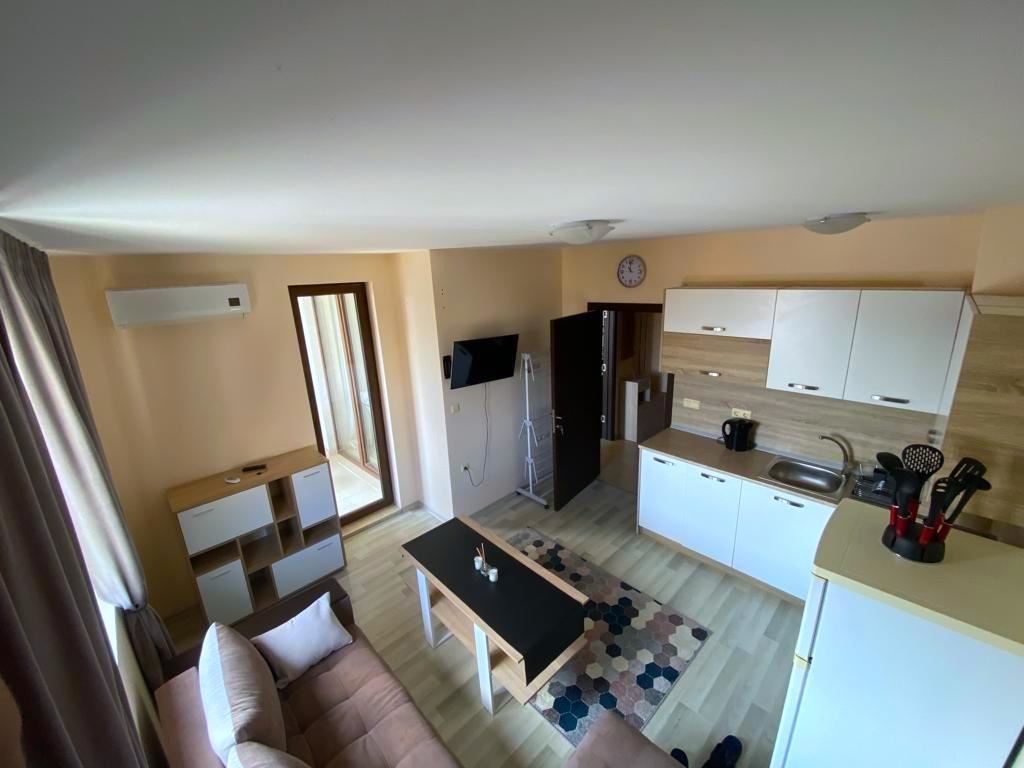 One bedroom flat in Nessebar in a luxury gated complex. The complex is only 300 m away from the beautiful sandy beach and 300 m away from Aqua Park. There are shops, cafes, restaurants, places of amusement and a public transport stop near the complex. The offered flat is located on the fifth floor and has a size of 55 m2. It consists of a living room with open plan kitchen area, bedroom, bathroom with WC and a balcony overlooking the city. The flat is being sold fully finished, furnished and equipped. The complex has swimming pools, restaurants, fitness centre, tennis court, Russian billiards, children's room, children's and sports playgrounds, security, parking, gated community.