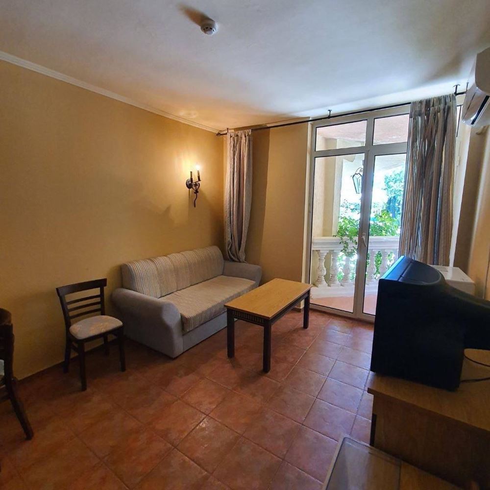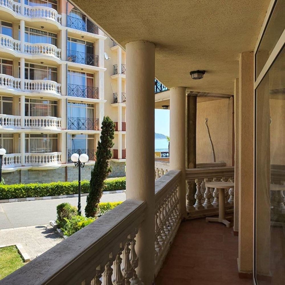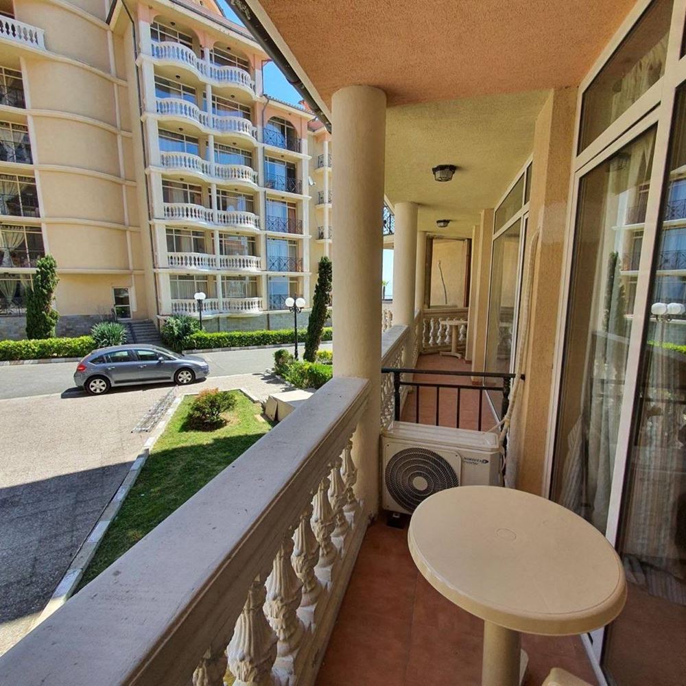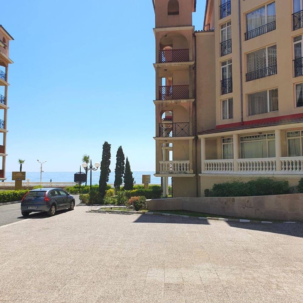 One bedroom furnished first line apartment with beautiful sea views in a luxury complex. This complex is ideal for those who enjoy a quiet and harmonious holiday with their family, away from the bustling city. Facilities include swimming pool, children's slides, restaurant, mini-golf, shop, parking. The flat consists of living room with kitchen, bedroom, bathroom with WC, entrance hall and balcony with sea view. The apartment is fully furnished, with all appliances and amenities. The total living area is 55 m2 and it is located on the ground floor. The complex is surrounded by bars, taverns, discos, restaurants and shops. Close by you will find Aqua Park, surfing school, heliport. This cosy, modern complex is situated in a beautiful summer garden.