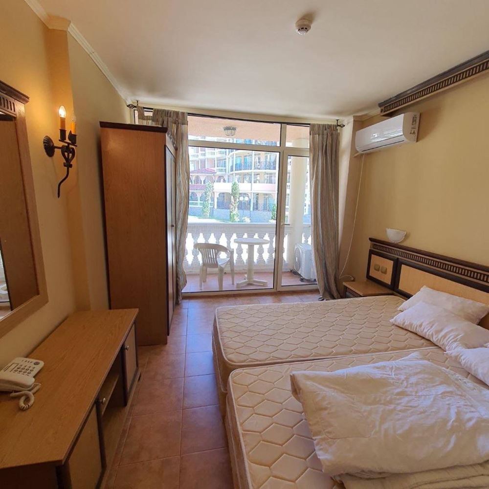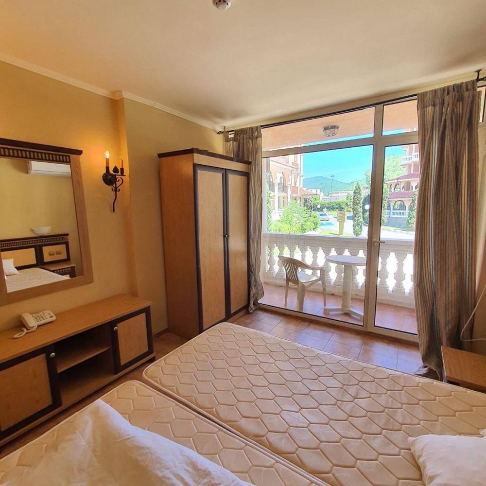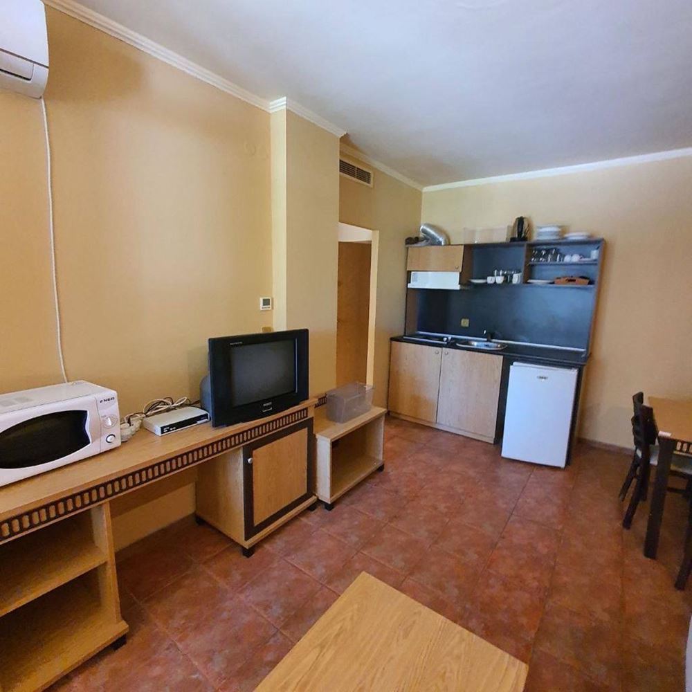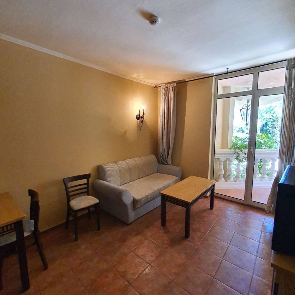 One bedroom furnished first line apartment with beautiful sea views in a luxury complex. This complex is ideal for those who enjoy a quiet and harmonious holiday with their family, away from the bustling city. Facilities include swimming pool, children's slides, restaurant, mini-golf, shop, parking. The flat consists of living room with kitchen, bedroom, bathroom with WC, entrance hall and balcony with sea view. The apartment is fully furnished, with all appliances and amenities. The total living area is 55 m2 and it is located on the ground floor. The complex is surrounded by bars, taverns, discos, restaurants and shops. Close by you will find Aqua Park, surfing school, heliport. This cosy, modern complex is situated in a beautiful summer garden.