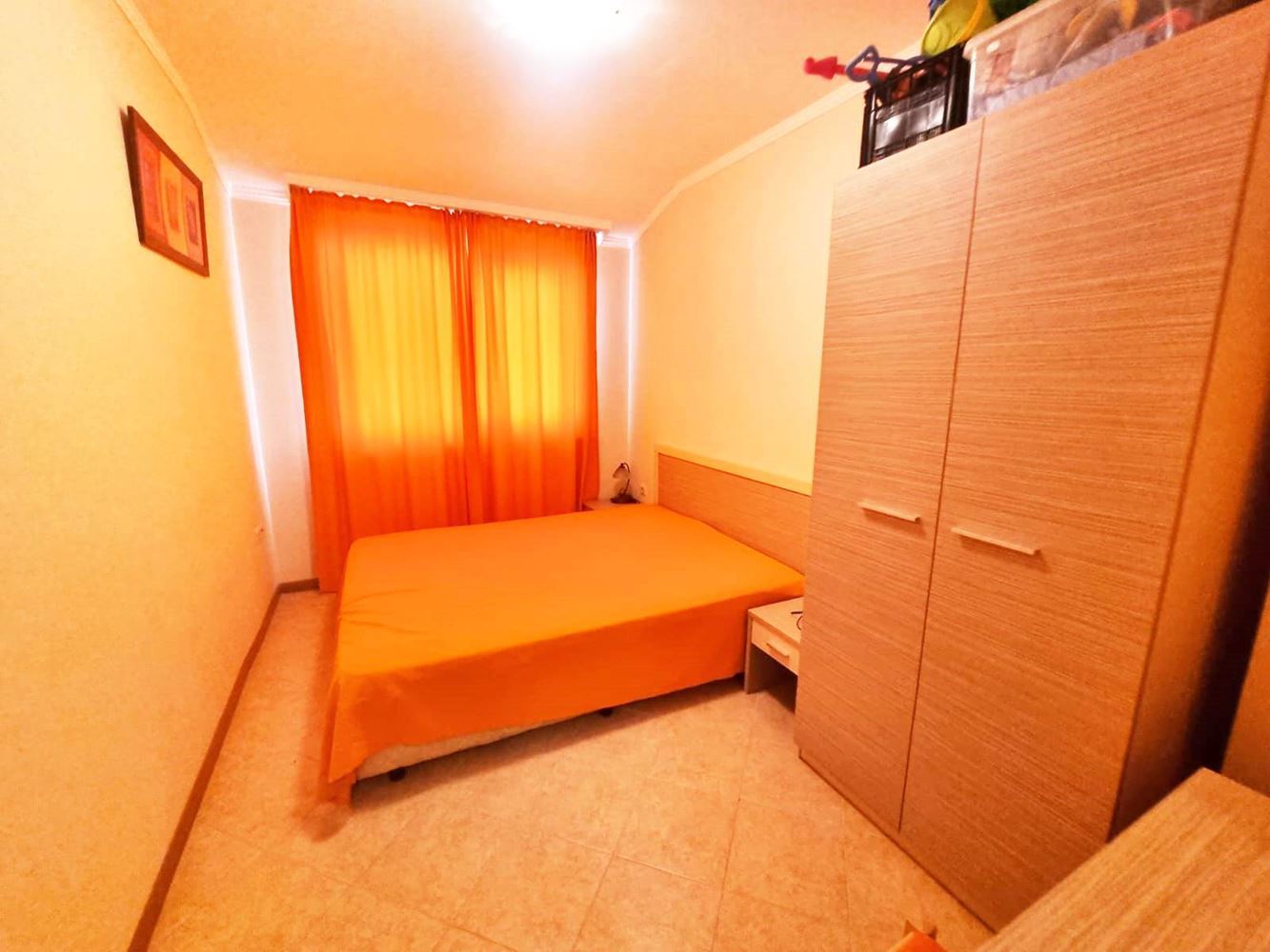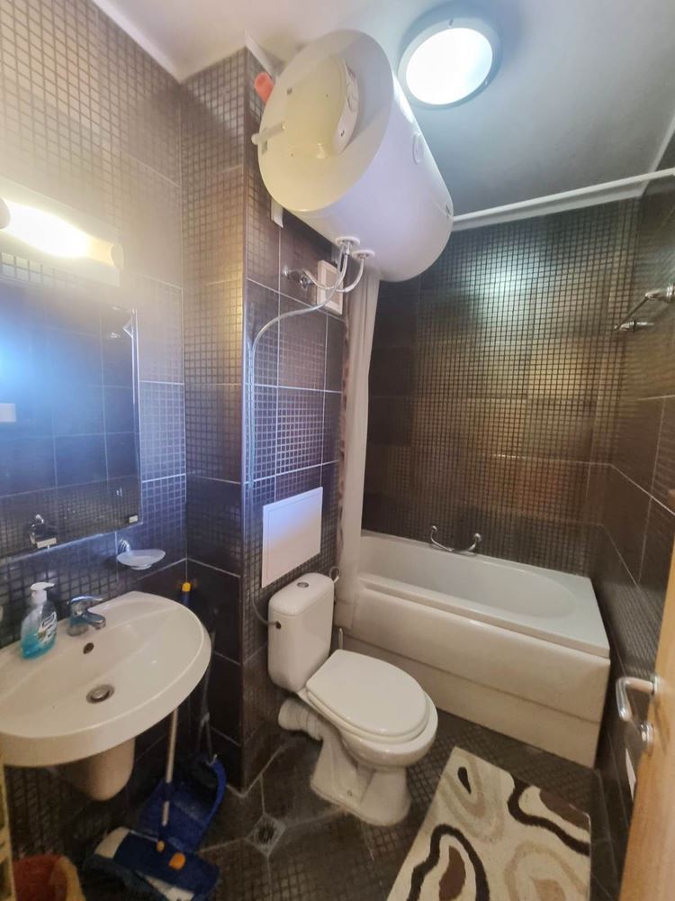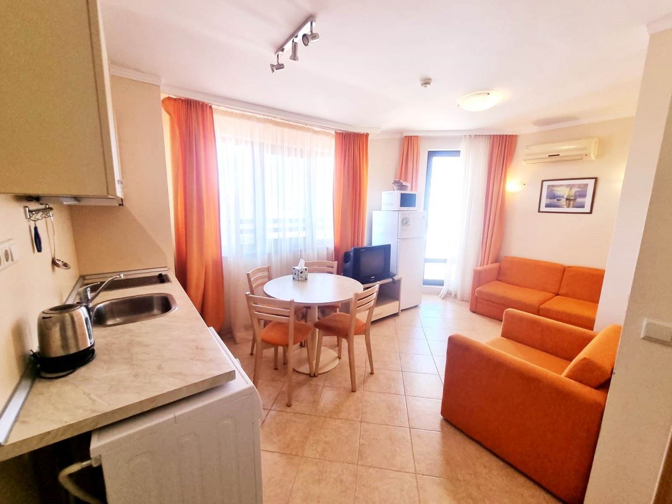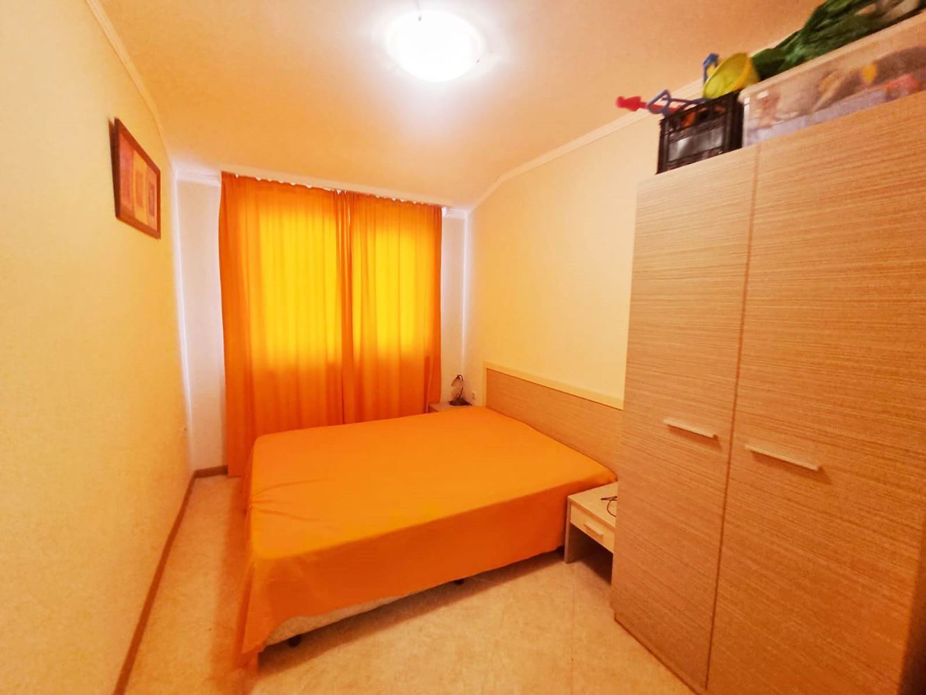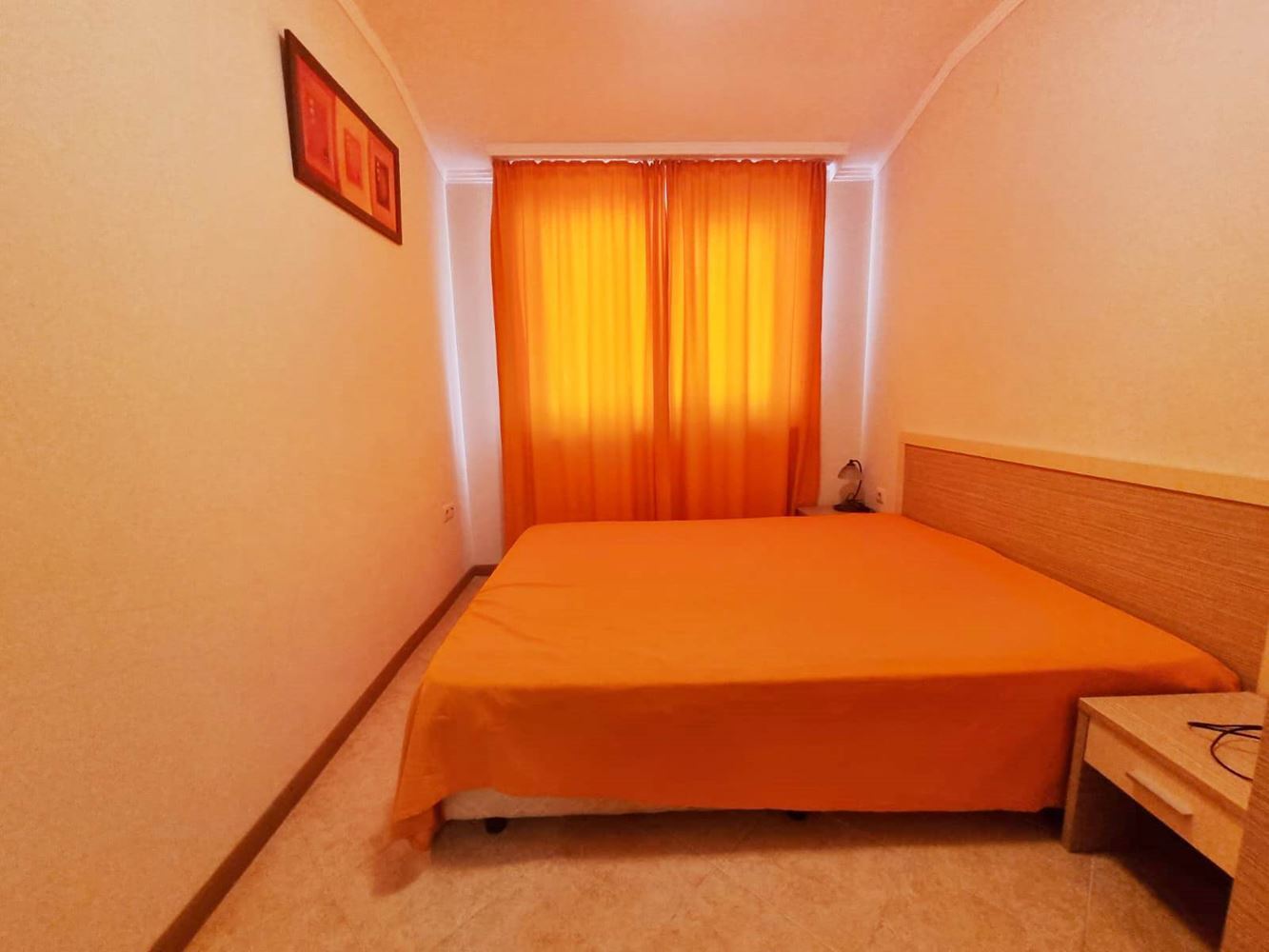 Beautiful one-bedroom apartment in a residential complex with controlled access, located near the centre of Sunny Beach, near the perennial coniferous park. The complex is located 400 m from the beach covered with golden sand. It is divided into several buildings, each with six floors. The size of the offered flats is 60m2 and consists of an entrance hall, living room with open plan kitchen, a bedroom, bathroom with toilet and a balcony. The complex has a reception, park area, three swimming pools, SPA centre, fitness, children's playground, medical centre, supermarket, parking. The complex has a restaurant and lobby bar offering Bulgarian and international cuisine and a cozy atmosphere. Guests can enjoy refreshing drinks and cocktails at the exotic cocktail bar on the lobby and pool level. There is 24-hour physical security and video surveillance on site.