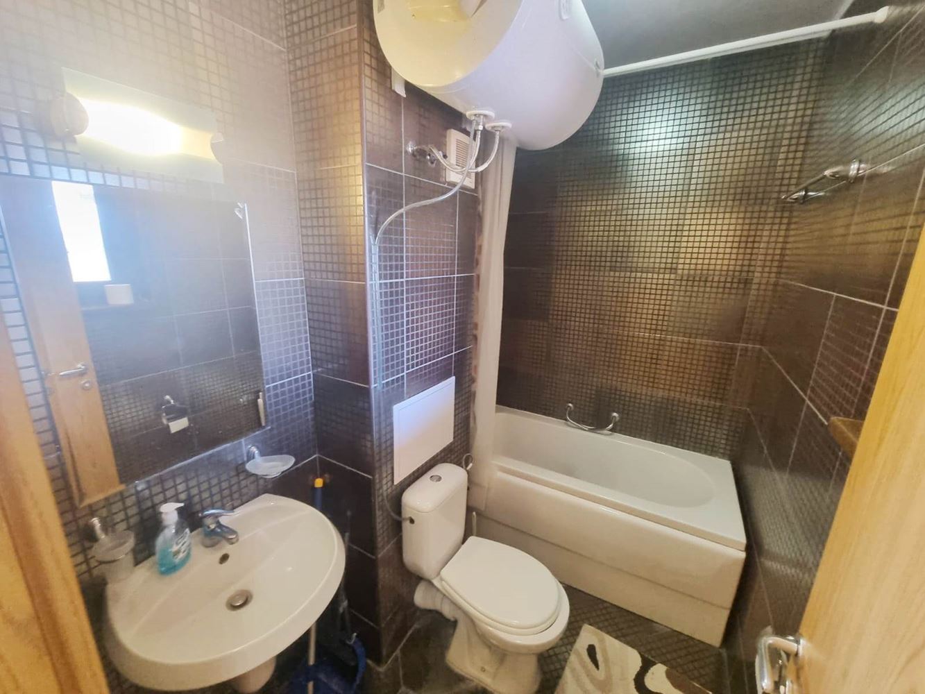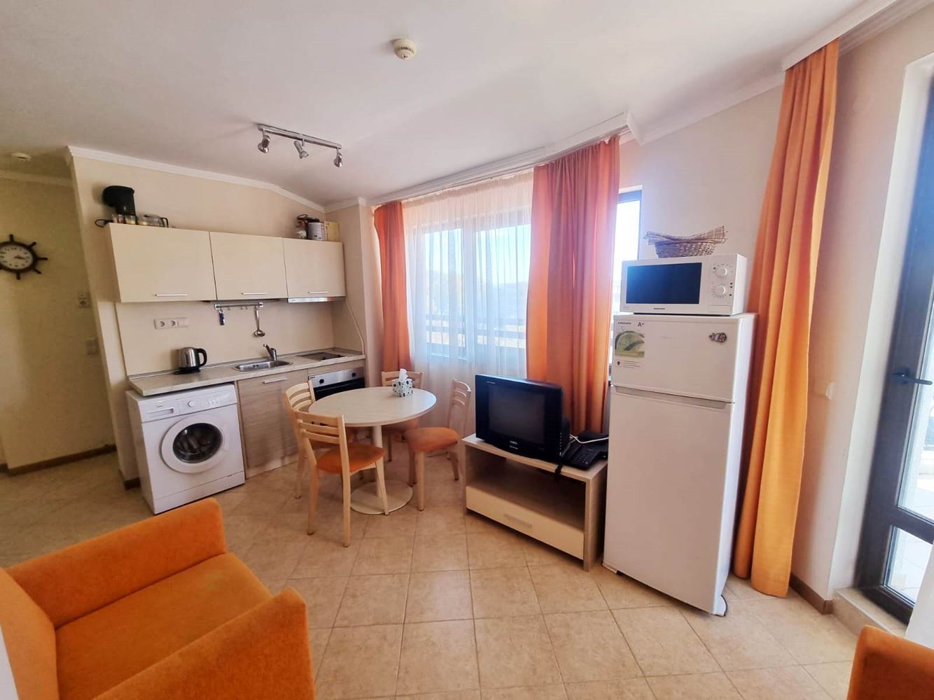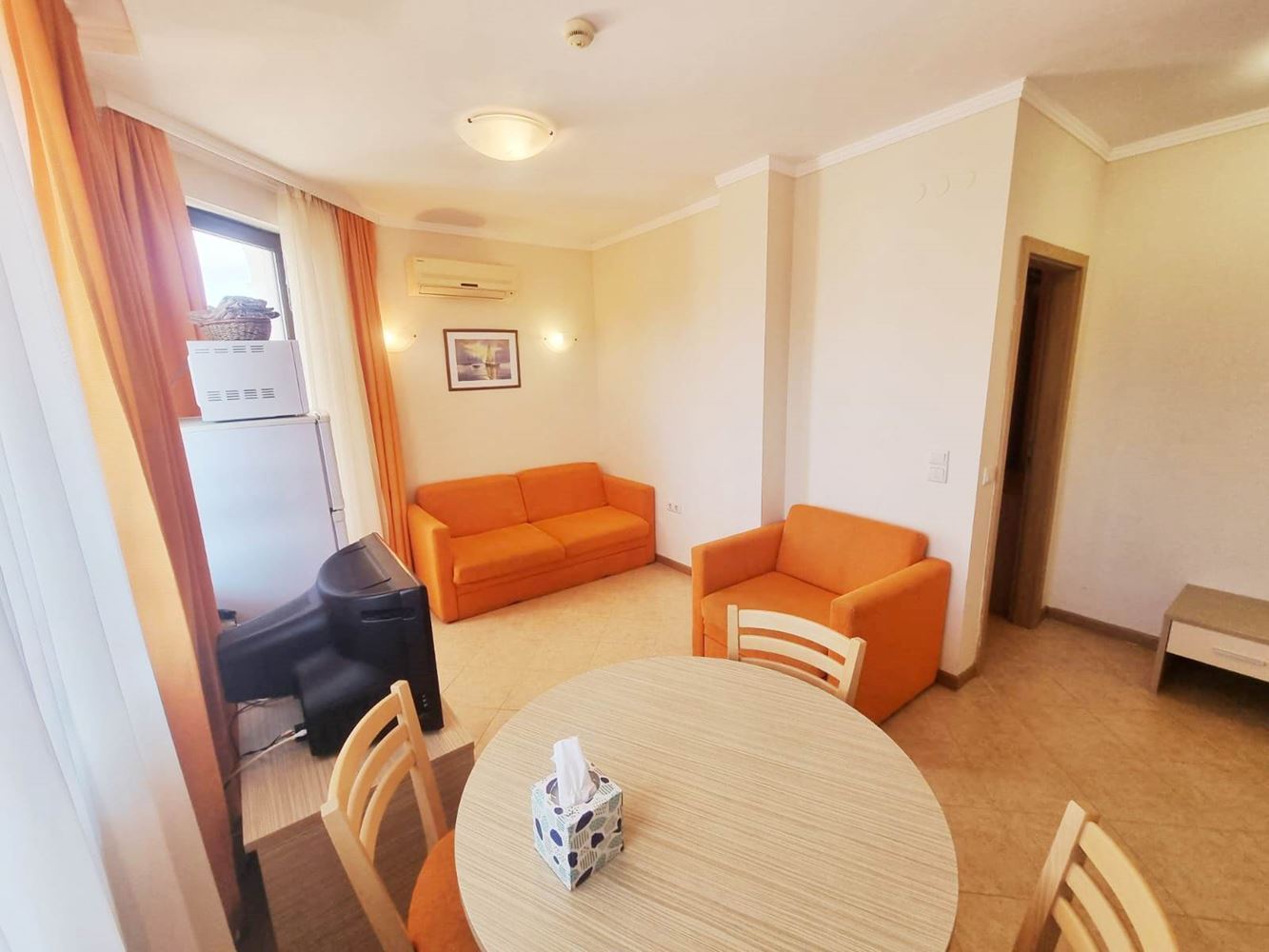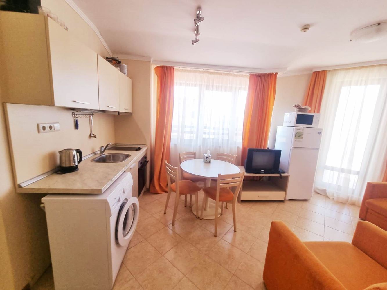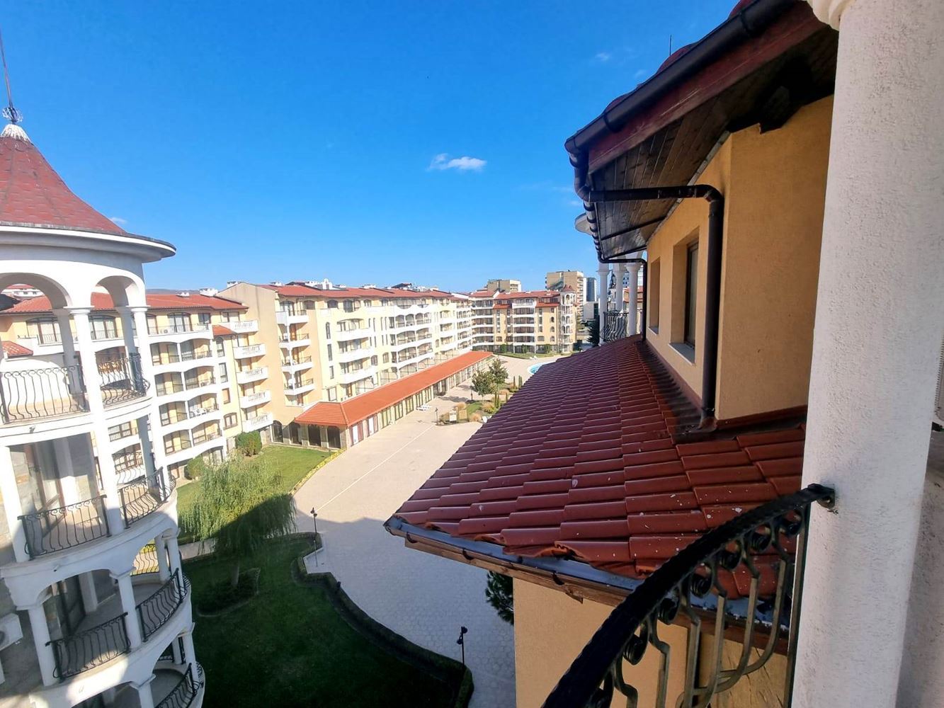 Beautiful one-bedroom apartment in a residential complex with controlled access, located near the centre of Sunny Beach, near the perennial coniferous park. The complex is located 400 m from the beach covered with golden sand. It is divided into several buildings, each with six floors. The size of the offered flats is 60m2 and consists of an entrance hall, living room with open plan kitchen, a bedroom, bathroom with toilet and a balcony. The complex has a reception, park area, three swimming pools, SPA centre, fitness, children's playground, medical centre, supermarket, parking. The complex has a restaurant and lobby bar offering Bulgarian and international cuisine and a cozy atmosphere. Guests can enjoy refreshing drinks and cocktails at the exotic cocktail bar on the lobby and pool level. There is 24-hour physical security and video surveillance on site.