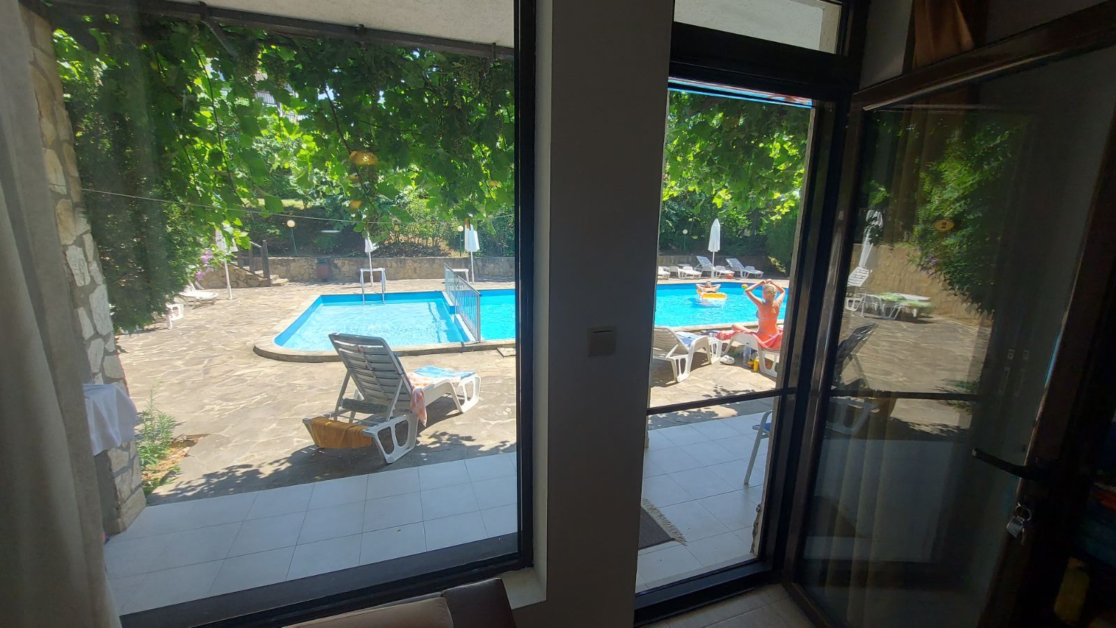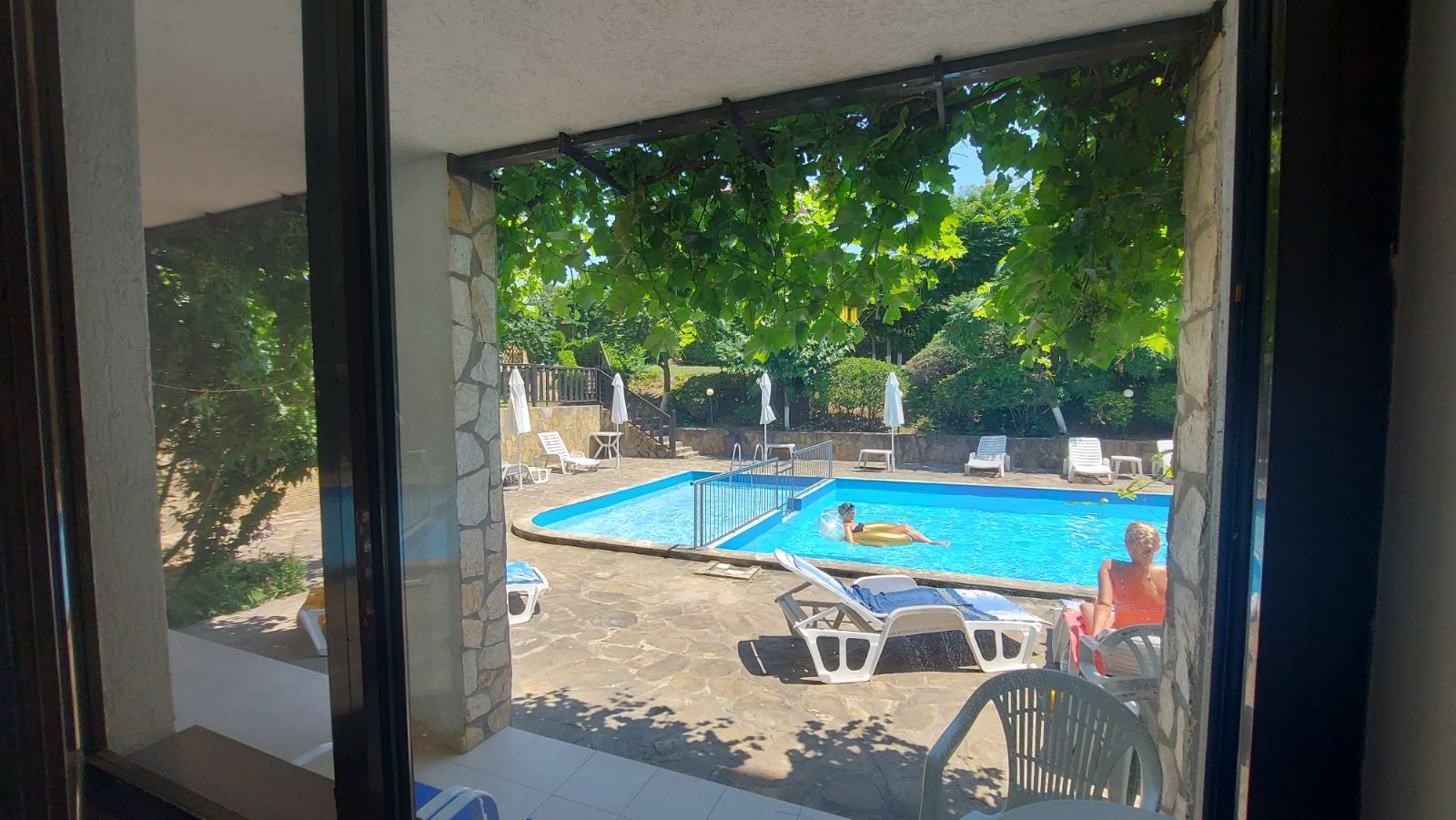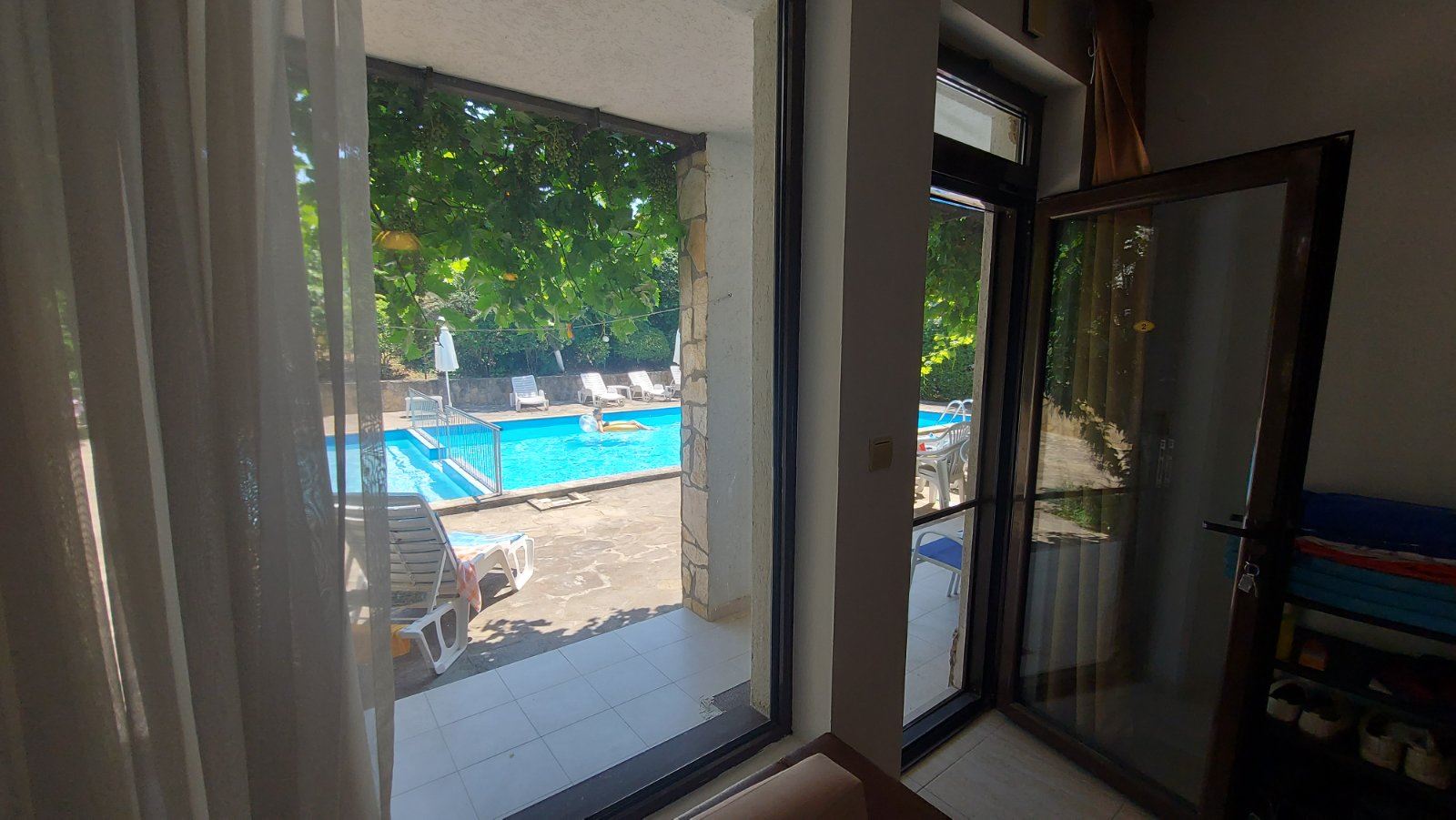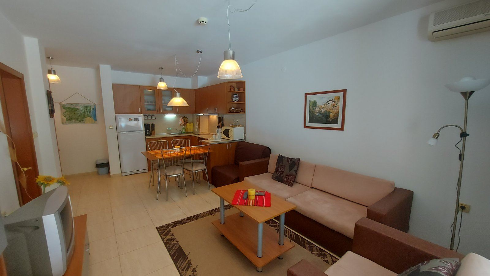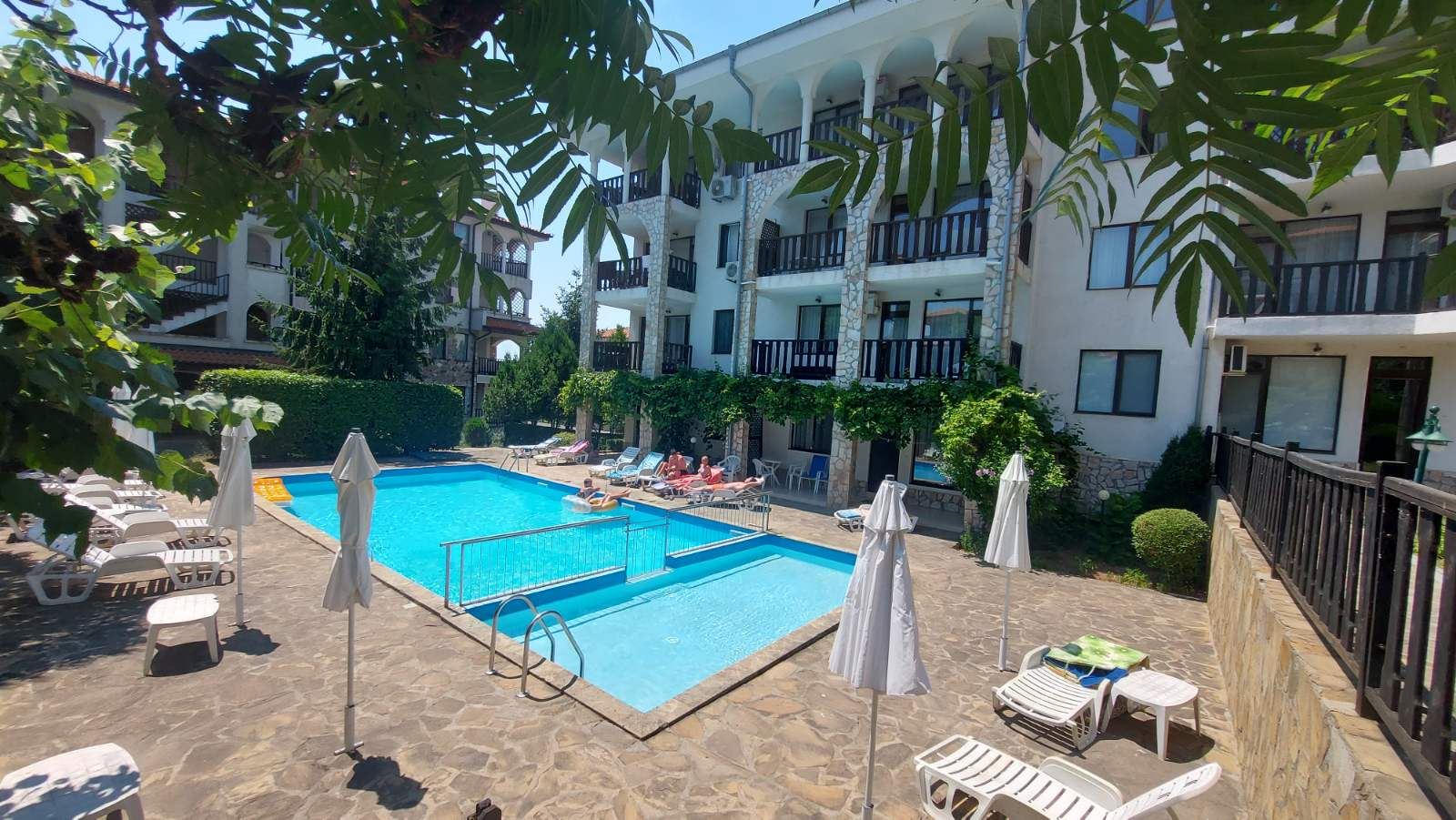 For sale one bedroom apartment in the prestigious resort of Sveti Vlas, located on the ground floor with direct access to the pool. The apartment has a total area of 62 m2 and offers a functional layout, including a spacious living room with kitchenette, a cozy bedroom, bathroom and a terrace where you can enjoy your morning coffee overlooking the pool. The apartment comes fully furnished, allowing for immediate move-in or rental. The interior is filled with style and attention to detail, creating a cozy and comfortable atmosphere.