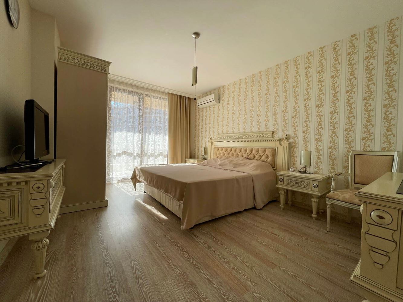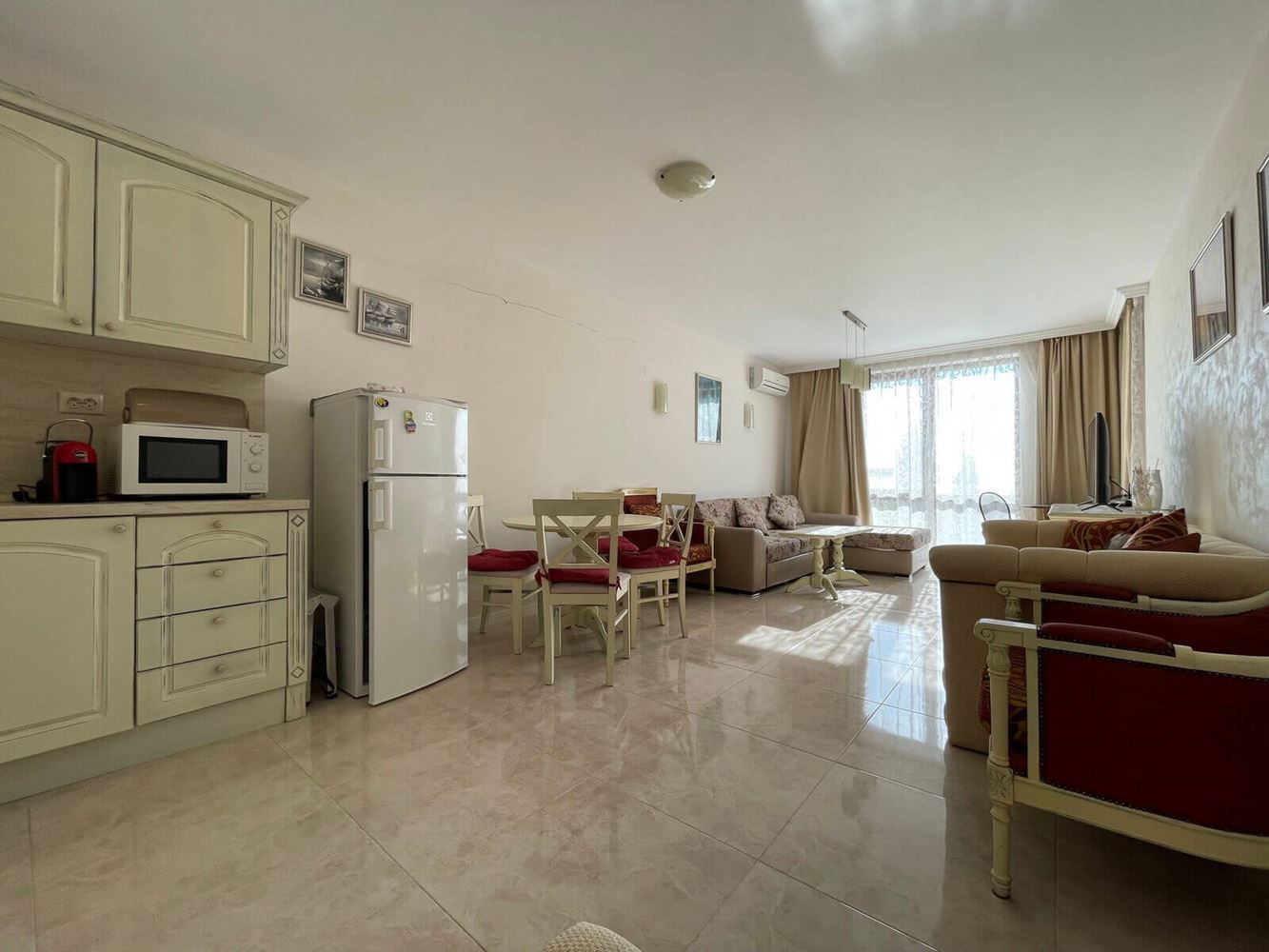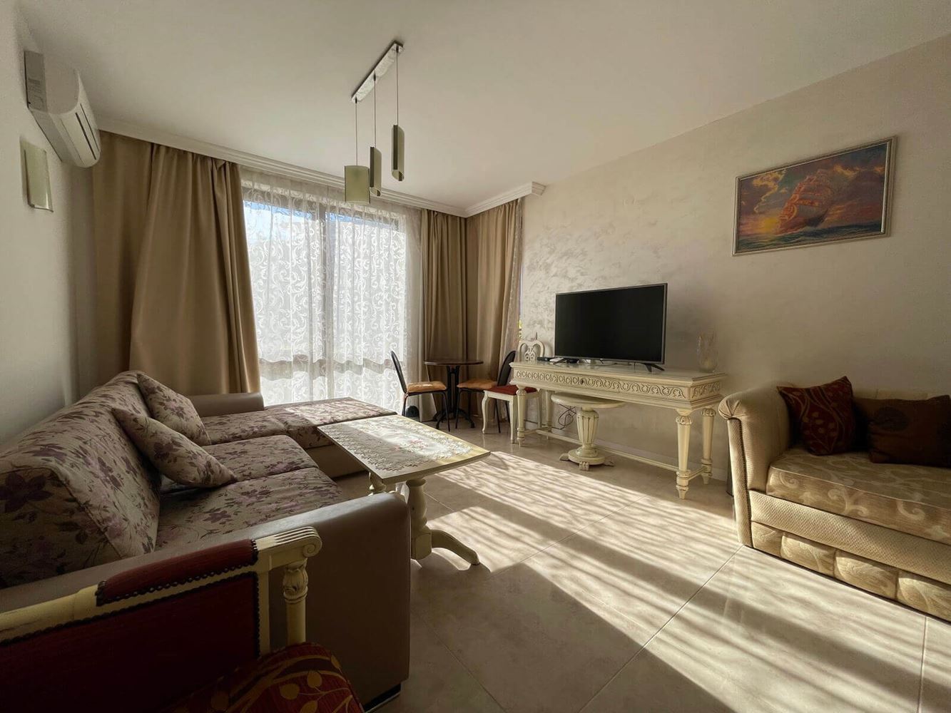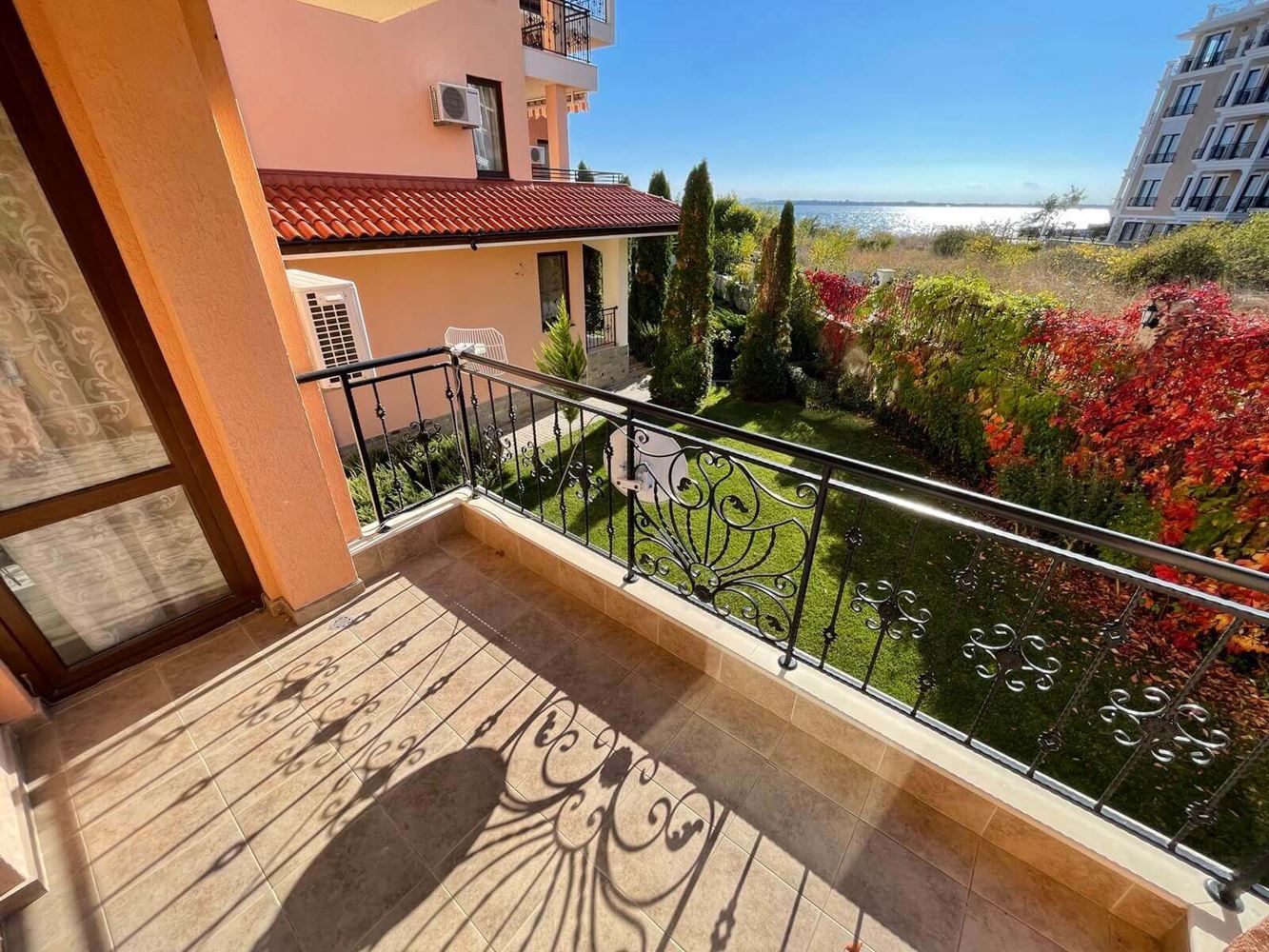 One bedroom flat with beautiful sea view in St. Vlas in an amazing modern complex on the first line of the beach. The flat with area of 78 sq. m. is located on the ground floor. Flat layout is as follows - entrance hall, living room with kitchen area, bedroom, bathroom with WC and balcony with beautiful sea view. The flat is fully furnished and equipped, ready to move in or rent out. The complex is an exclusive luxury project, characterized by the highest quality of construction, finishes and interior design. The infrastructure of the complex provides a complete holiday without the problems of everyday life, allowing you to enjoy the benefits of modern civilization.