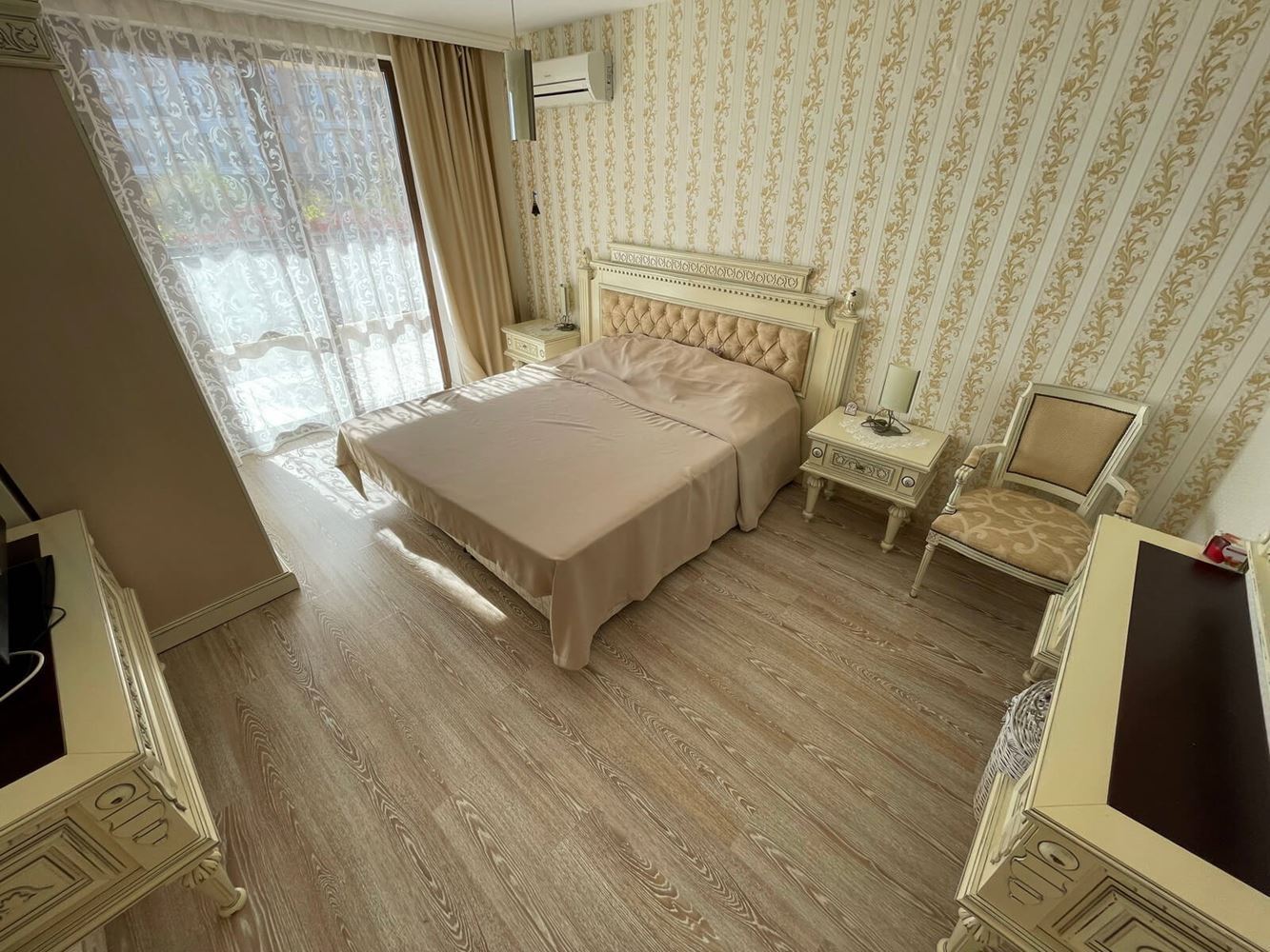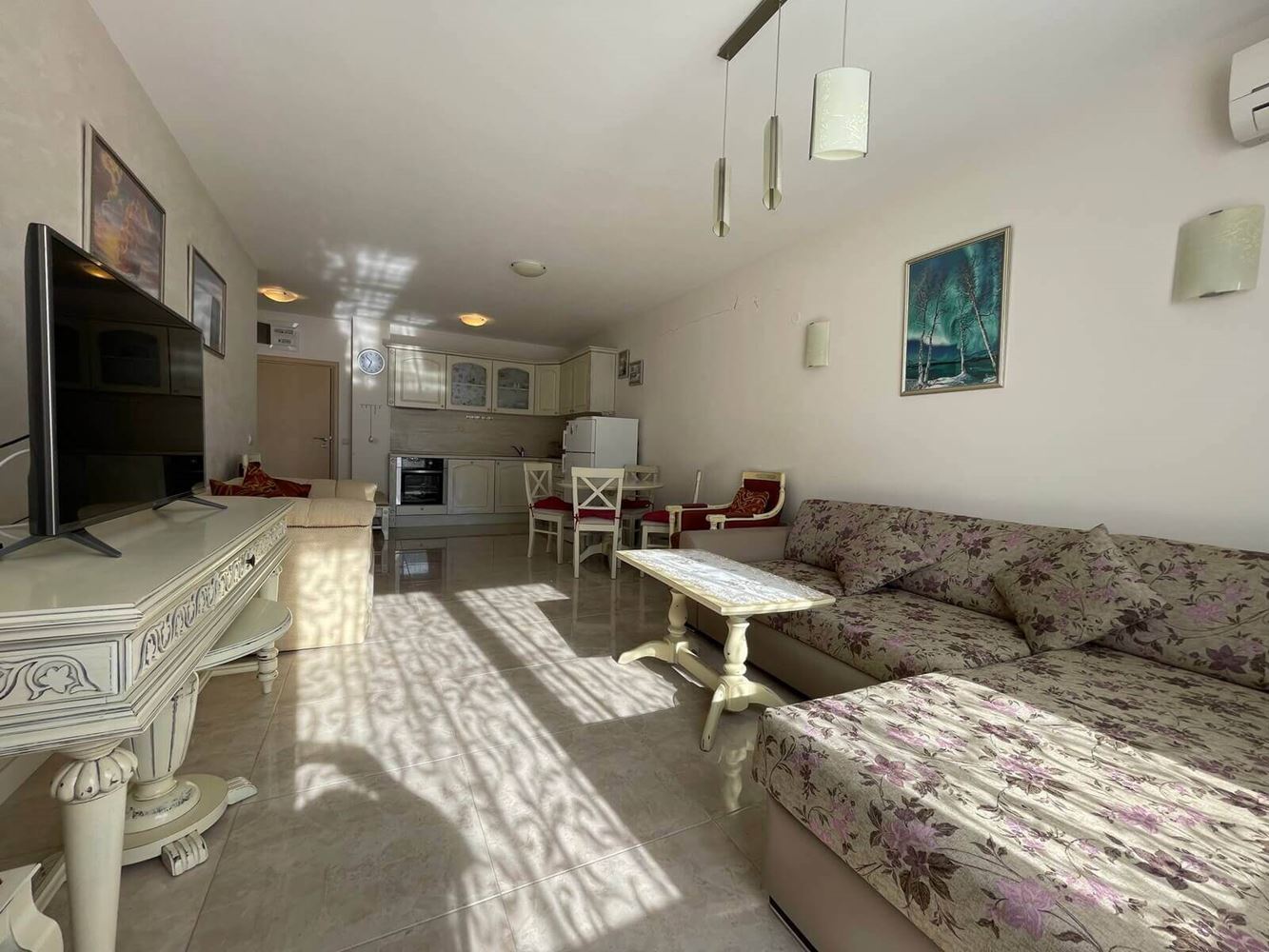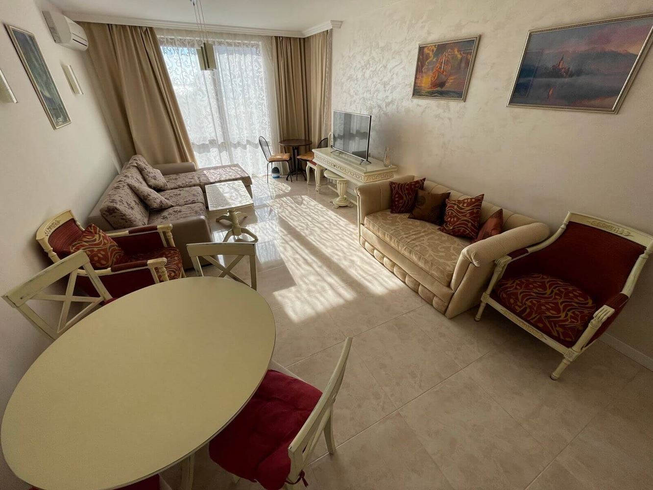 One bedroom flat with beautiful sea view in St. Vlas in an amazing modern complex on the first line of the beach. The flat with area of 78 sq. m. is located on the ground floor. Flat layout is as follows - entrance hall, living room with kitchen area, bedroom, bathroom with WC and balcony with beautiful sea view. The flat is fully furnished and equipped, ready to move in or rent out. The complex is an exclusive luxury project, characterized by the highest quality of construction, finishes and interior design. The infrastructure of the complex provides a complete holiday without the problems of everyday life, allowing you to enjoy the benefits of modern civilization.