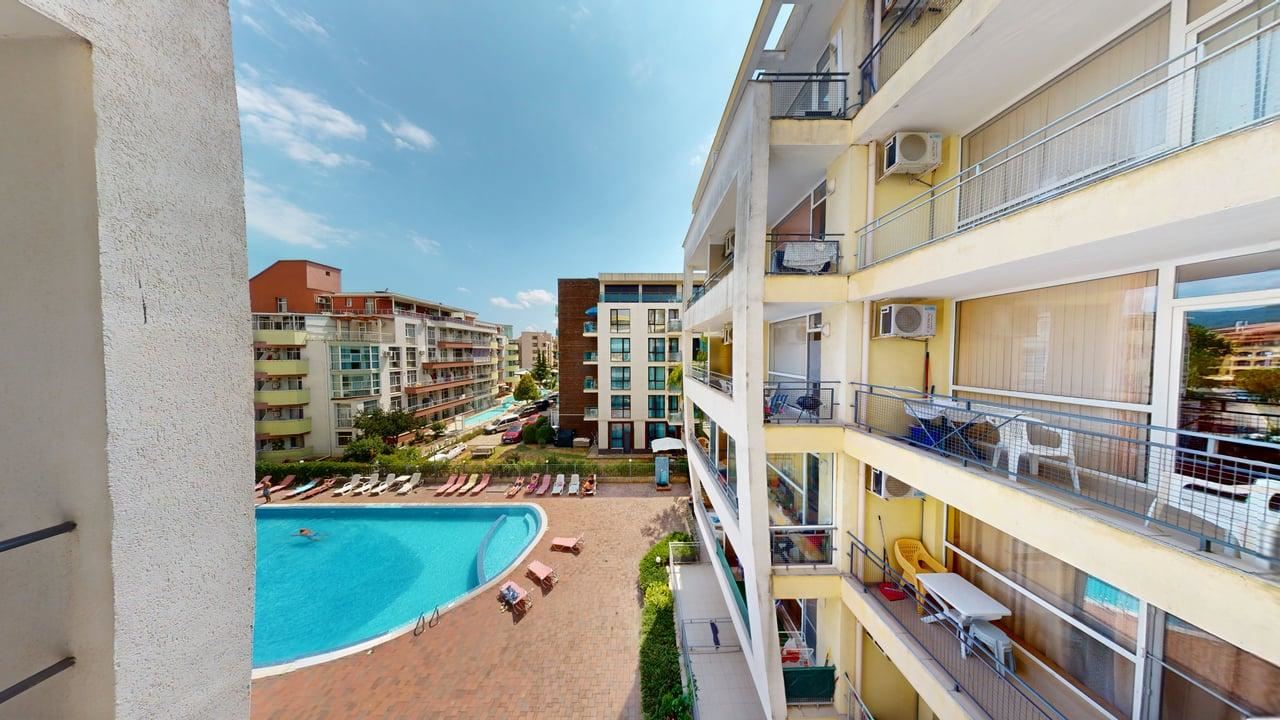 We offer for sale a spacious and cozy one-bedroom apartment, located on the fourth floor of a well-maintained building with an elevator in the heart of Sunny Beach. The property impresses with a pleasant view of the pool, which can be enjoyed from your private balcony – the perfect place to relax. The apartment has a functional layout: a living room with a kitchen area, a separate bedroom, a bathroom with WC, and a balcony overlooking the pool. Suitable both for personal use and vacation, as well as for investment with rental potential.