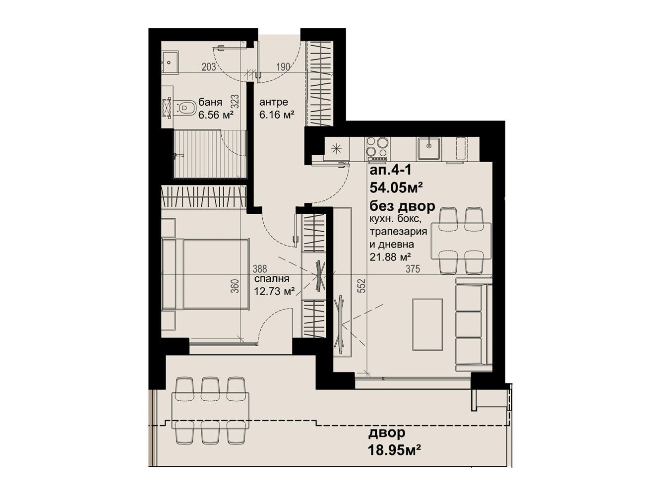 We present to you an exceptionally attractive two-bedroom apartment in a new residential complex in Burgas, Horizon district – the first and only development of its kind in Bulgaria with a warm direct connection to the Grand Plaza Mall. The property is located on the ground floor with a total area of 82 m² and a private landscaped garden of 19.70 m² – an ideal space for morning coffee, a relaxation zone, or a cozy corner for children and pets.