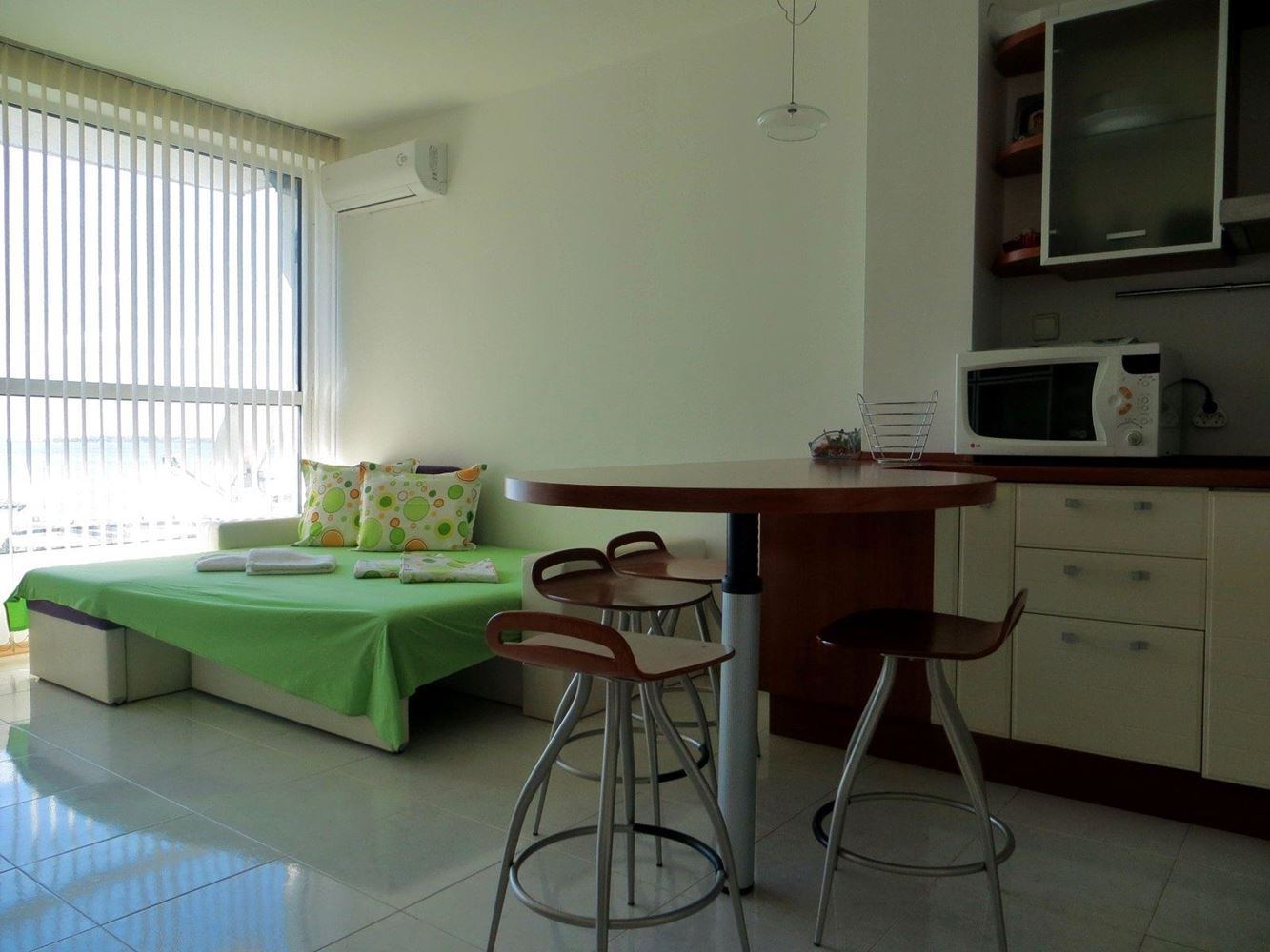 One bedroom apartment with sea view, located in the central part of the resort town of Sveti Vlas, is a great opportunity for a comfortable vacation and even permanent residence on the Black Sea coast. The apartment is located on the second line of the sea, which provides proximity to the beach and beautiful sea scenery. The St. Vlas area is known for its natural beauty, abundance of greenery and clean sea. It is an ideal place for a secluded vacation and close contact with nature. The complex in which the apartment is located provides a variety of amenities such as swimming pool, separate pool for children, sunbathing and relaxation areas, barbecue facilities and closed parking lot. There are restaurants, cafes, grocery stores and pharmacies in close proximity to the complex, making life here convenient and comfortable. The apartment provides spacious and bright rooms with views of the marina, pool and the city, making your stay particularly enjoyable.
