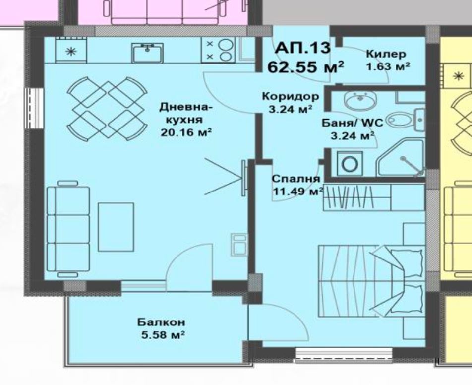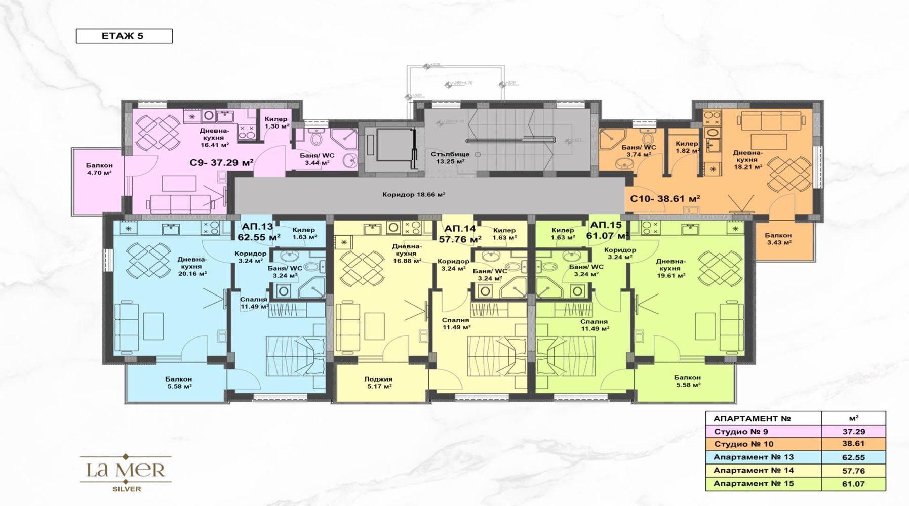 The apartment, with a total area of 62.55 m² on the fifth floor, is offered fully finished ("turnkey"). It features REHAU PVC windows, granite staircases with wrought iron railings, and balcony railings made of wrought iron. The property showcases modern architecture, stylish design of the building and common areas, and functional layouts. Best of all – no maintenance fee!